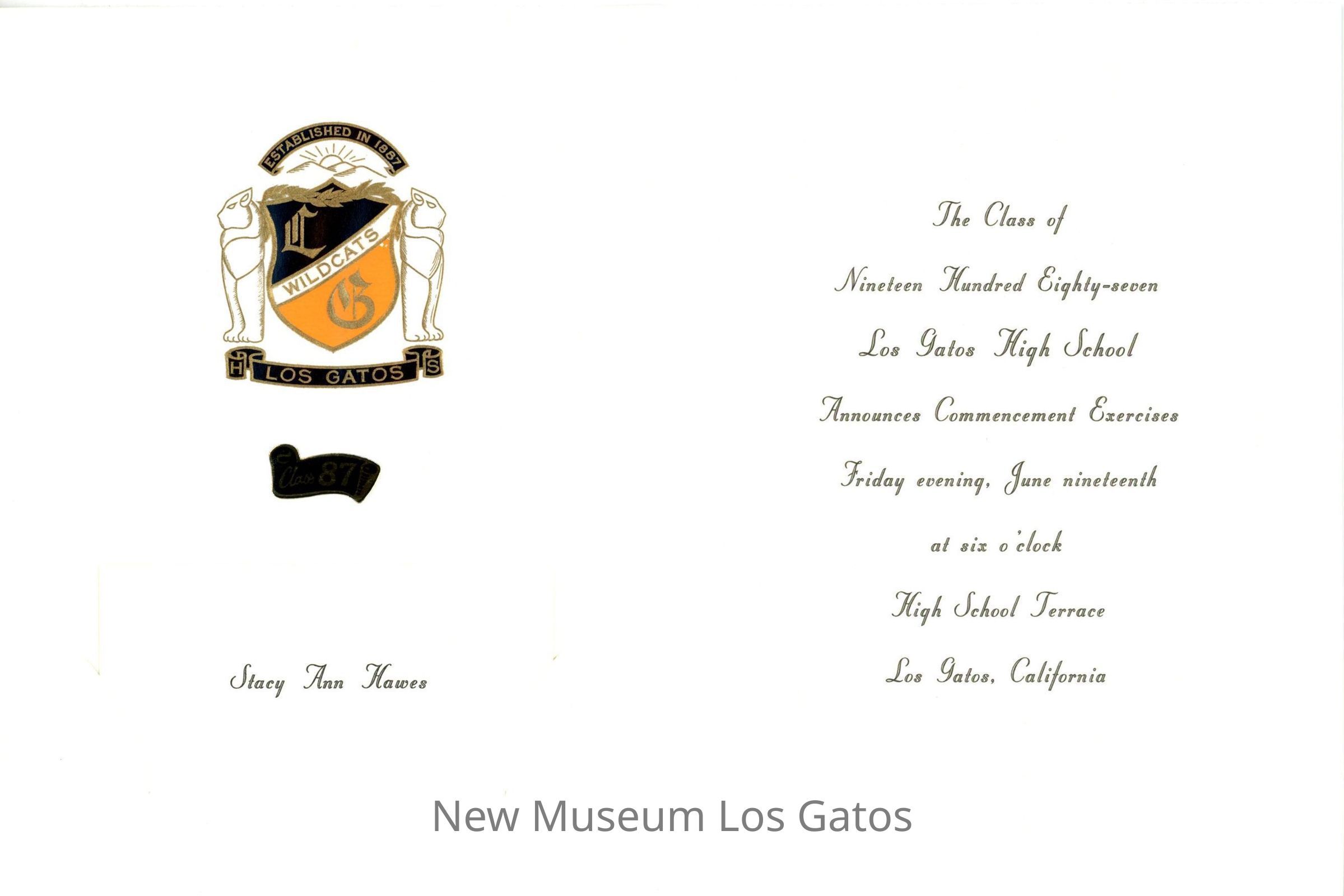 A bi-folded invitation to the commencement ceremony for Los Gatos High School's Class of 1987. The front features an illustration of the school, with an embossed '1987,' while the inside features the school logo, the name of the graduate, as well as the time and date information for the ceremony.Collection