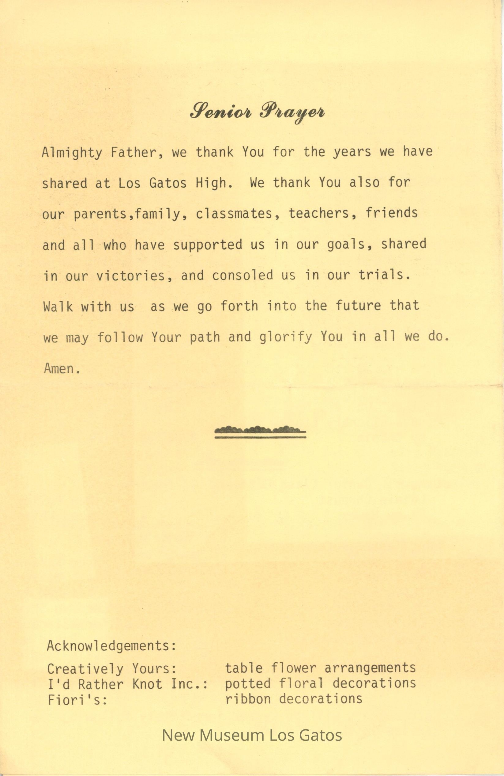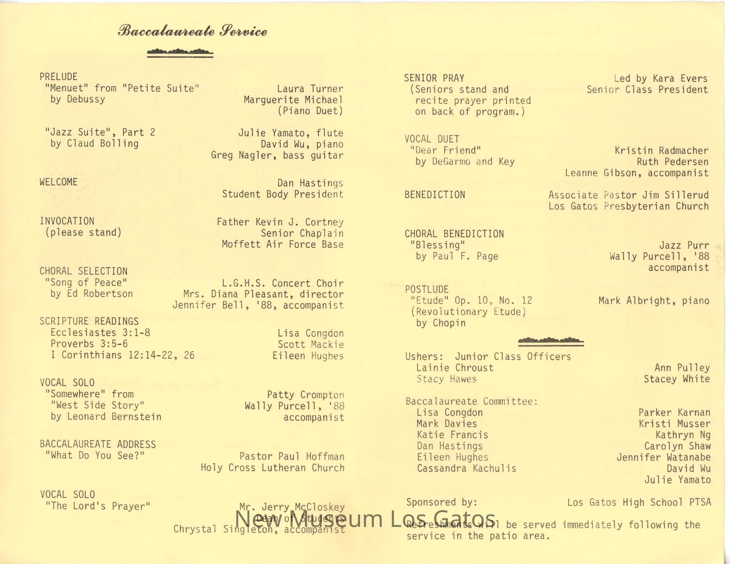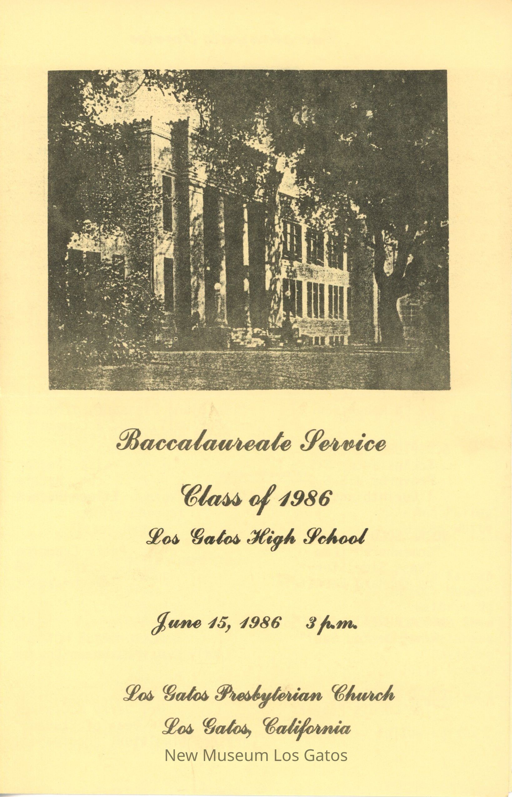 A bi-folded program for Los Gatos High School's Class of 1986 Baccalaureate Service, which took place at the Los Gatos Presbyterian Church. The light tan paper features a black-and-white photograph of the high school on the front, with the program schedule listed inside.Collection