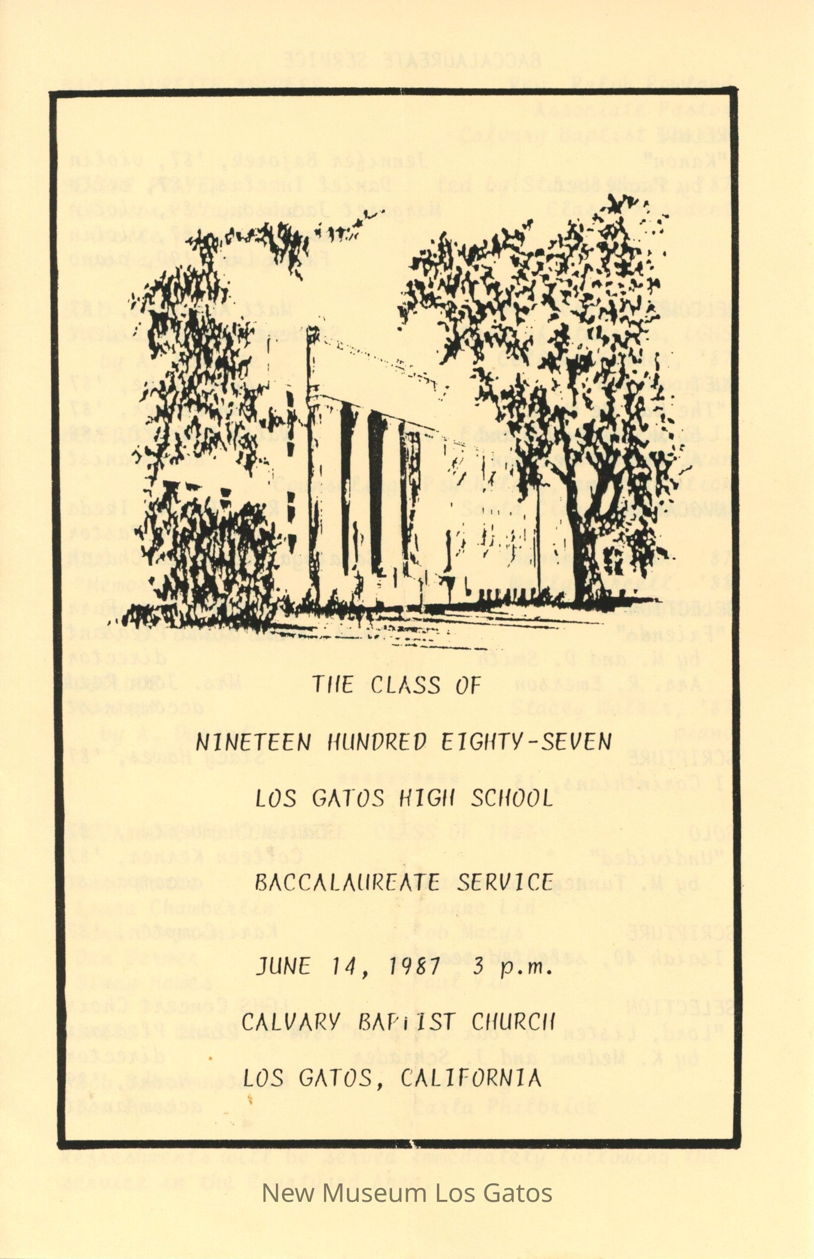 A bi-folded program for Los Gatos High School's Class of 1987 Baccalaureate Service, which took place at the Calvary Baptist Church in Los Gatos. The light tan paper features a black-and-white illustration of the high school facade on the front, with the program schedule listed inside.Collection