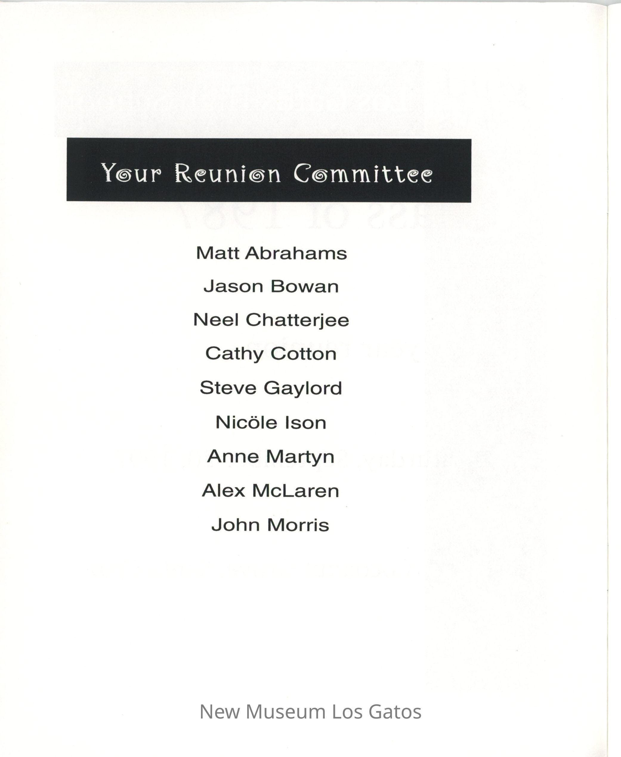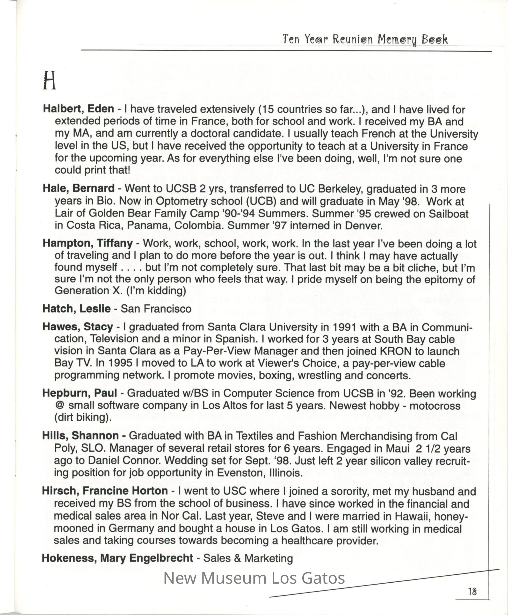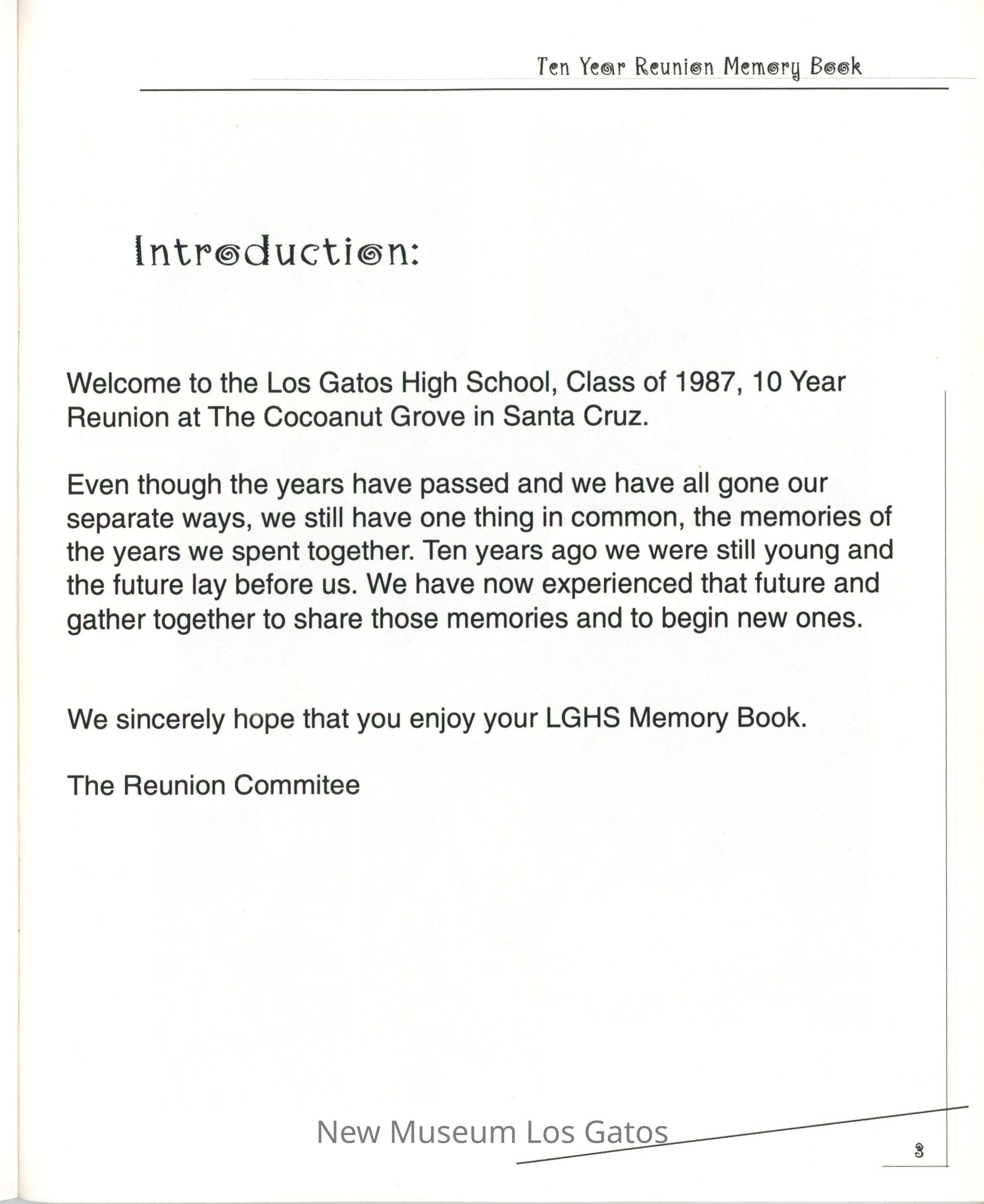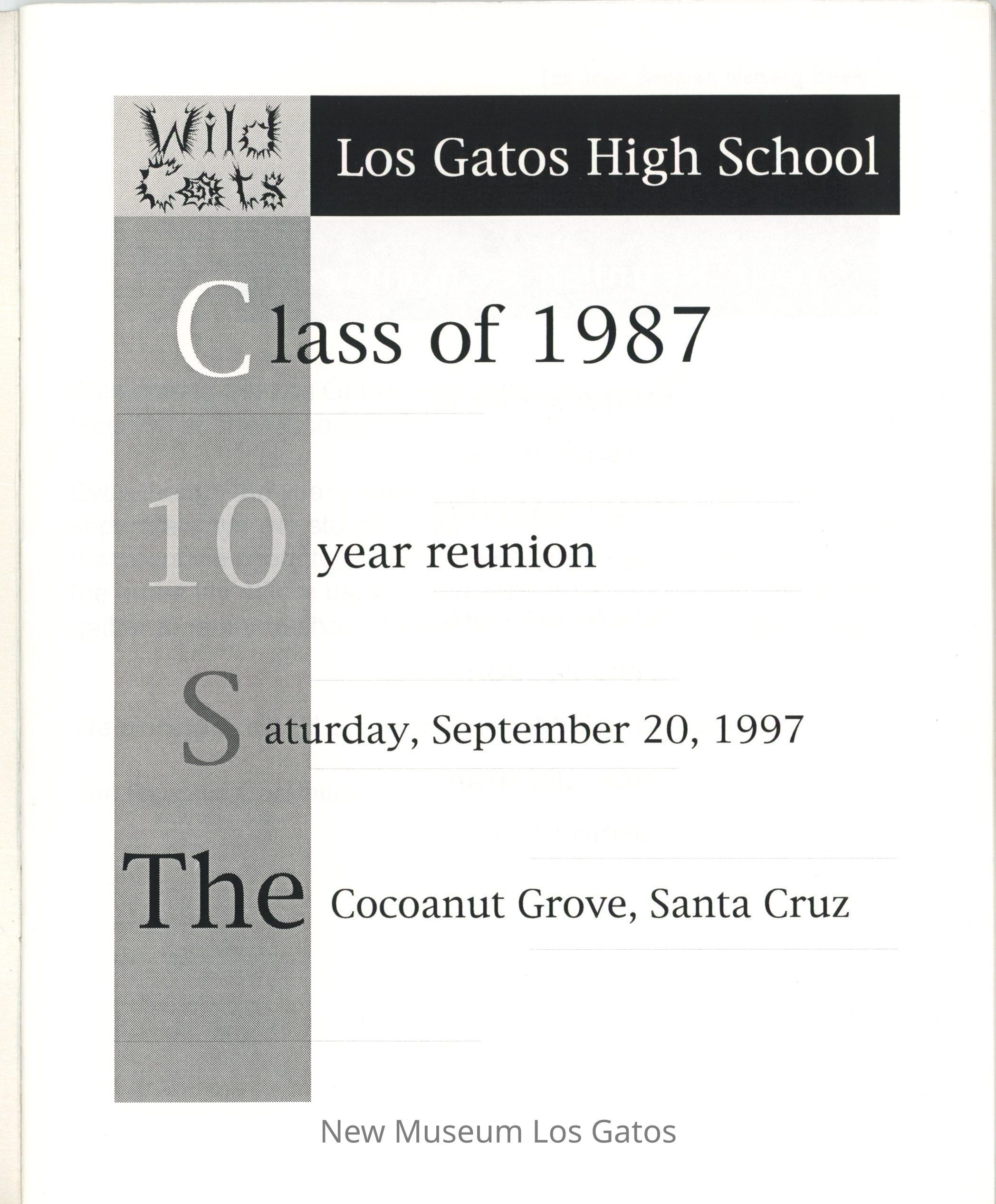 A booklet with updates from the members of the Los Gatos High School Class of 1987 from their ten year high school reunion on September 20, 1997. The booklet consists of typed updates along with collages of black and white photographs.Collection