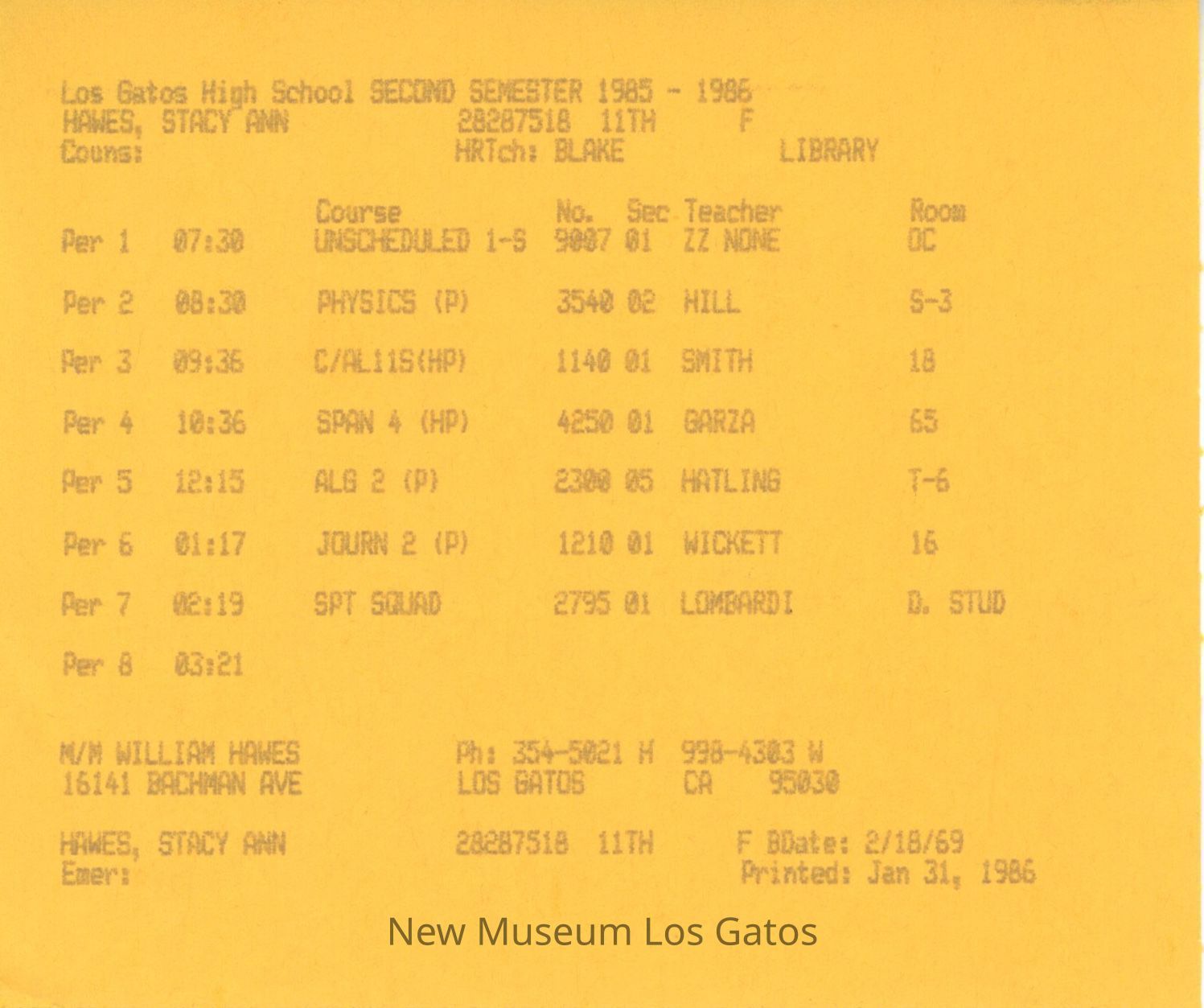 A dark yellow/gold half sheet of paper, upon which Stacy's class schedule is printed. The information includes the class titles, periods, instructors, and rooms.Creator