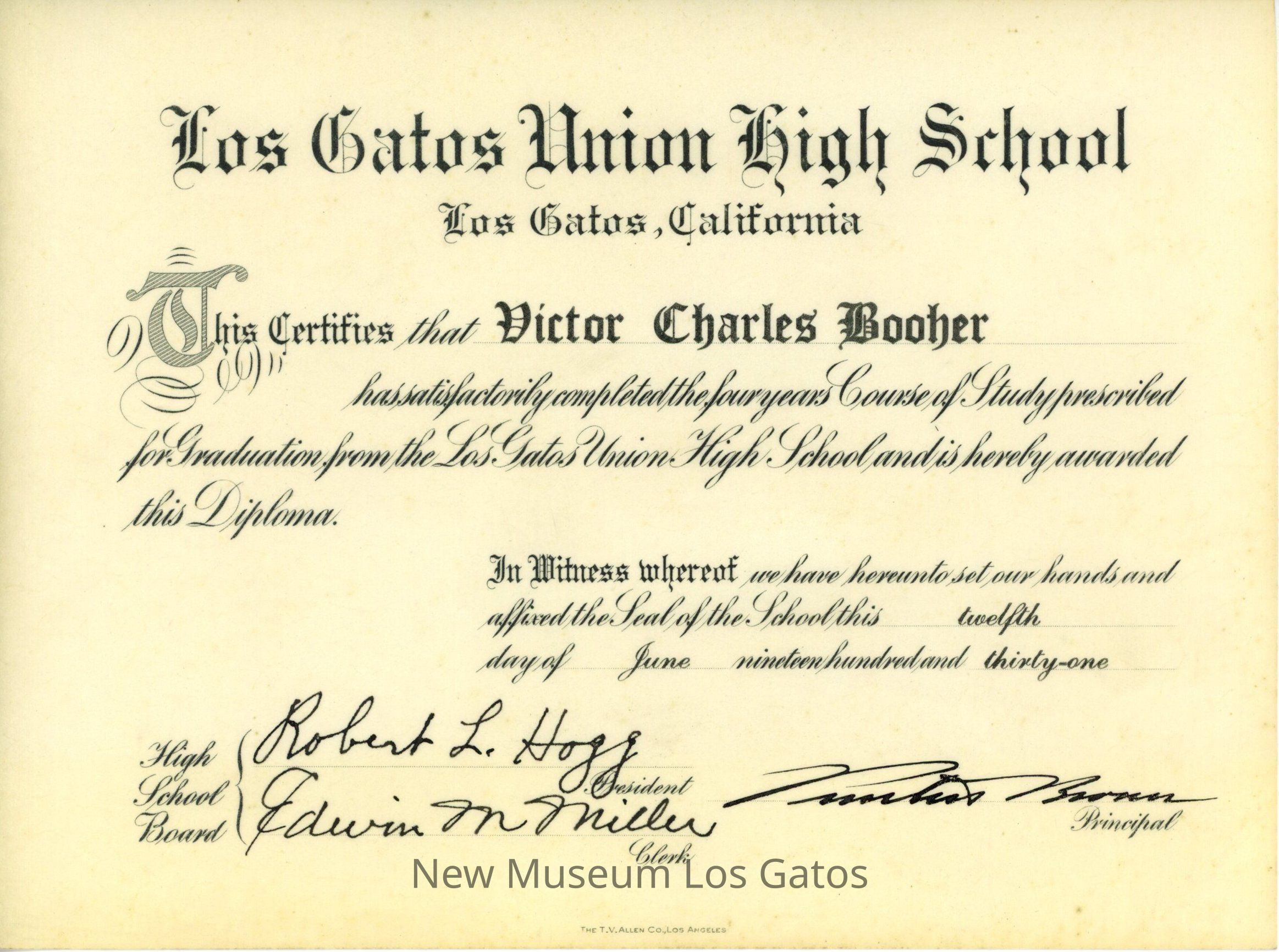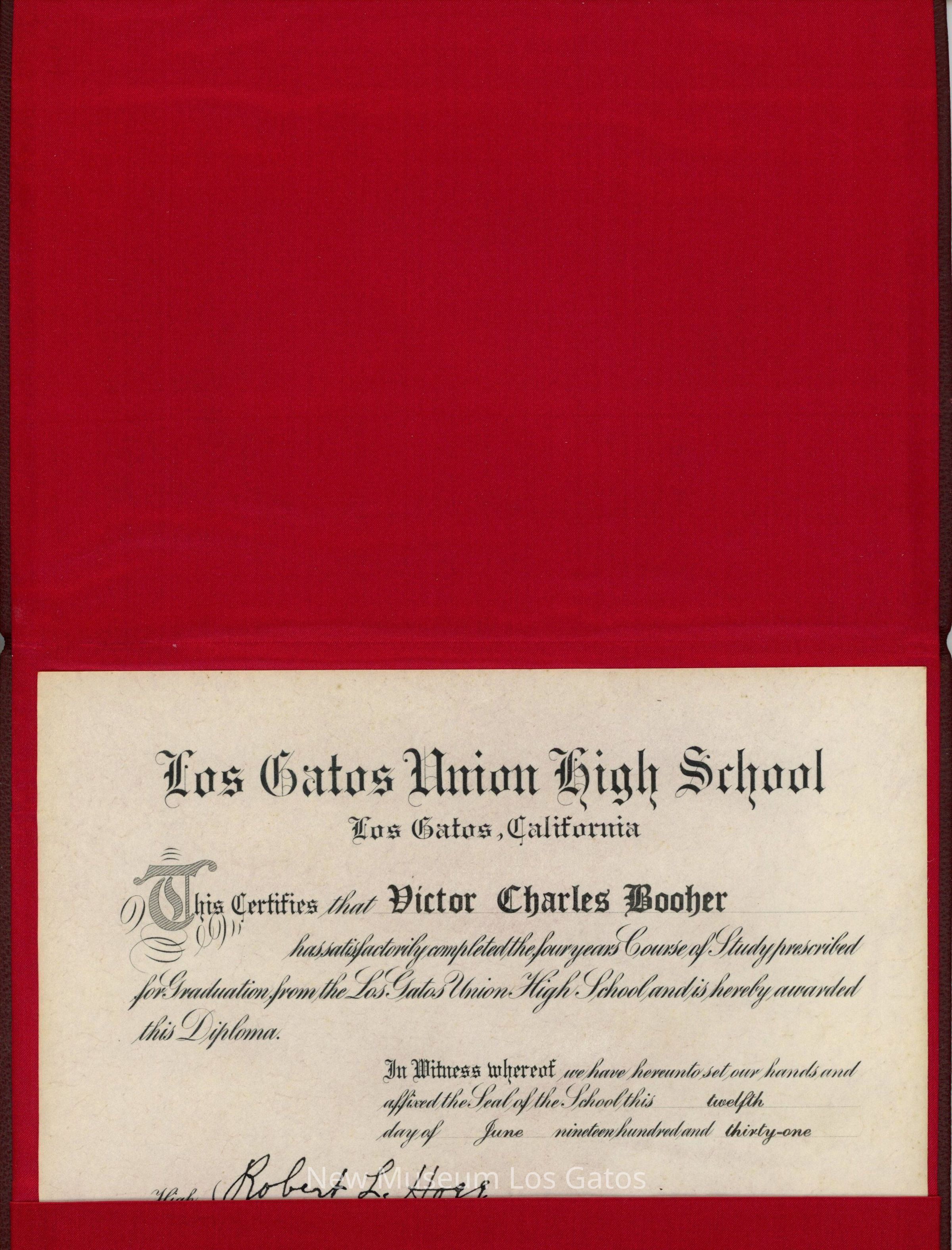 Los Gatos Union High School Los Gatos, California This Certifies that Victor Charles Booher has satisfactorily completed the four years Course of Study prescribed for Graduation from the Los Gatos Union High School and is hereby awarded this Diploma. In Witness whereof we have hereunto set our hands and affixed the Seal of the School this twelfth day of June nineteen hundred and thirty-one