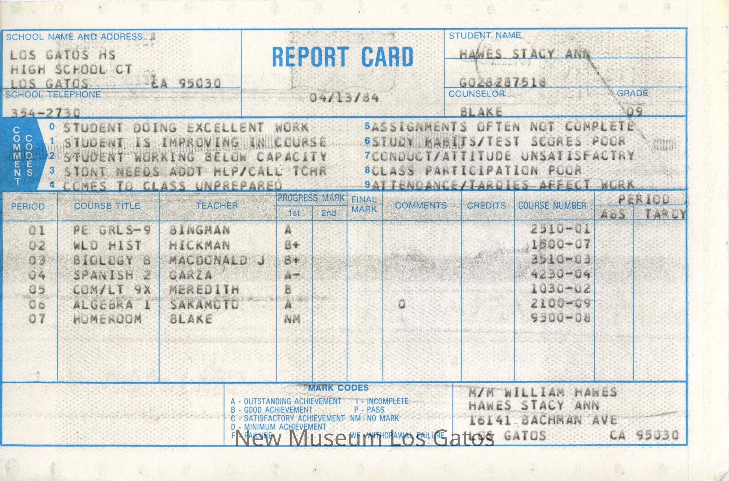 A single, half sheet of paper with Stacy Hawes' grade progress in her second semester of 9th grade at Los Gatos High School.