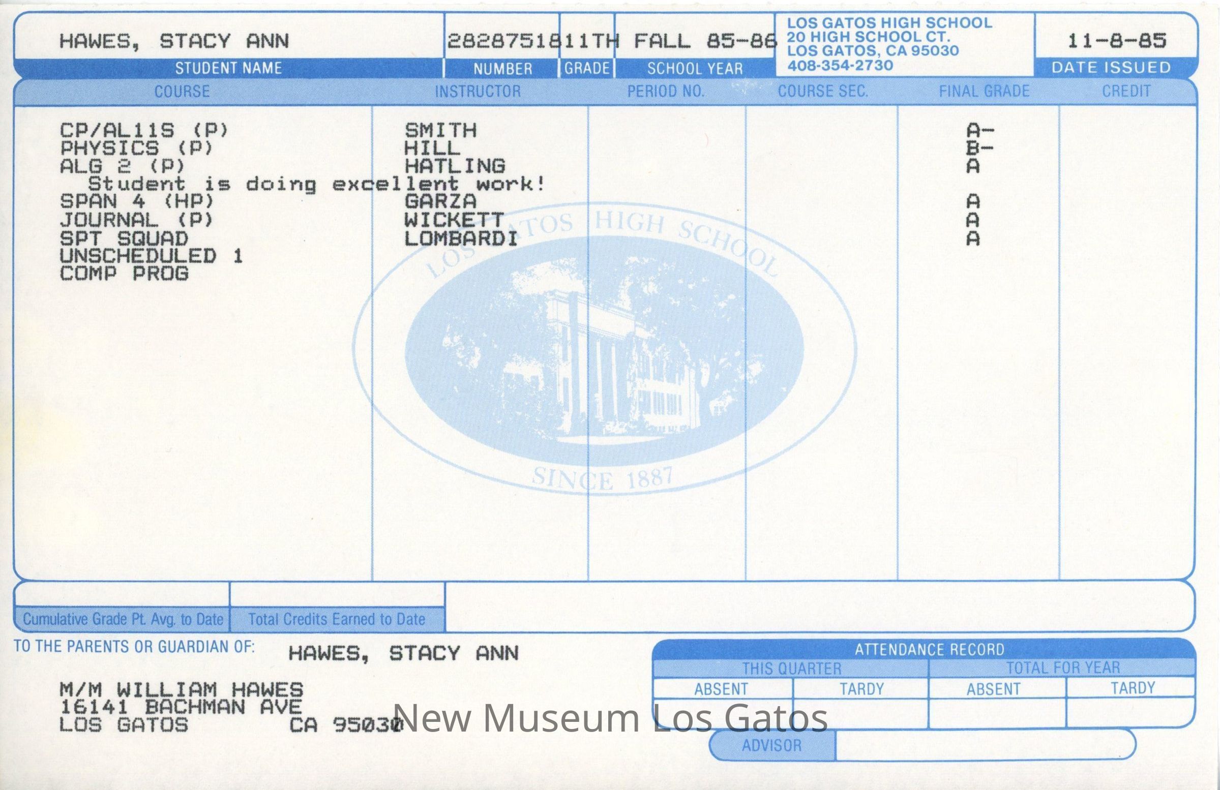 A single, half sheet of paper with Stacy Hawes' grades in her first semester of 11th grade at Los Gatos High School. The pre-printed boxes and information is blue, while the typed information relevant to Stacy is in black ink.