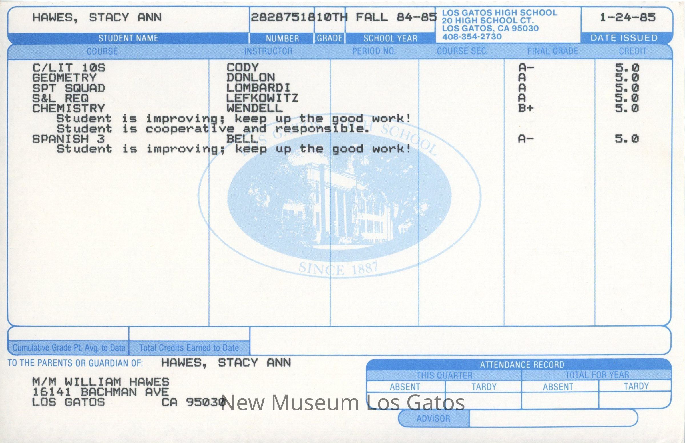 A single, half sheet of paper with Stacy Hawes' grades in her first semester of 10th grade at Los Gatos High School. On the original, the pre-printed boxes and information is blue, while the typed information relevant to Stacy is in black ink. On the copy, everything is black or grayscale.Creator