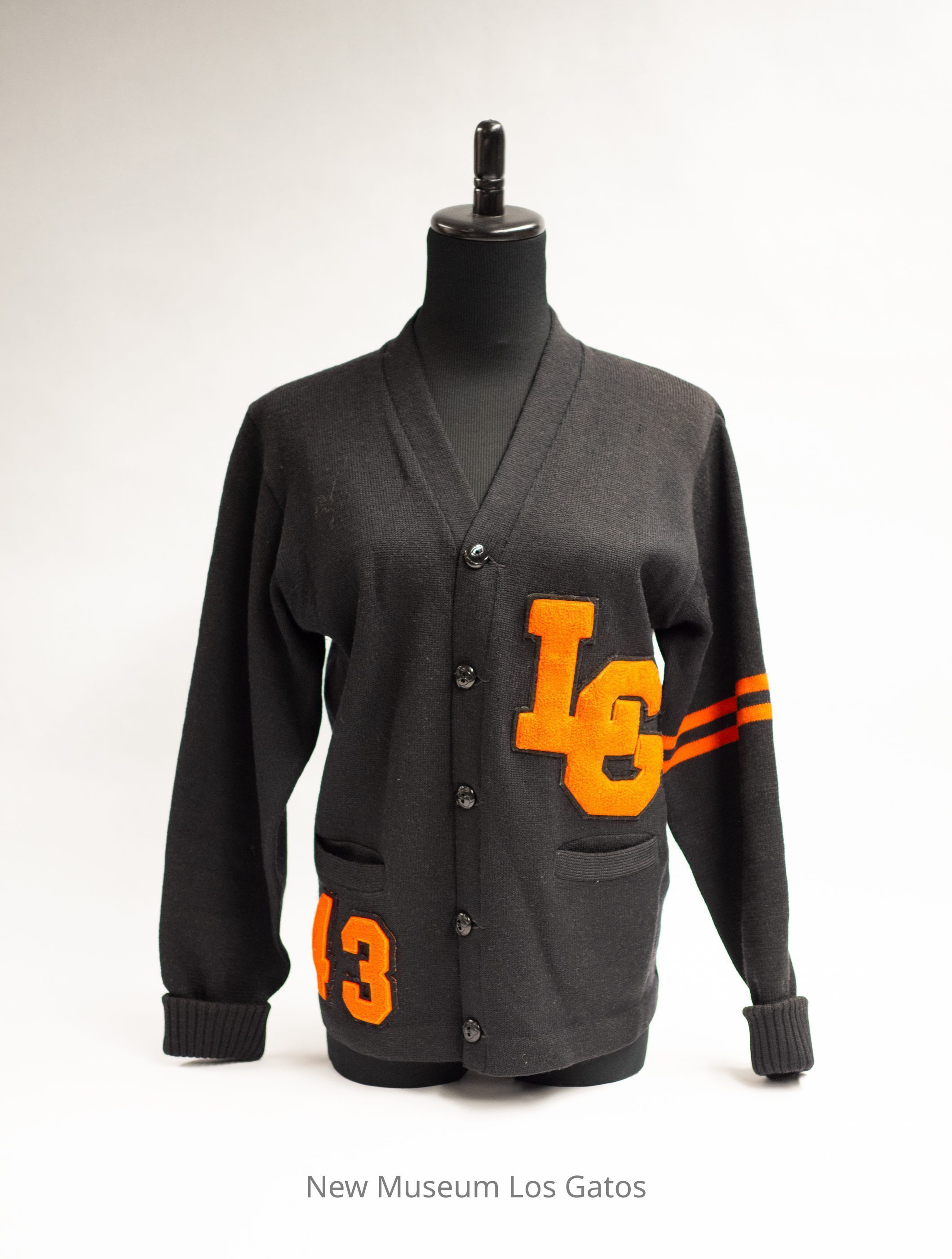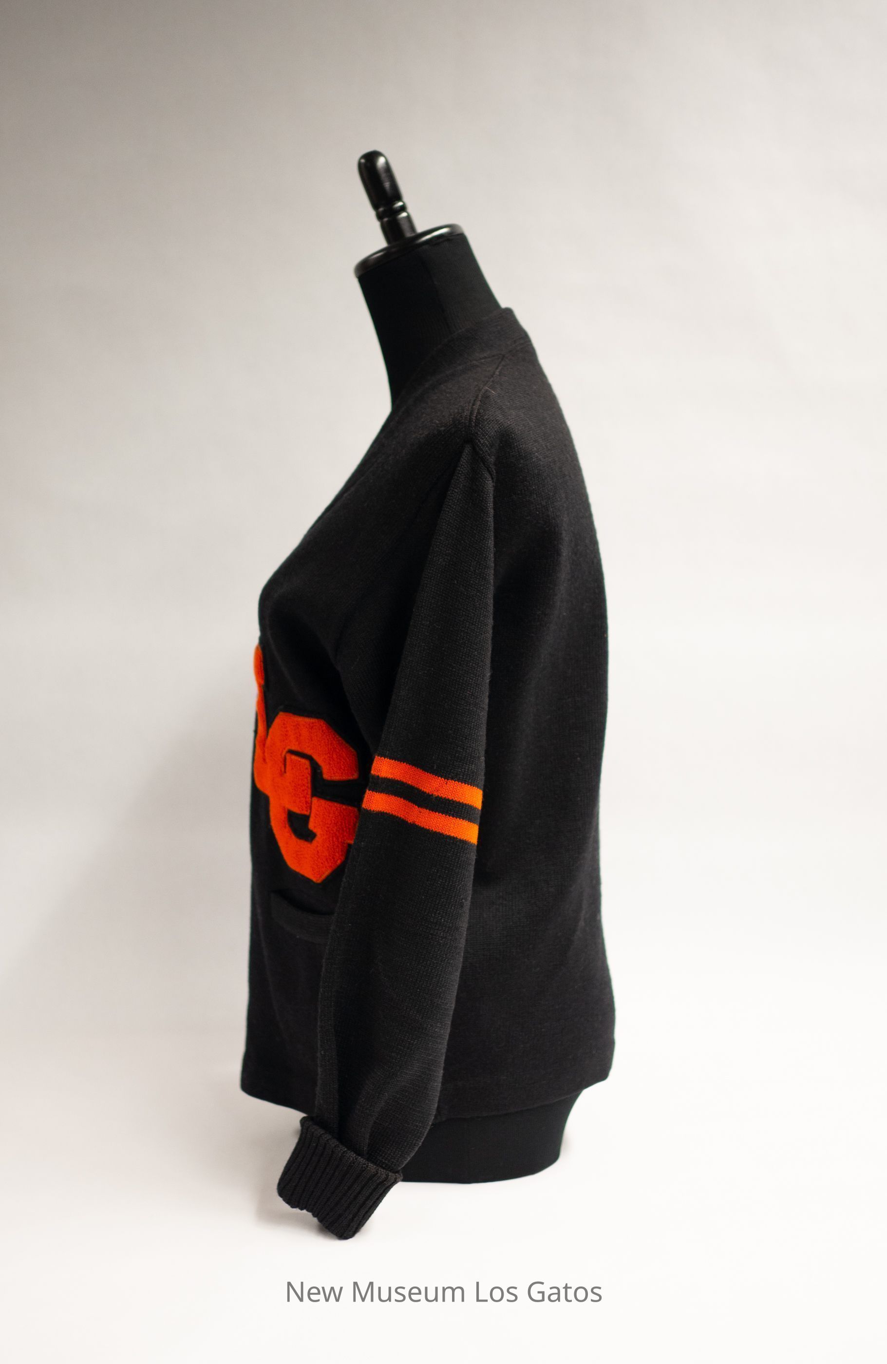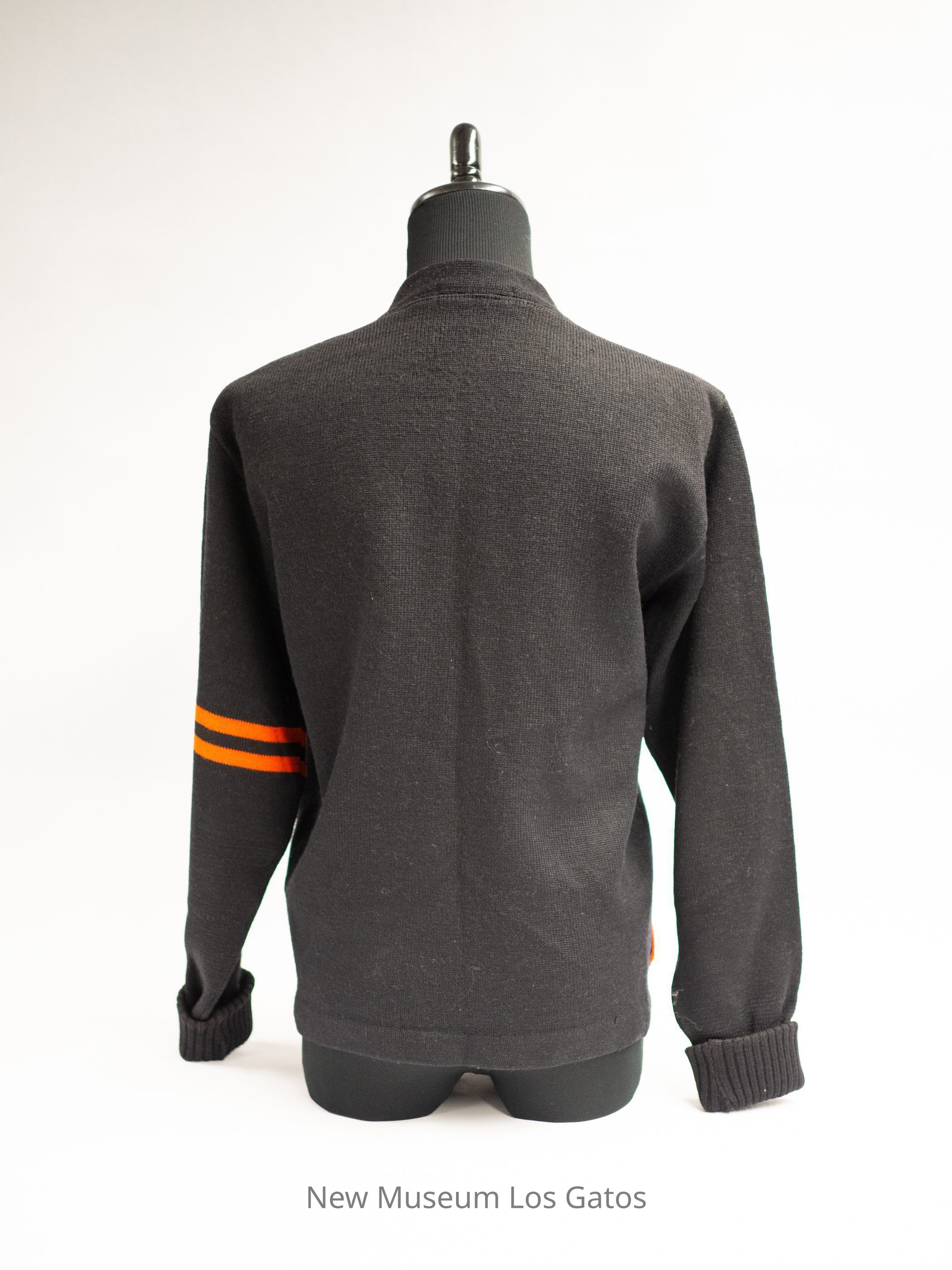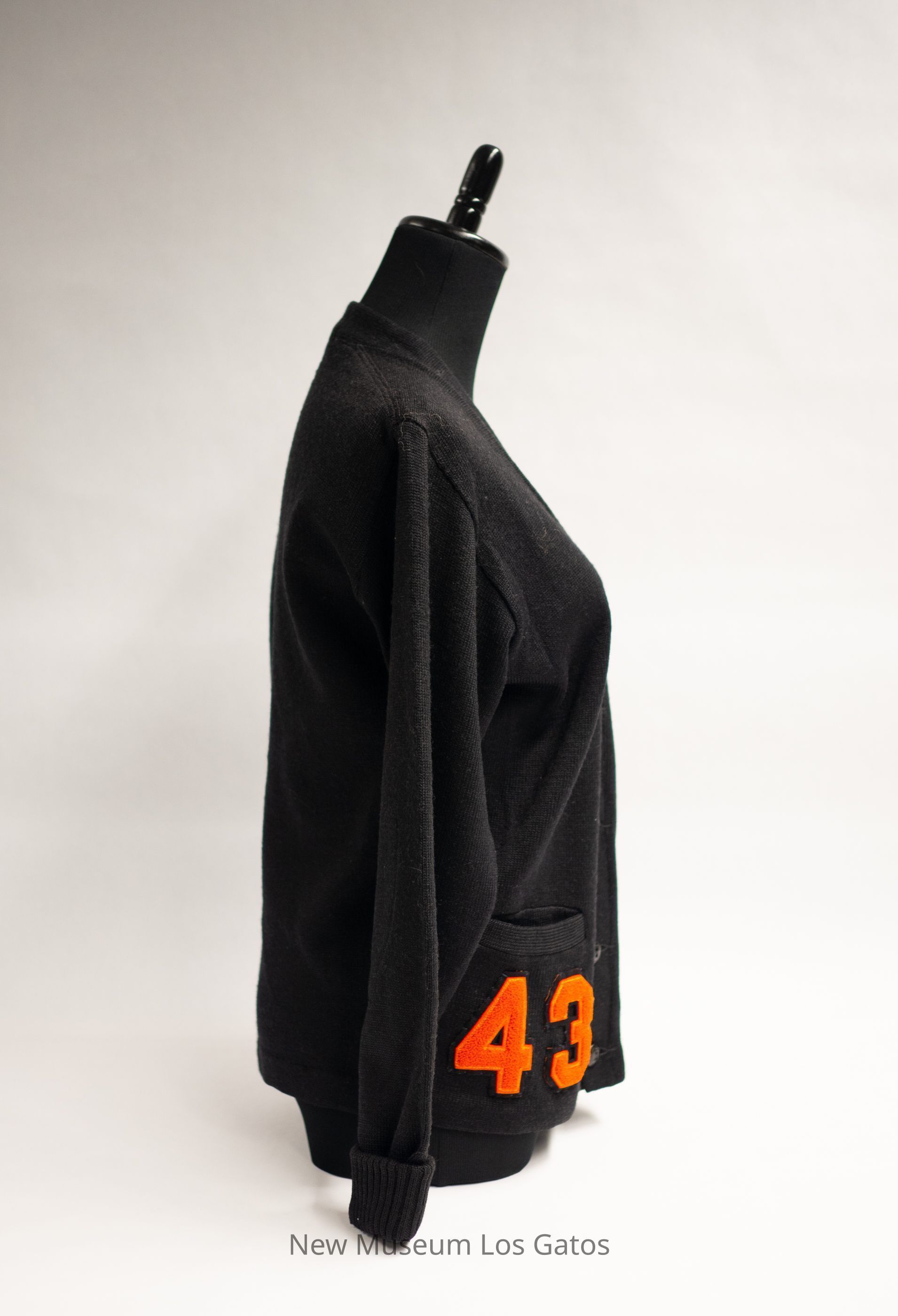A long-sleeved, black sweater. The sweater opens down the center front, and closes with five black buttons. There are two pockets, one on each side of the center, near the bottom. The cuffs of the sleeves are rolled up. There is an orange block 'LG' on the left side above the pocket, and an orange block '43' on the face of the right pocket. There is also two orange horizontal stripes on the left arm.Collection