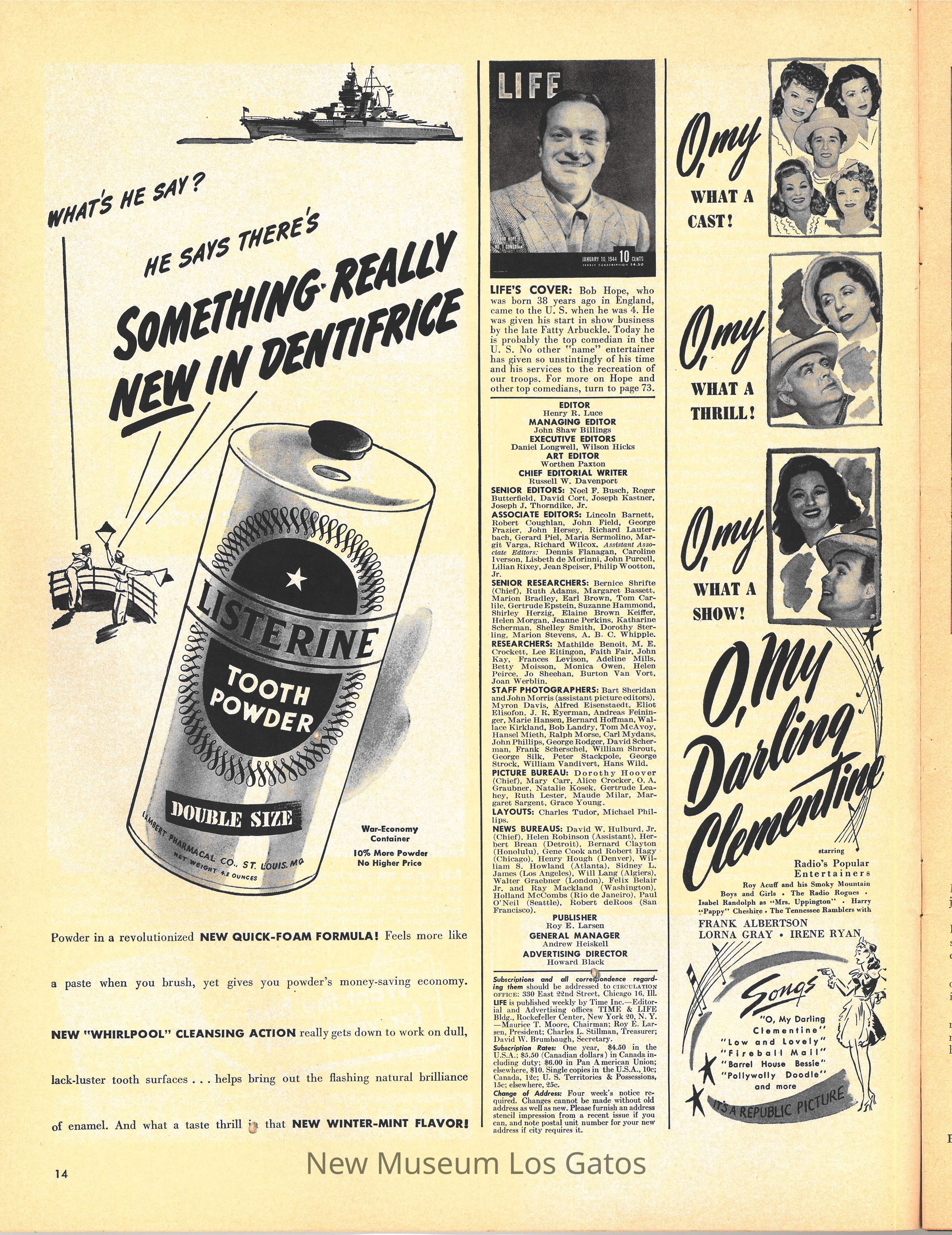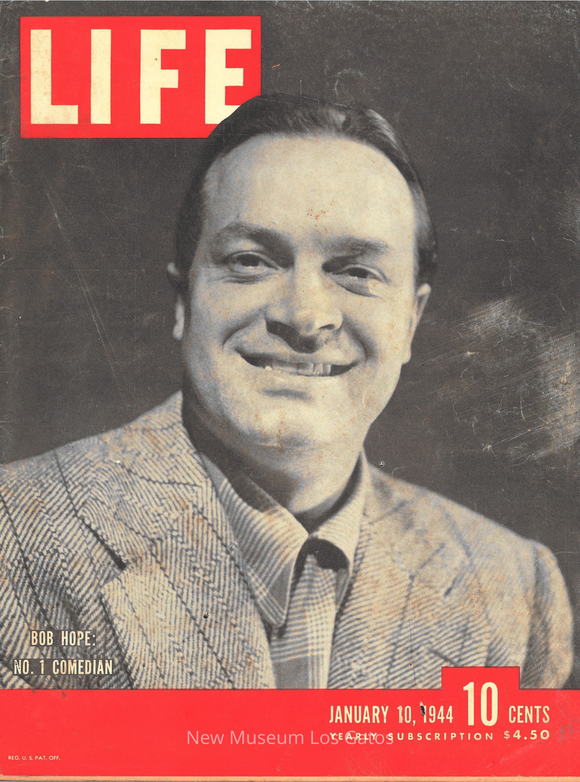 The January 10, 1944 edition of LIFE Magazine. The front cover features a black and white photograph of a man, Bob Hope, in a light-colored suit, smiling at the camera.Collection