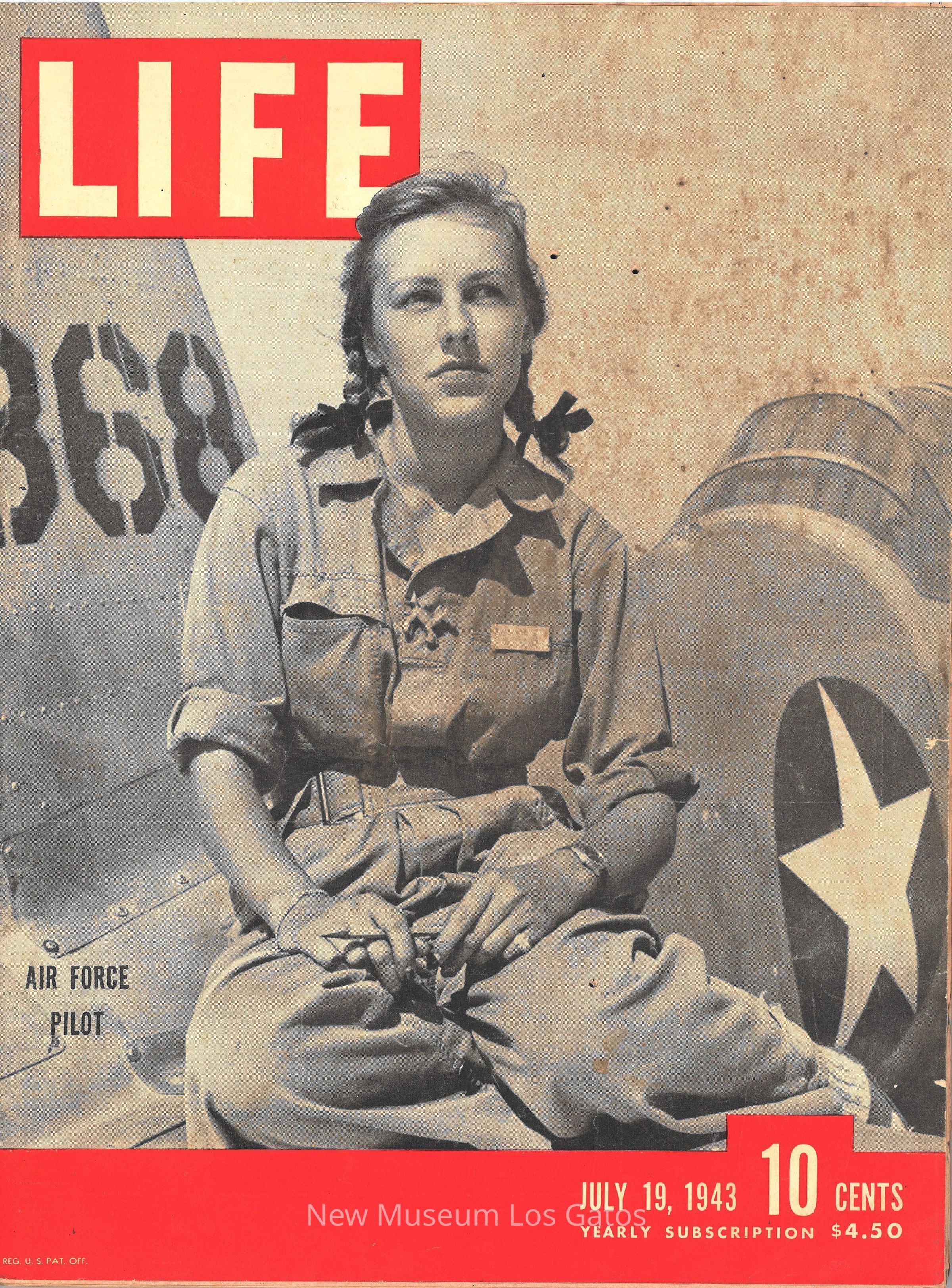 The July 19, 1943 edition of LIFE Magazine. The front cover features a black and white photograph of a woman in a jumpsuit with her hair in braids, sitting on an airplane looking off into the distance.Collection