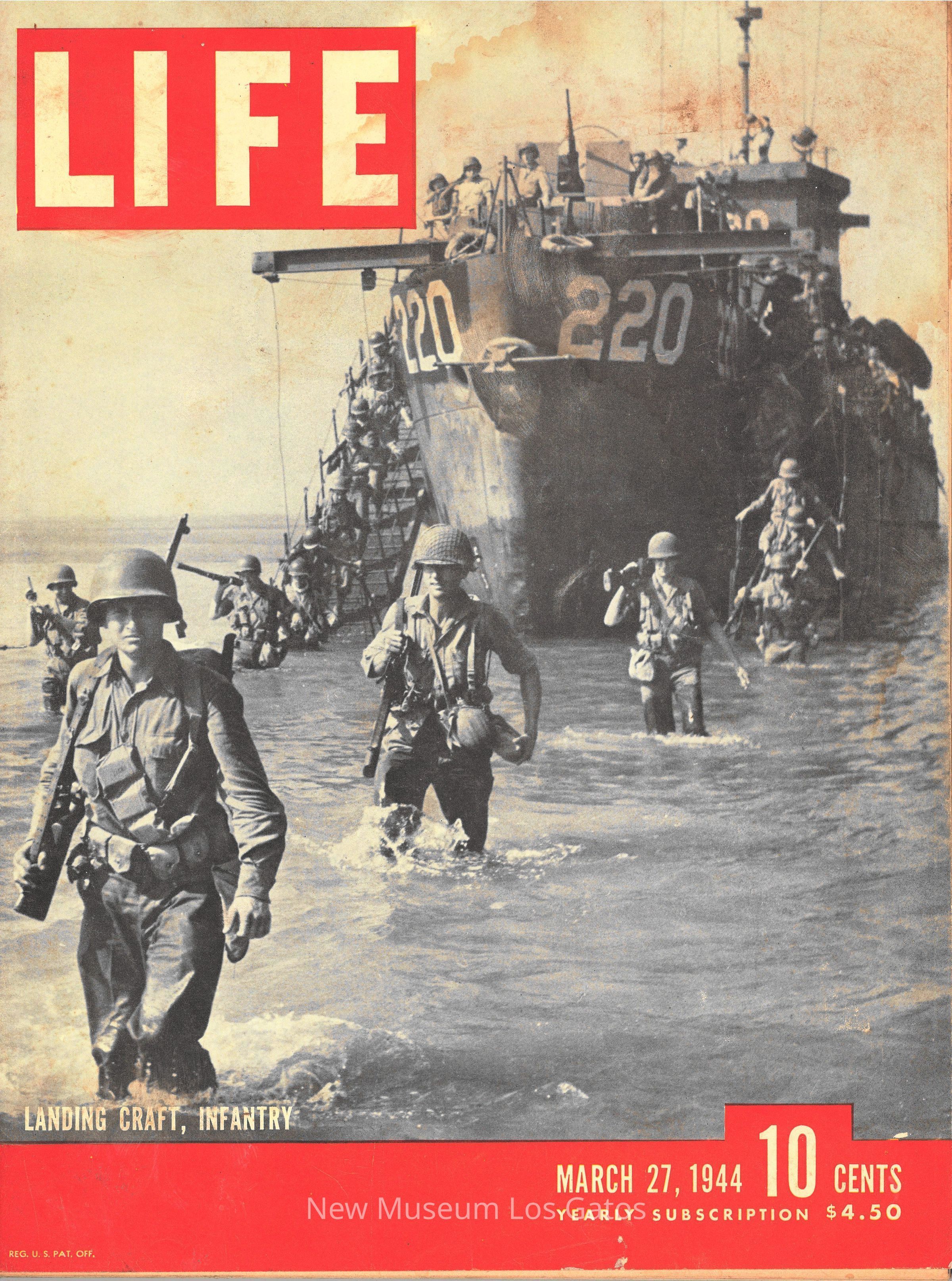 The March 27, 1944 edition of LIFE Magazine. The front cover features a black and white photograph of soldiers climbing off of a ship into shallow water.Collection