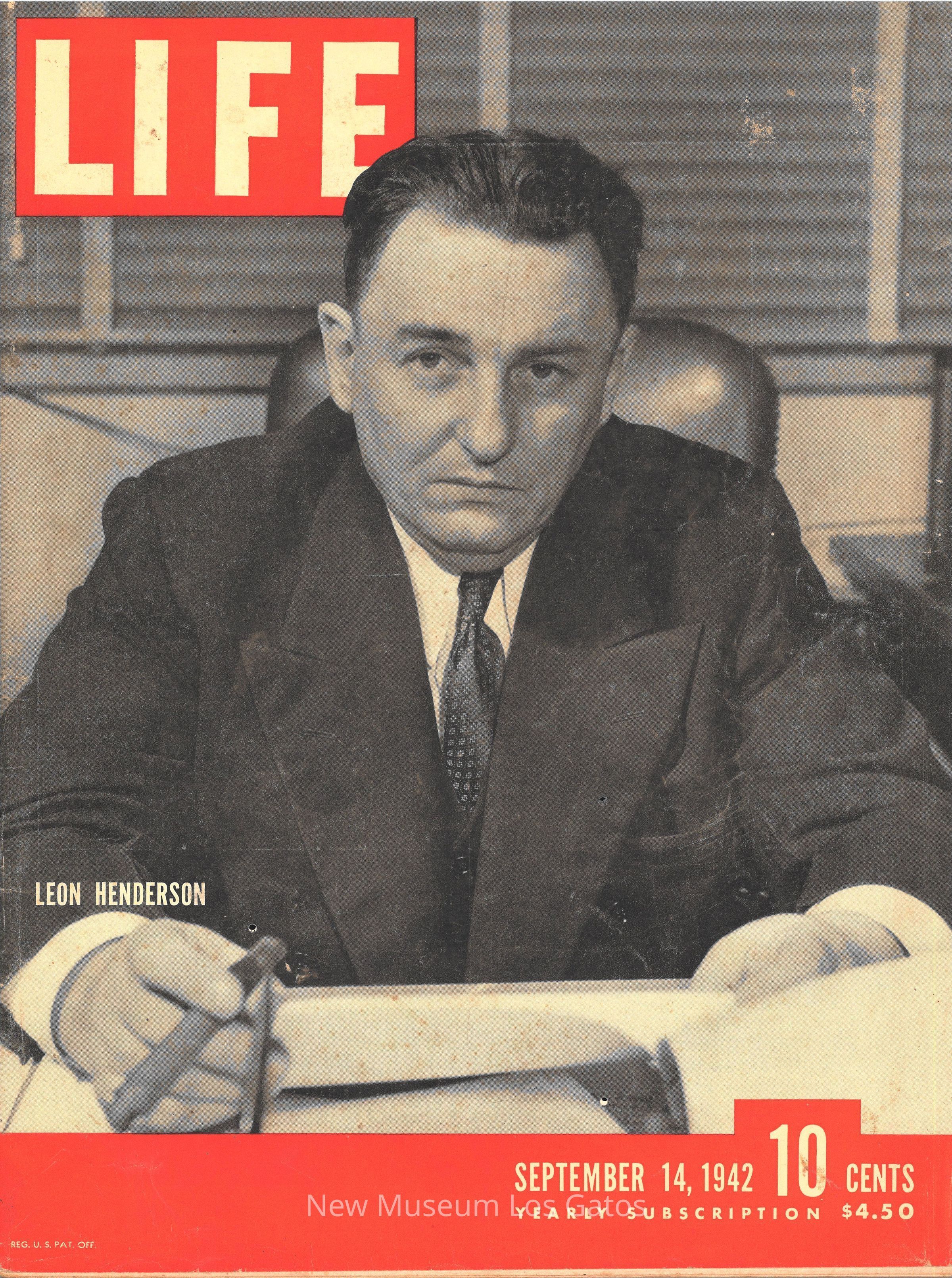 The September 14, 1942 edition of LIFE Magazine. The front cover features a black and white photograph of a man wearing a dark suit, sitting at a desk with a cigar in his hand.Collection