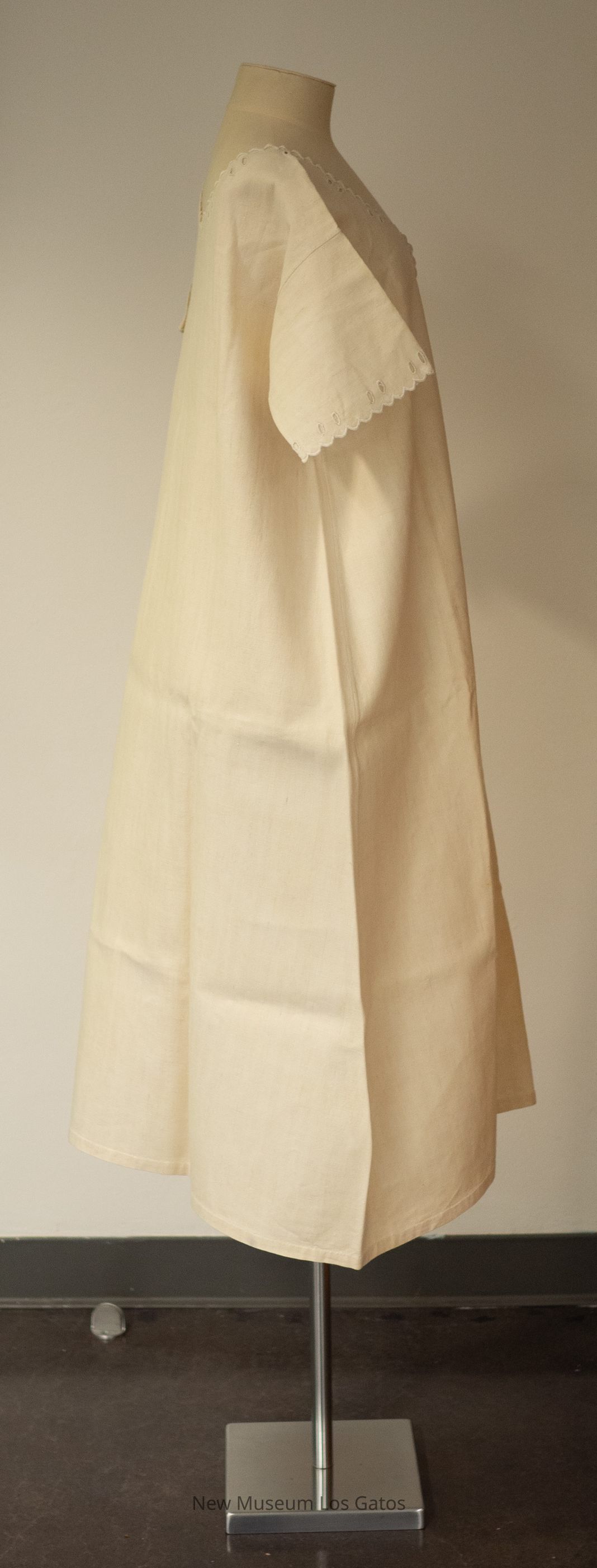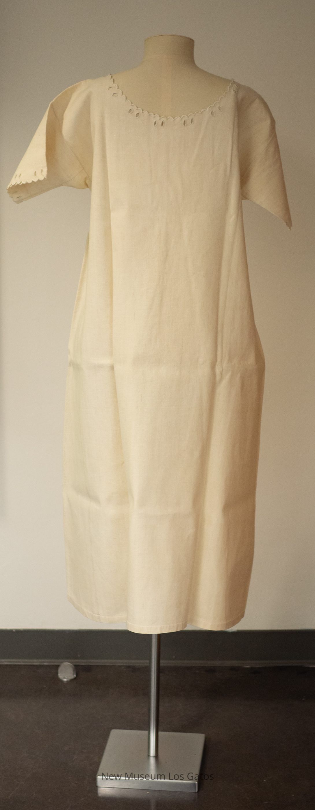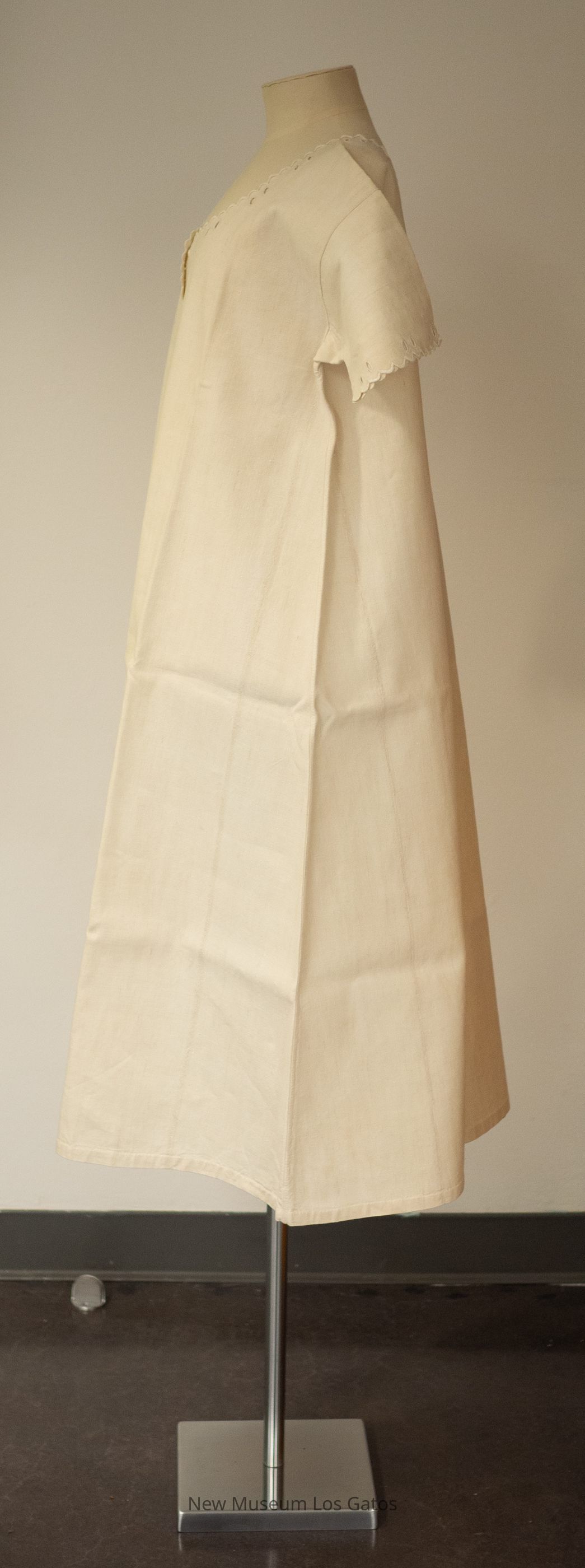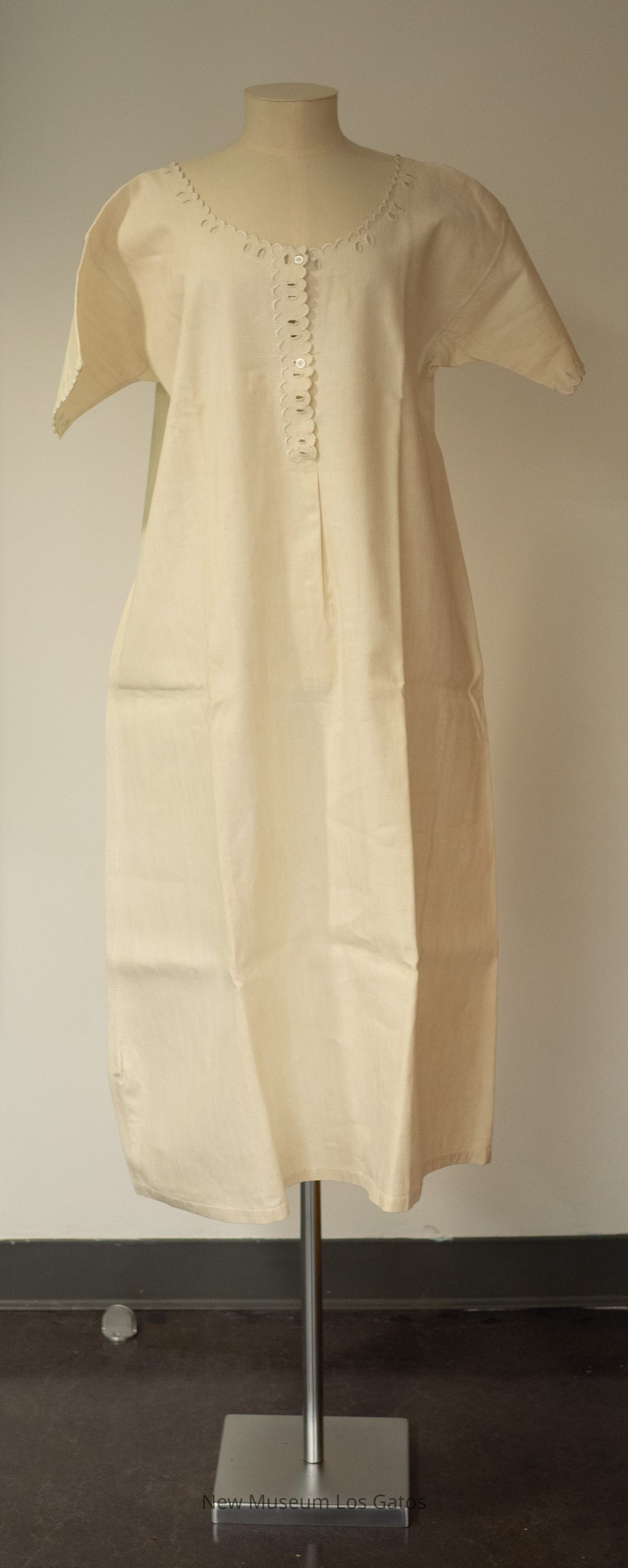 A white, plain homespun linen nightgown. The nightgown has short sleeves, and buttons open in the front with two white ivory buttons. There are eyelets and scalloped and embroidered detailing at the ends of the sleeves, the neckline, and partially down the front.Collection