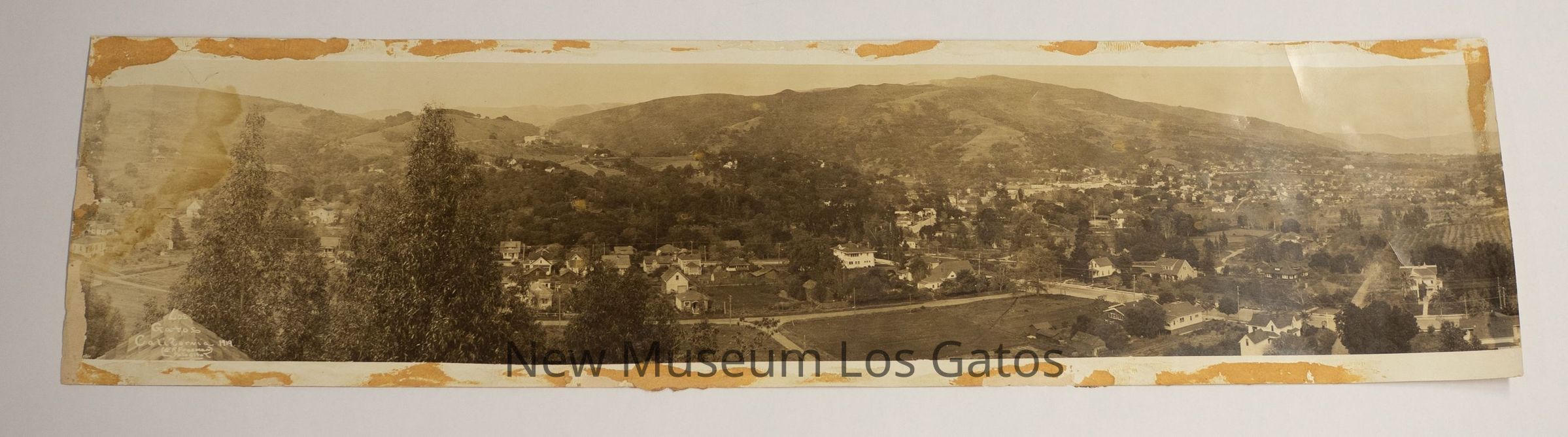A panoramic black and white photograph of Loma Alta Avenue and Los Gatos Boulevard in Los Gatos. Los Gatos Blvd. is running in diagonally along the right side of the image, while Loma Alta Ave. runs horizontally across the image. Numerous historic houses along those roads are visible, as is downtown Los Gatos and the Hotel Lyndon off to the right, and the Novitiate in the center background.Photograph Details