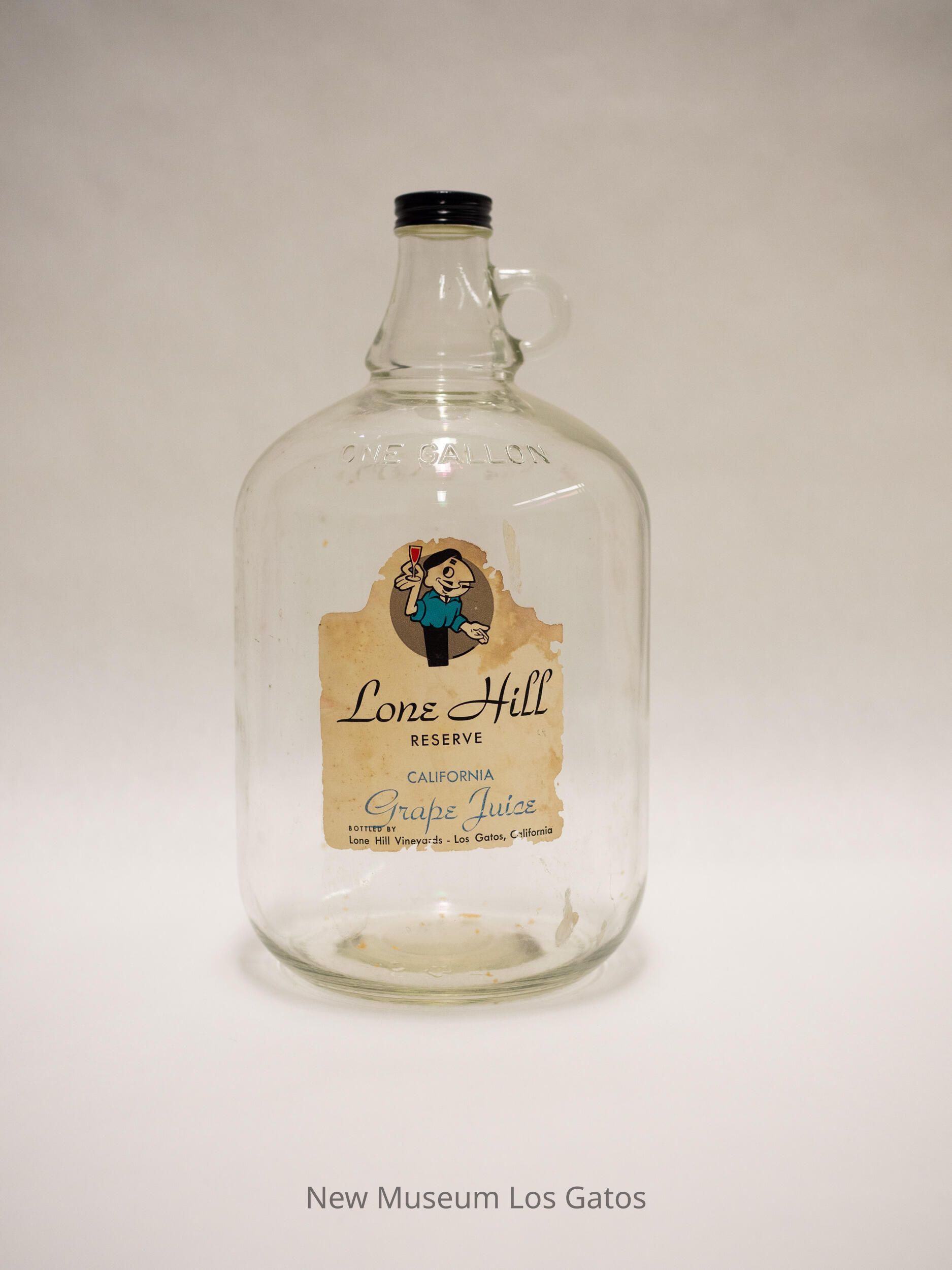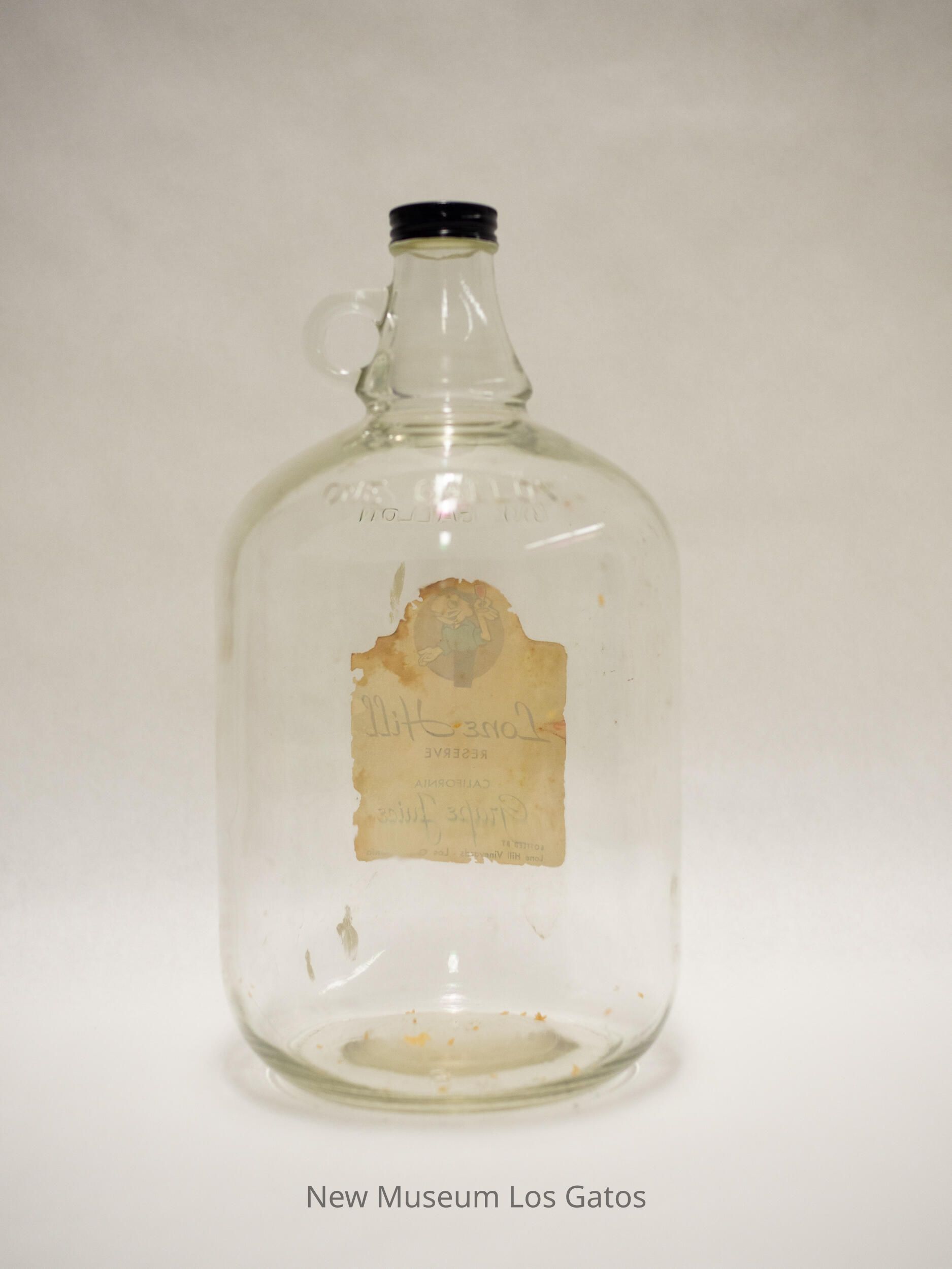 A one gallon, clear glass bottle, with a small handle on the right side of the neck, and a black twist cap. On the front of the bottle are the remains of a sticker, labeling the bottle as meant for the Lone Hill Reserve Grape Juice.Collection