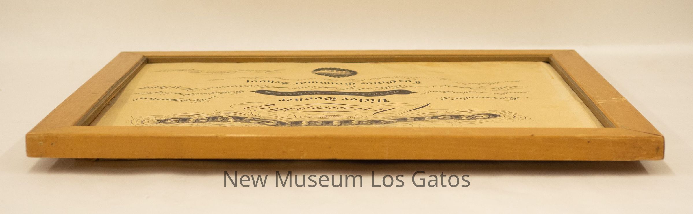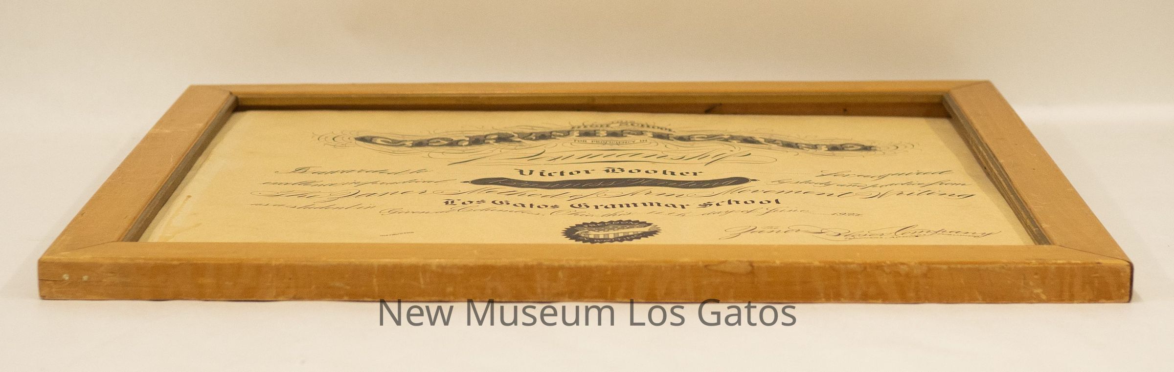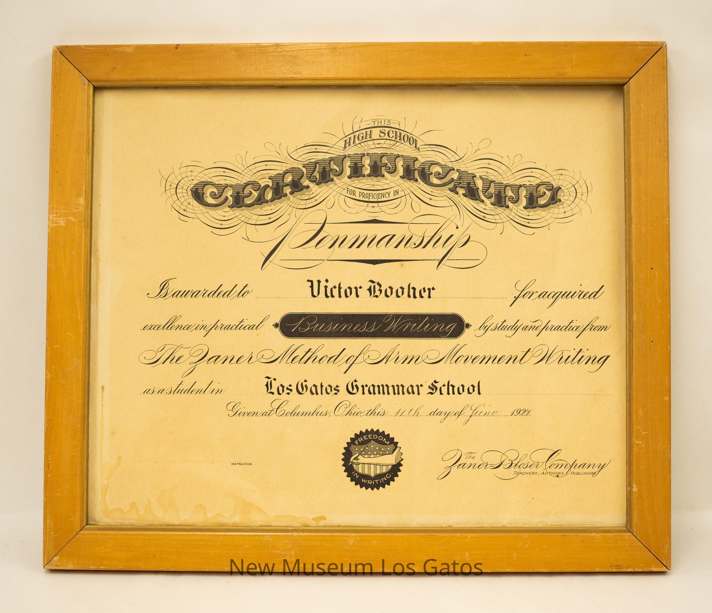 A certificate of penmanship from Los Gatos High School awarded to Victor Booher on June 11, 1924.Collection