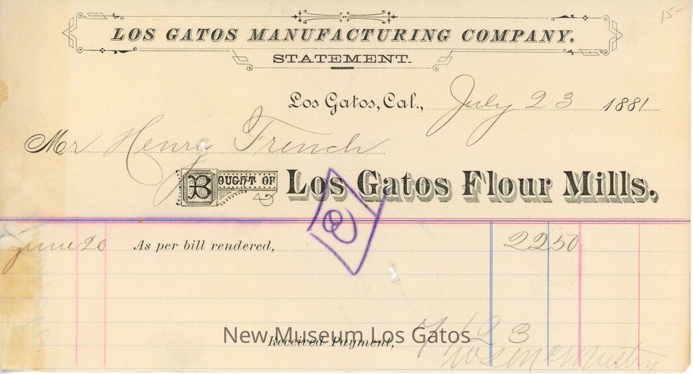 One half-sheet of paper with Los Gatos Manufacturing Company letterhead at the top, with numerous colorful vertical and horizontal lines. The paper has a single line of entry for receipt of payment from Mr. Henry French. There is a large purple 'E' inside of a purple diamond written in the center of the paper.Creator