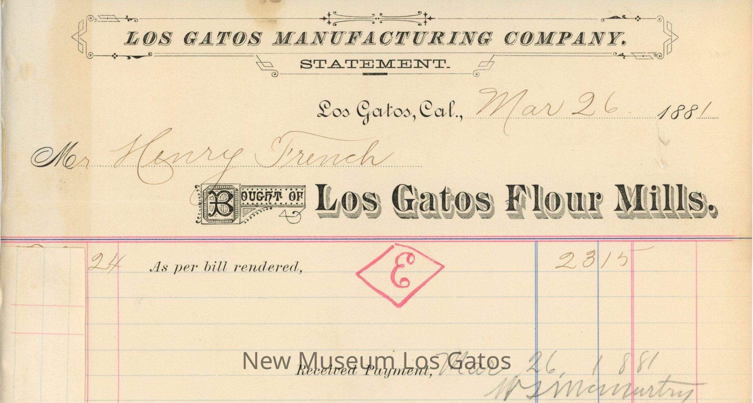 One half-sheet of paper with Los Gatos Manufacturing Company letterhead at the top, with numerous colorful vertical and horizontal lines. The paper has a single line of entry for receipt of payment from Mr. Henry French. There is a large red 'E' inside of a diamond written in the center of the paper.Creator