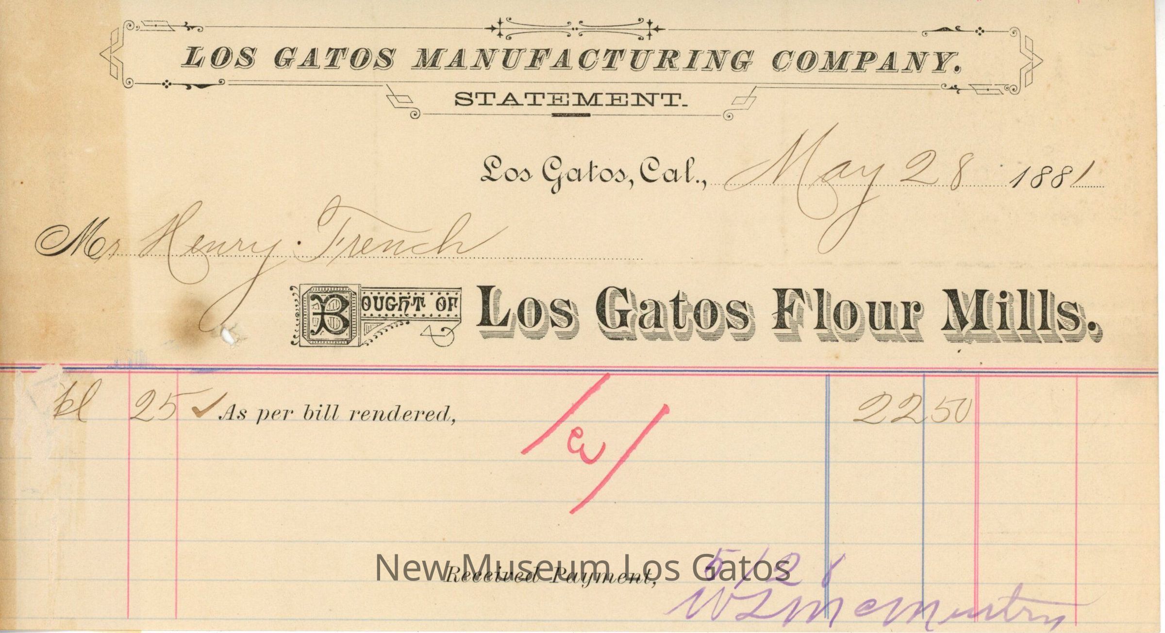 One half-sheet of paper with Los Gatos Manufacturing Company letterhead at the top, with numerous colorful vertical and horizontal lines. The paper has a single line of entry for receipt of payment from Mr. Henry French. There is a large red 'E' with a red line above and a red line below, written in the center of the paper.Creator