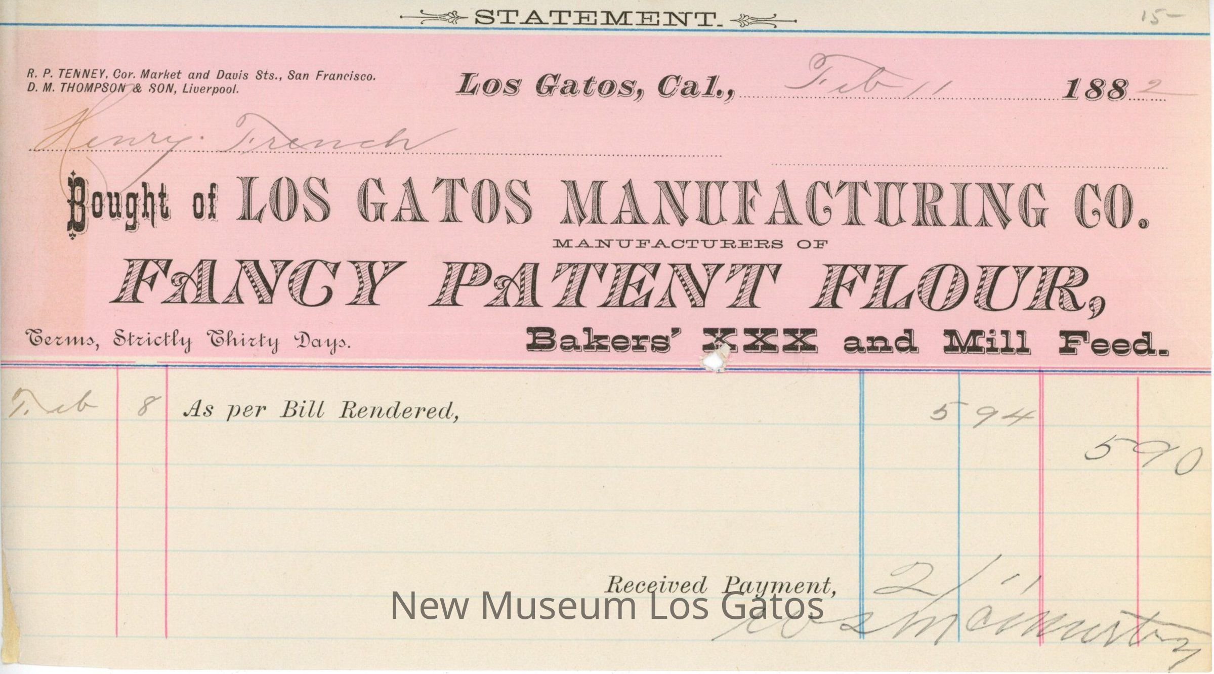 One half-sheet of paper with Los Gatos Manufacturing Company letterhead in a pink band at the top, with numerous colorful vertical and horizontal lines in the bottom half. The paper has a single line of entry for receipt of payment from Mr. Henry French.Creator