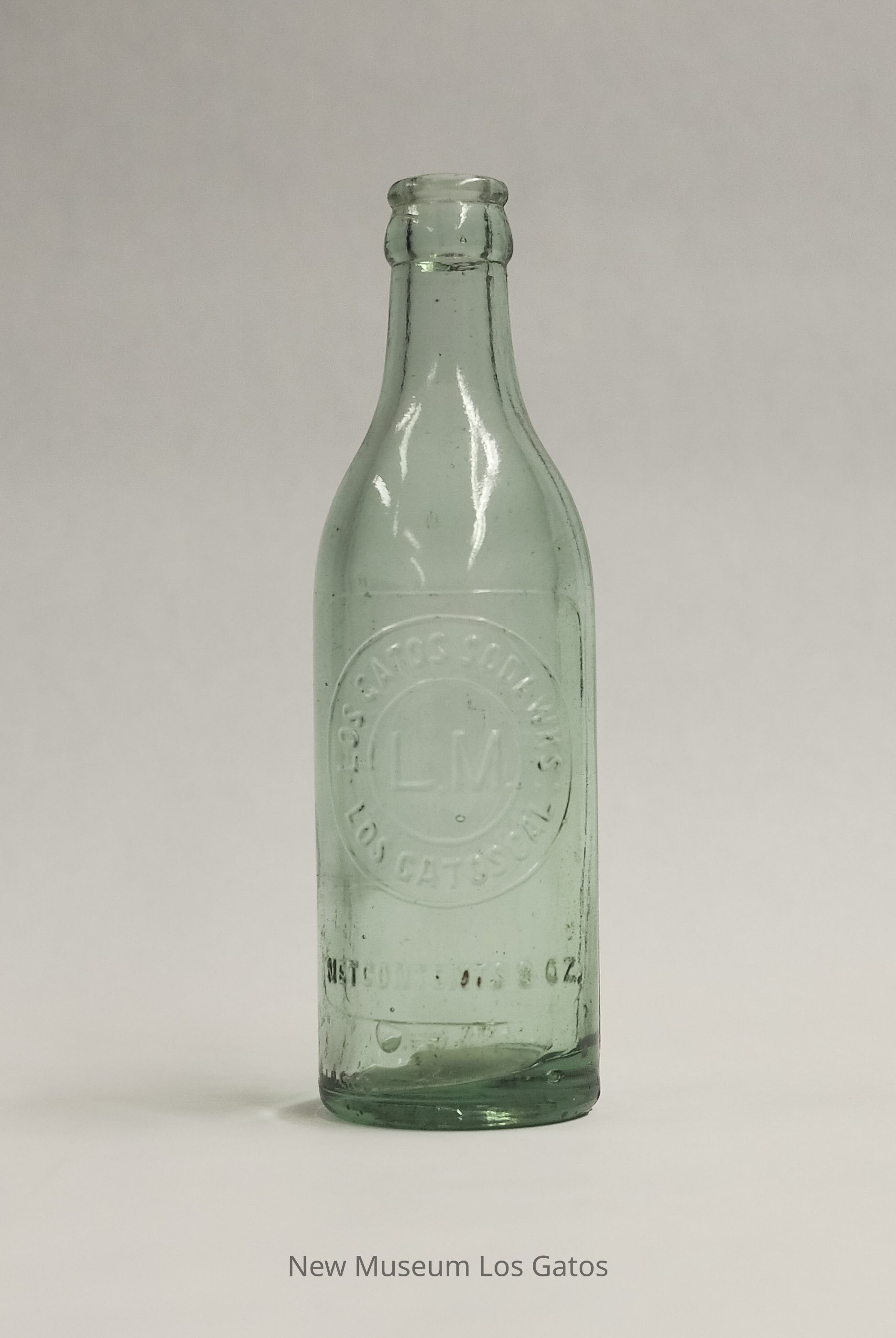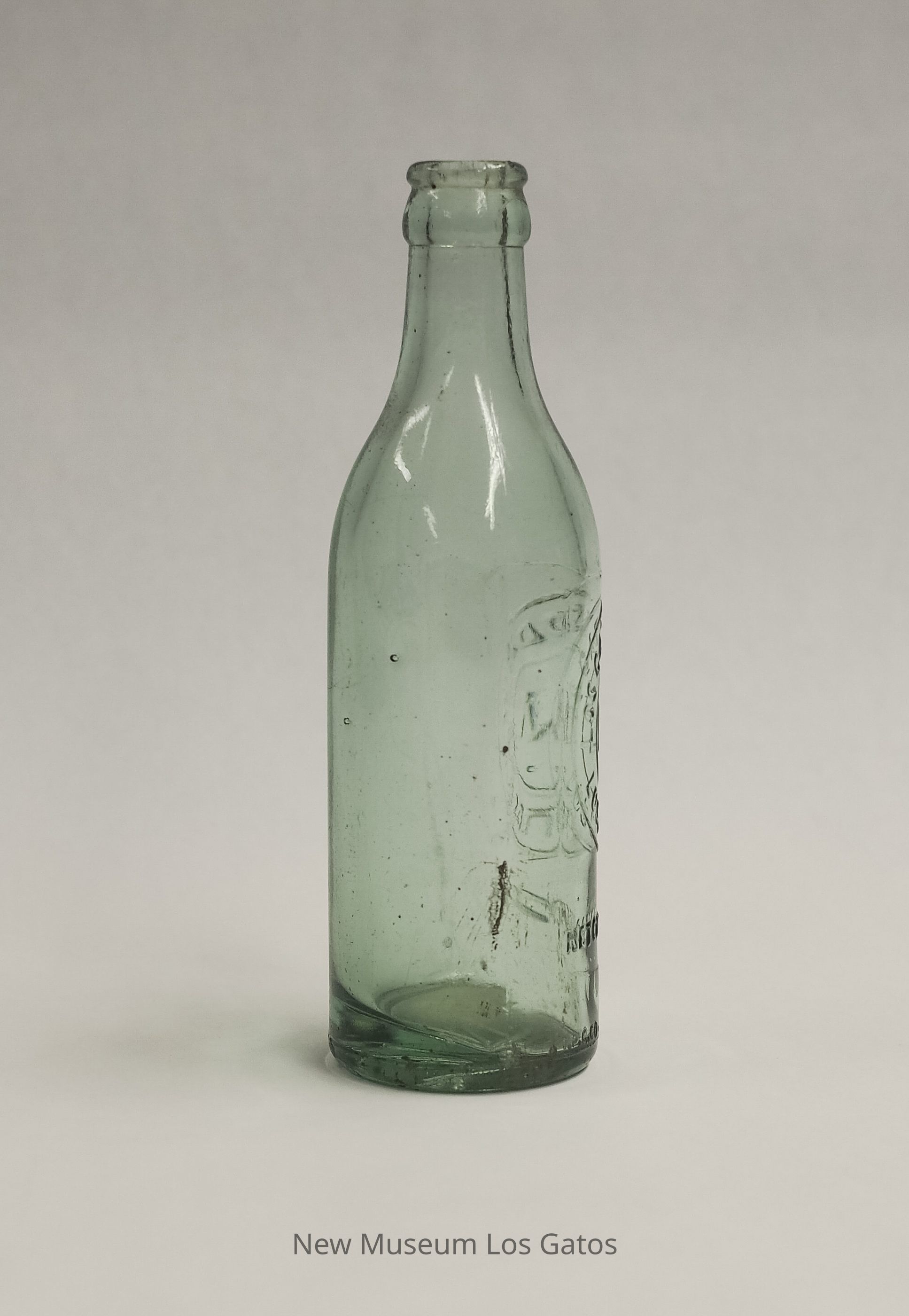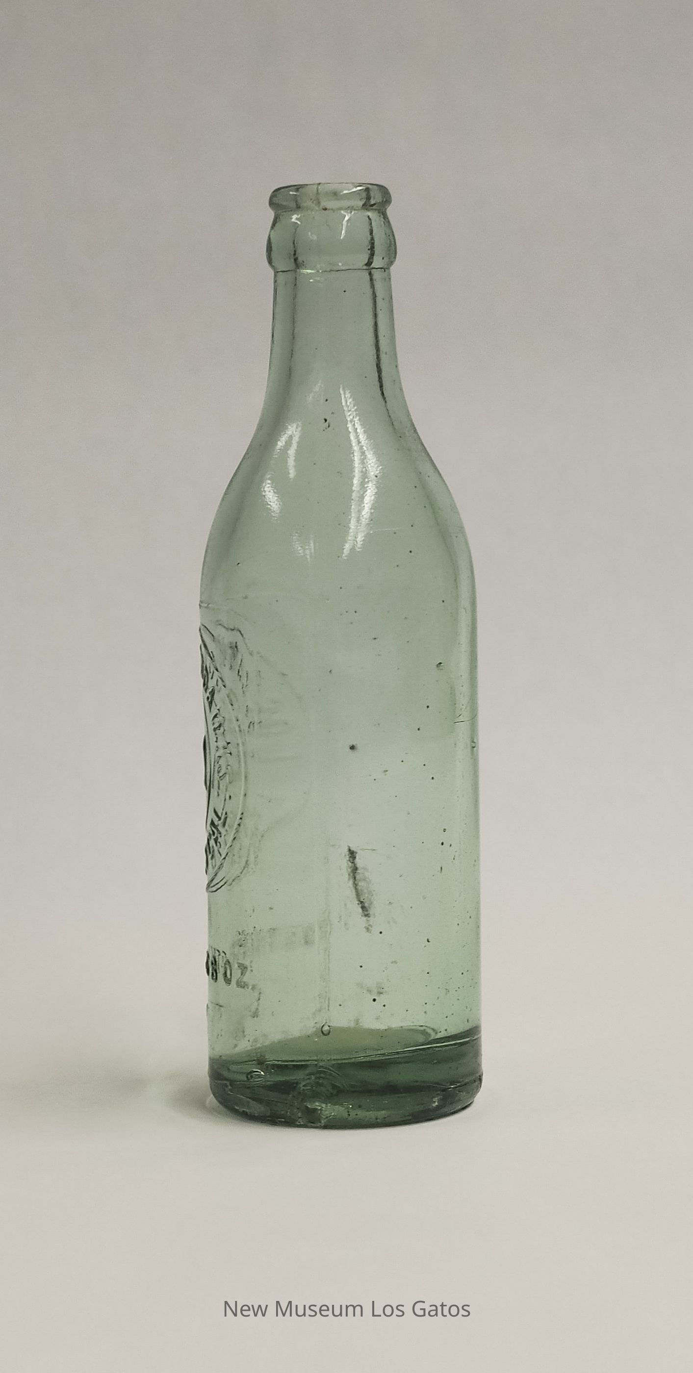 A clear bottle with a blue-green tint from Los Gatos Soda Works. Manufacturing information is embossed on one side.Collection