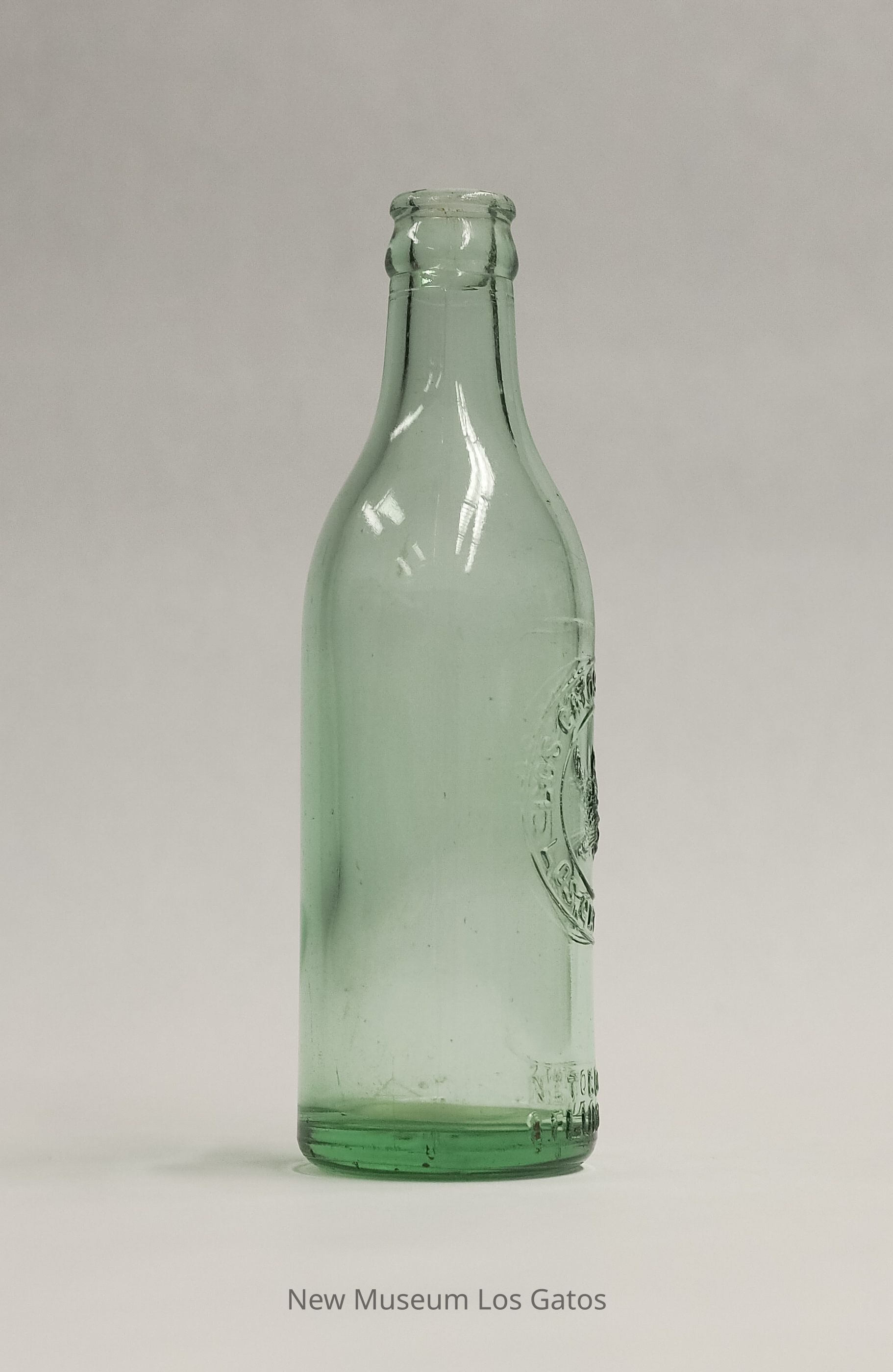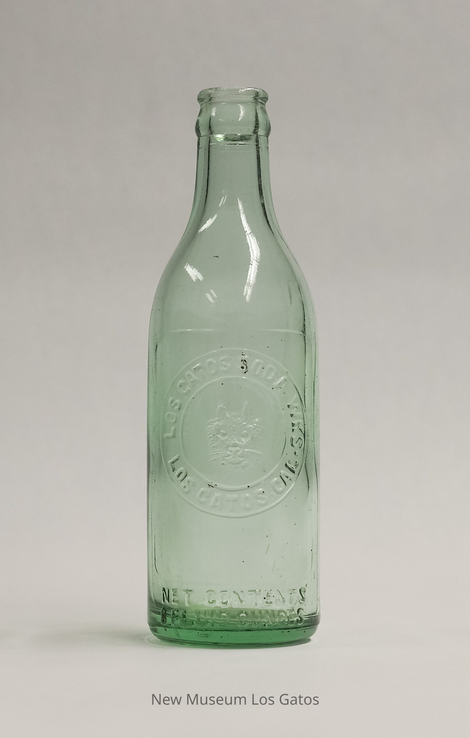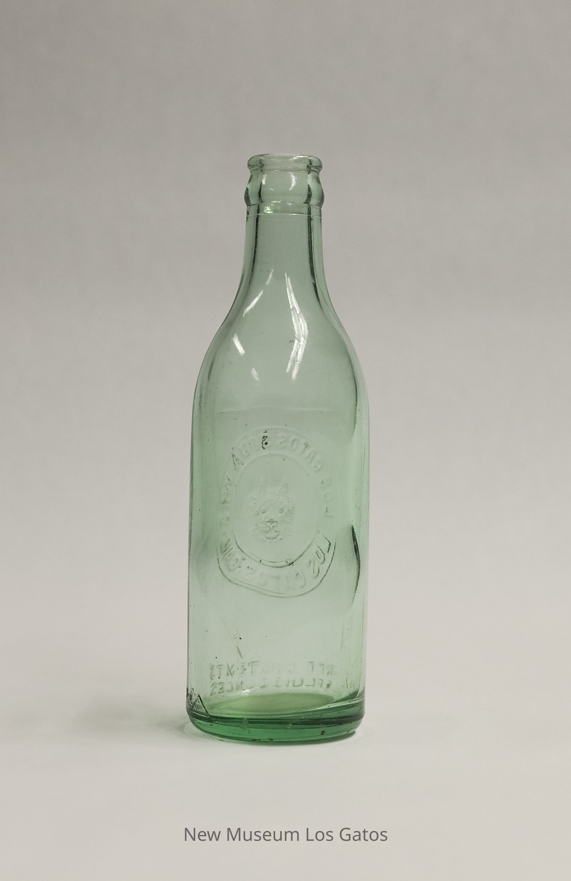 A clear bottle with a blue-green tint from Los Gatos Soda Works. Manufacturing information and decorative cat face are embossed on one side.Collection