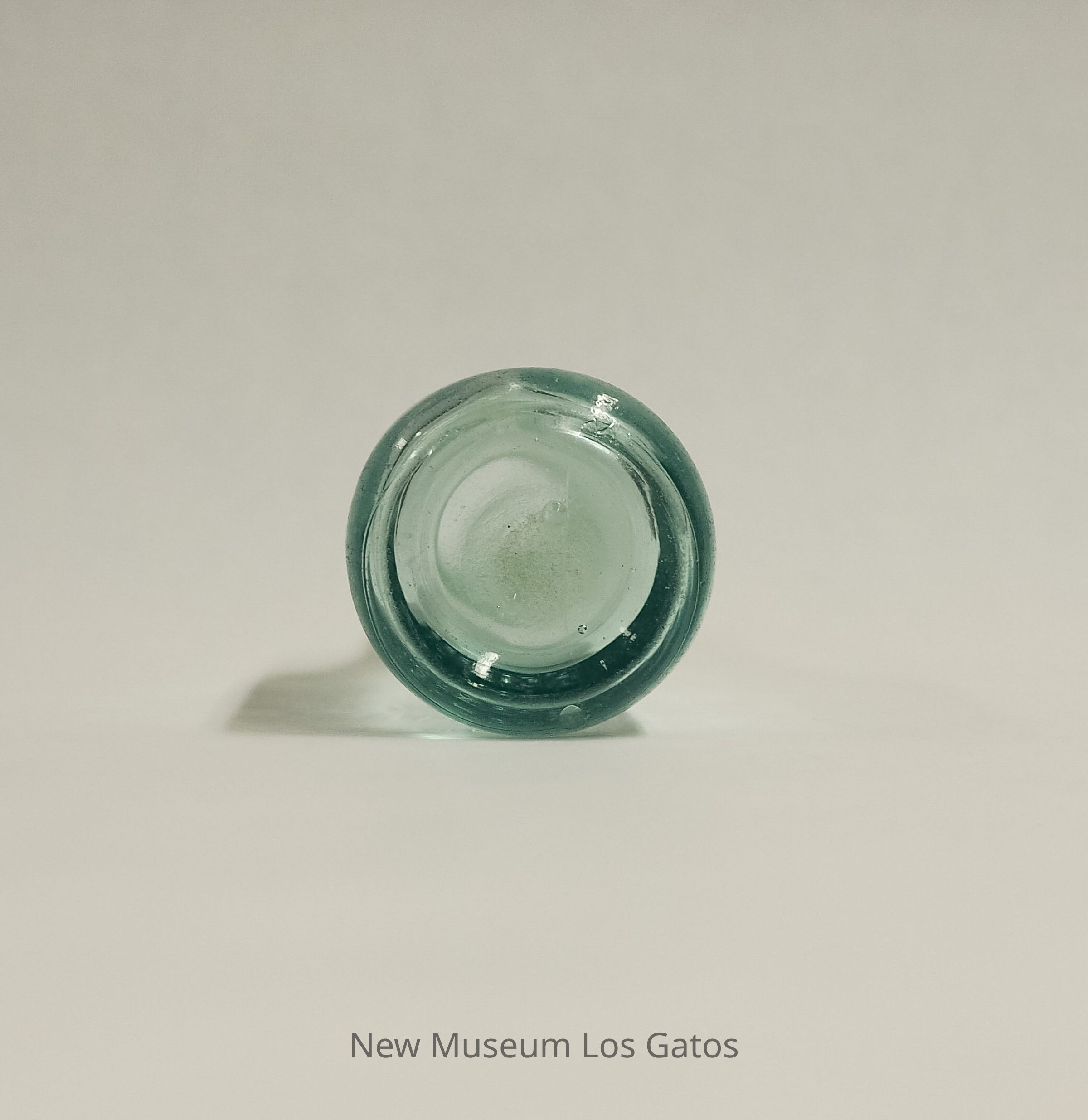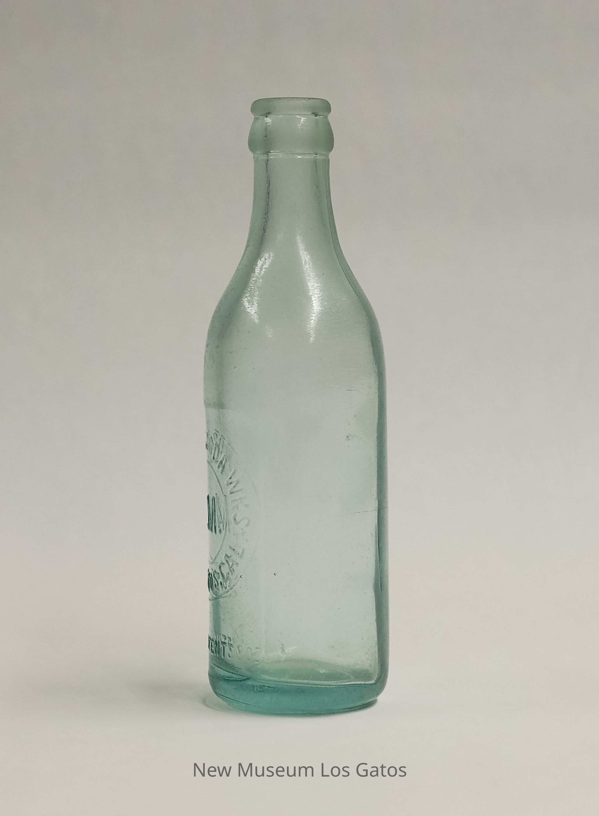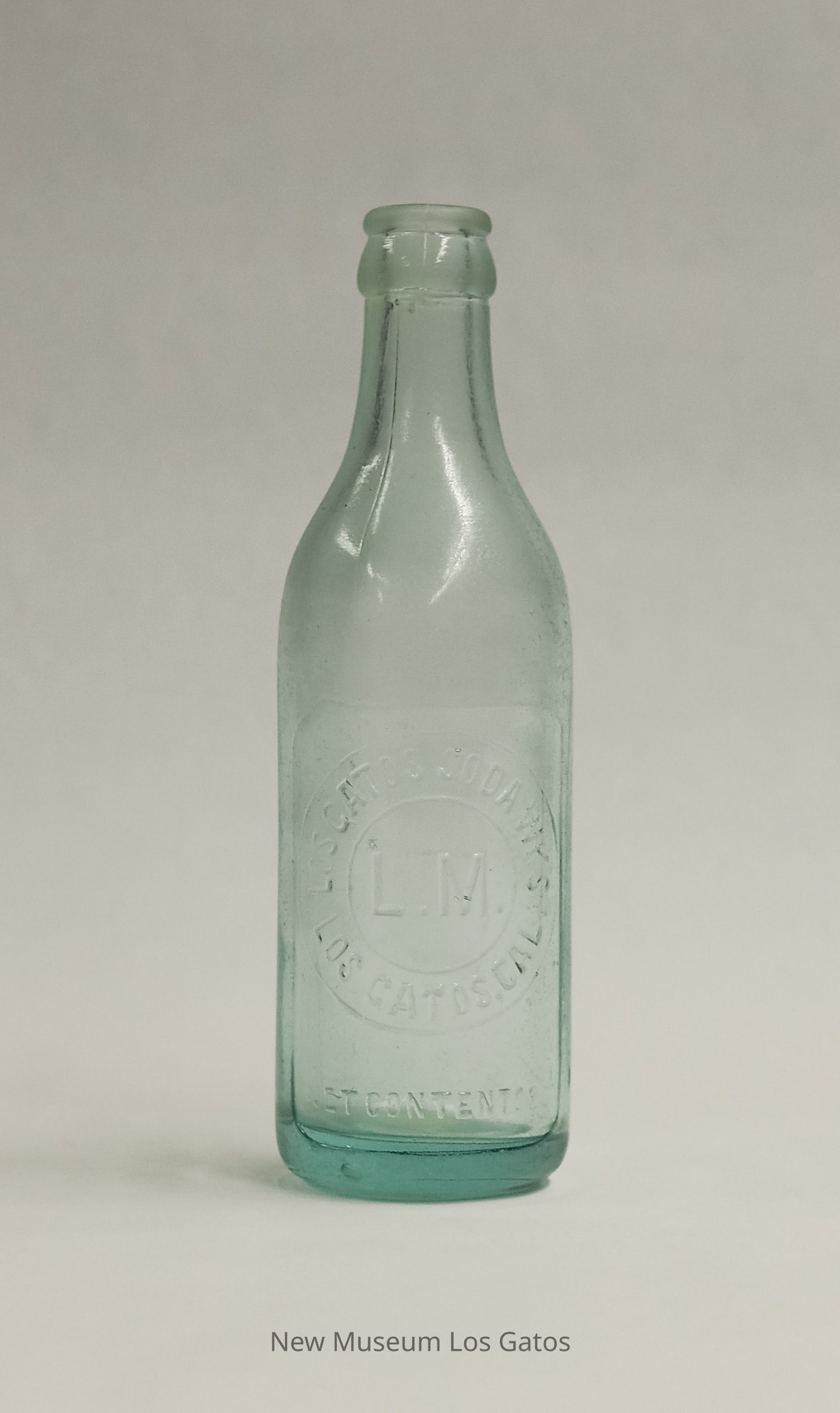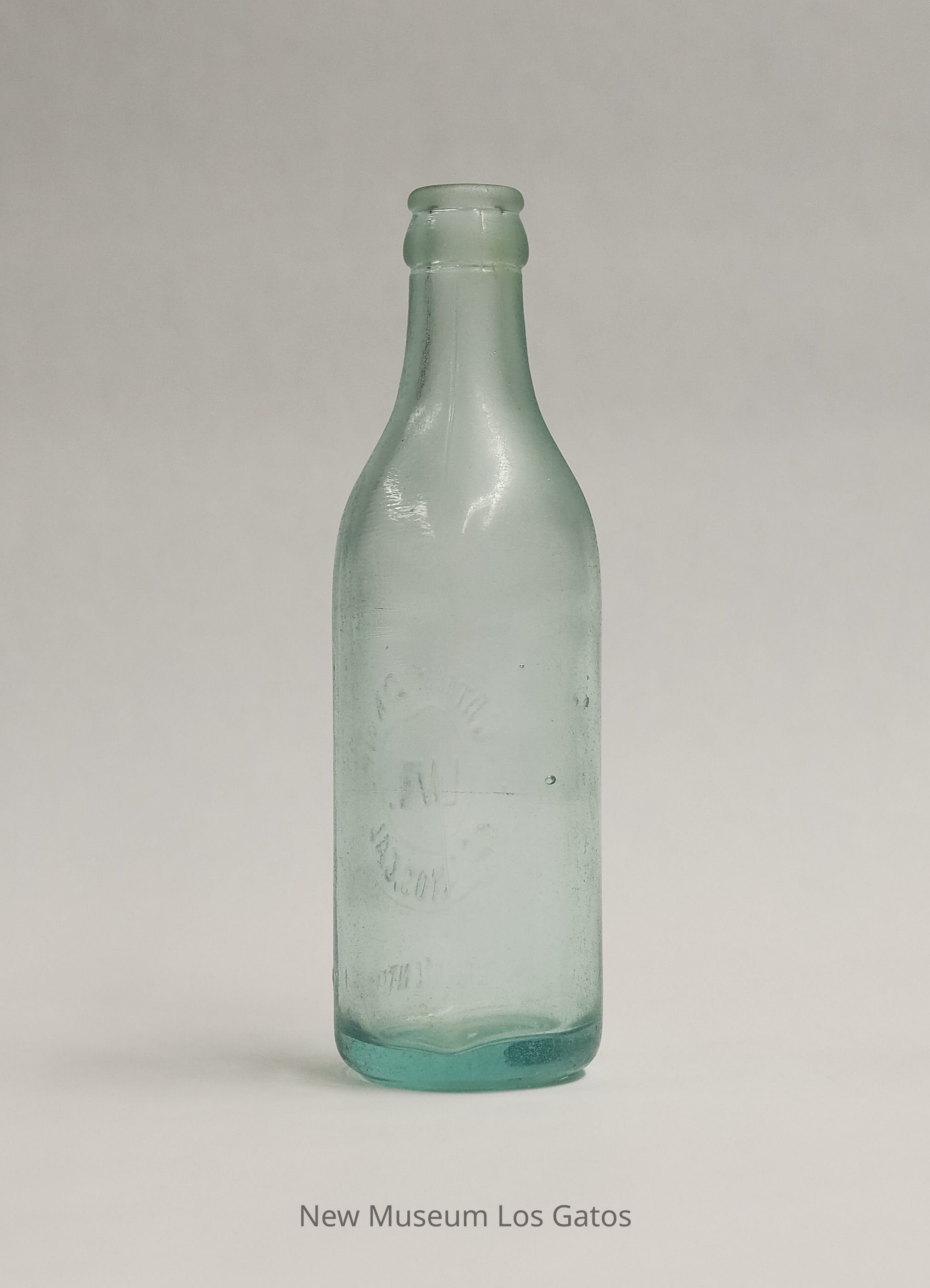 A clear and slightly matte bottle with a blue-green tint from Los Gatos Soda Works. Manufacturing information is embossed on one side.Collection