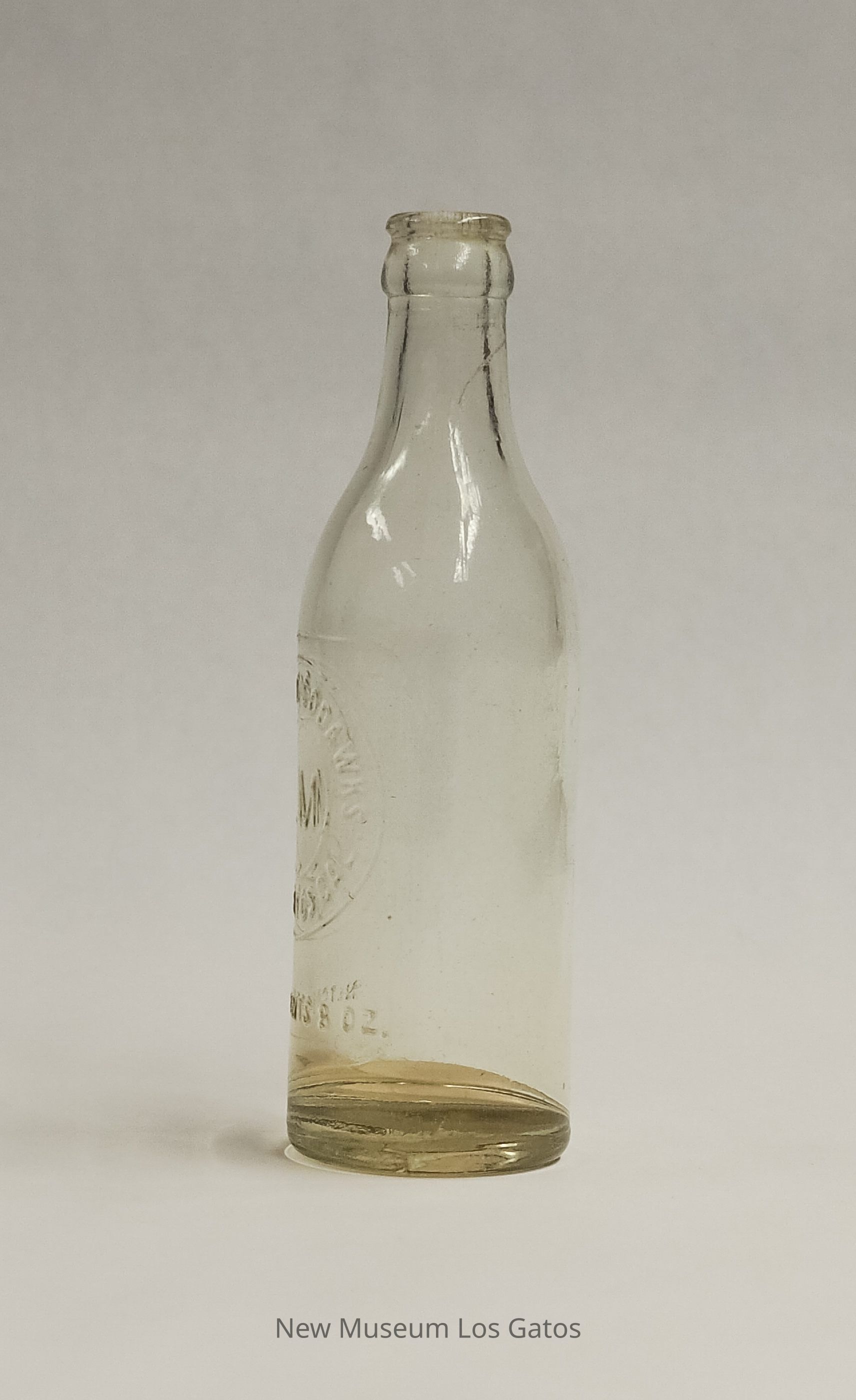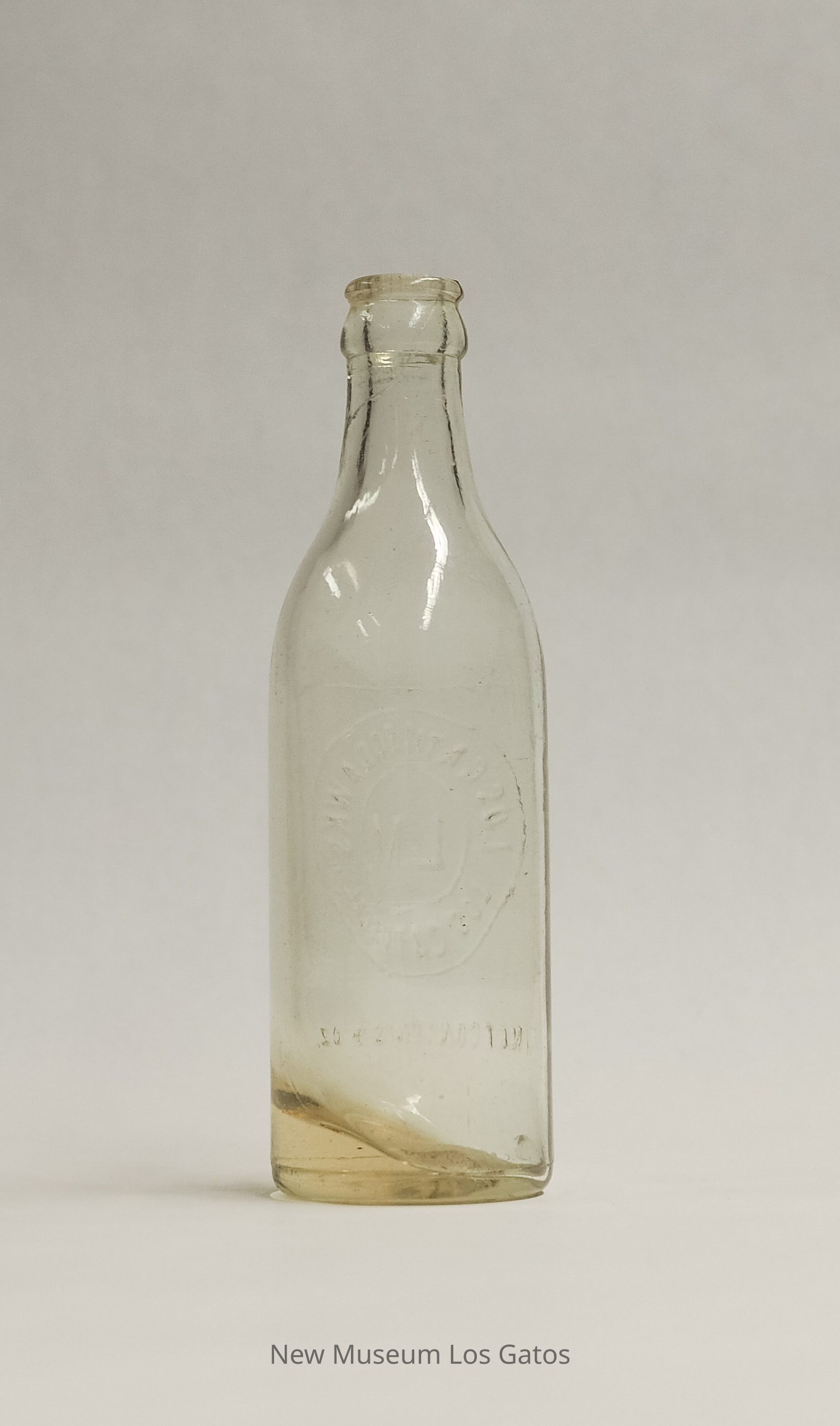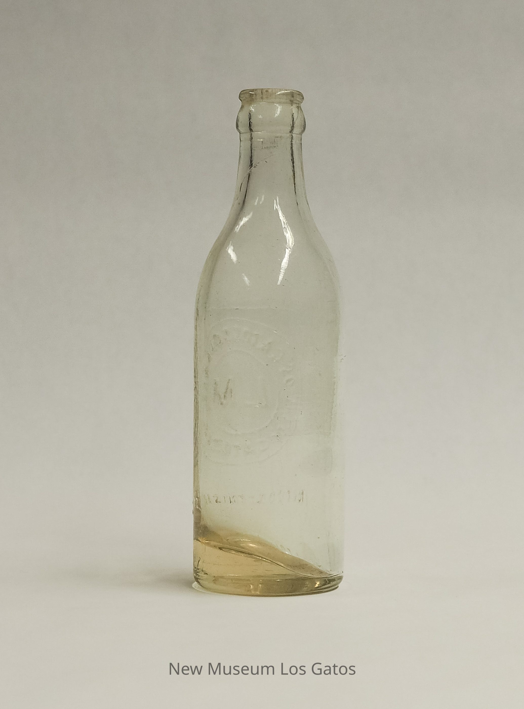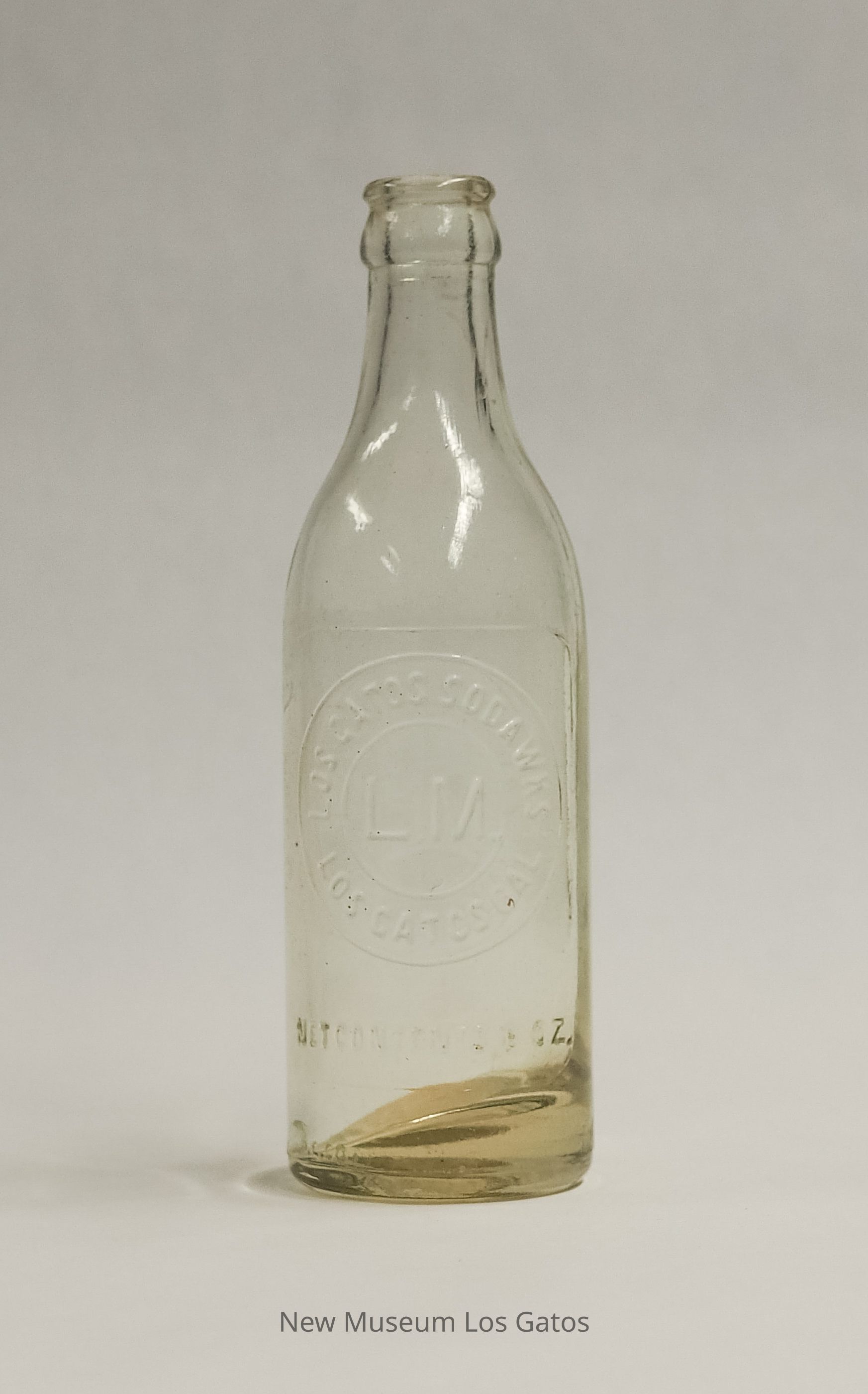 A clear bottle with a yellow tint from Los Gatos Soda Works. Manufacturing information is embossed on one side.Collection