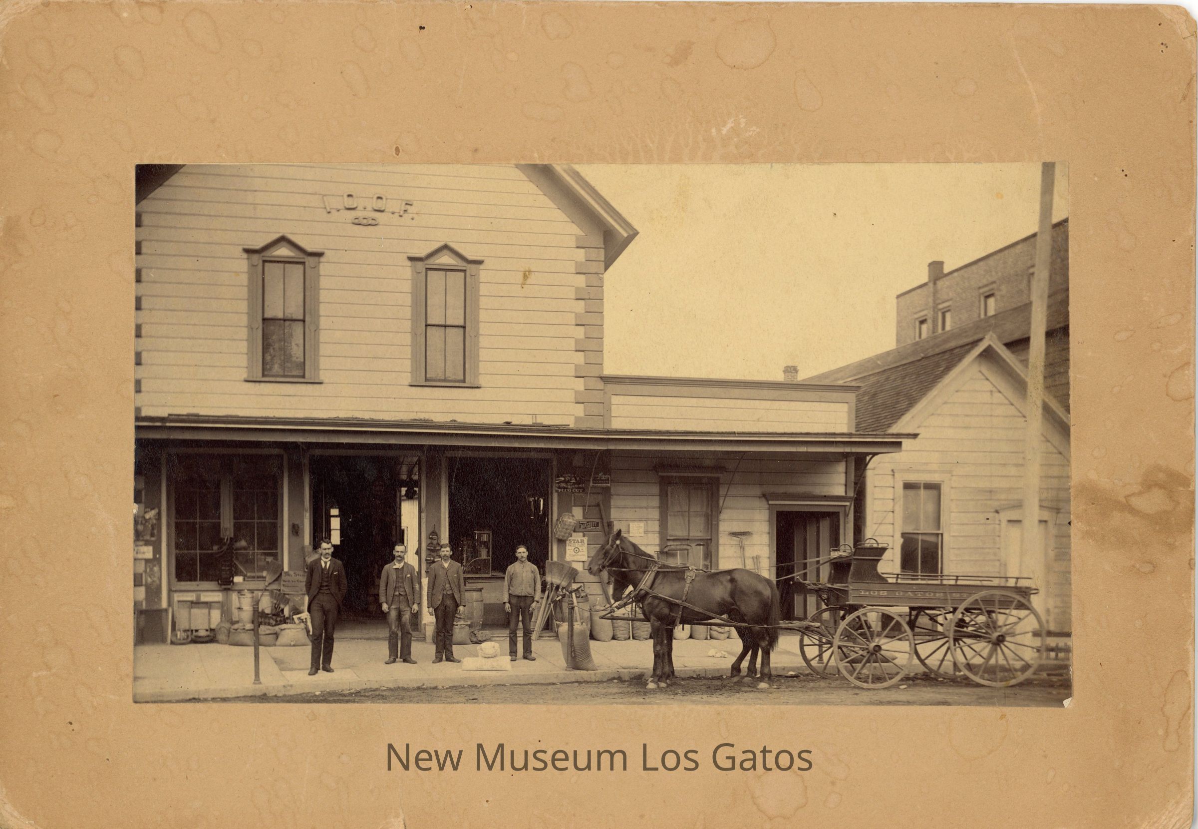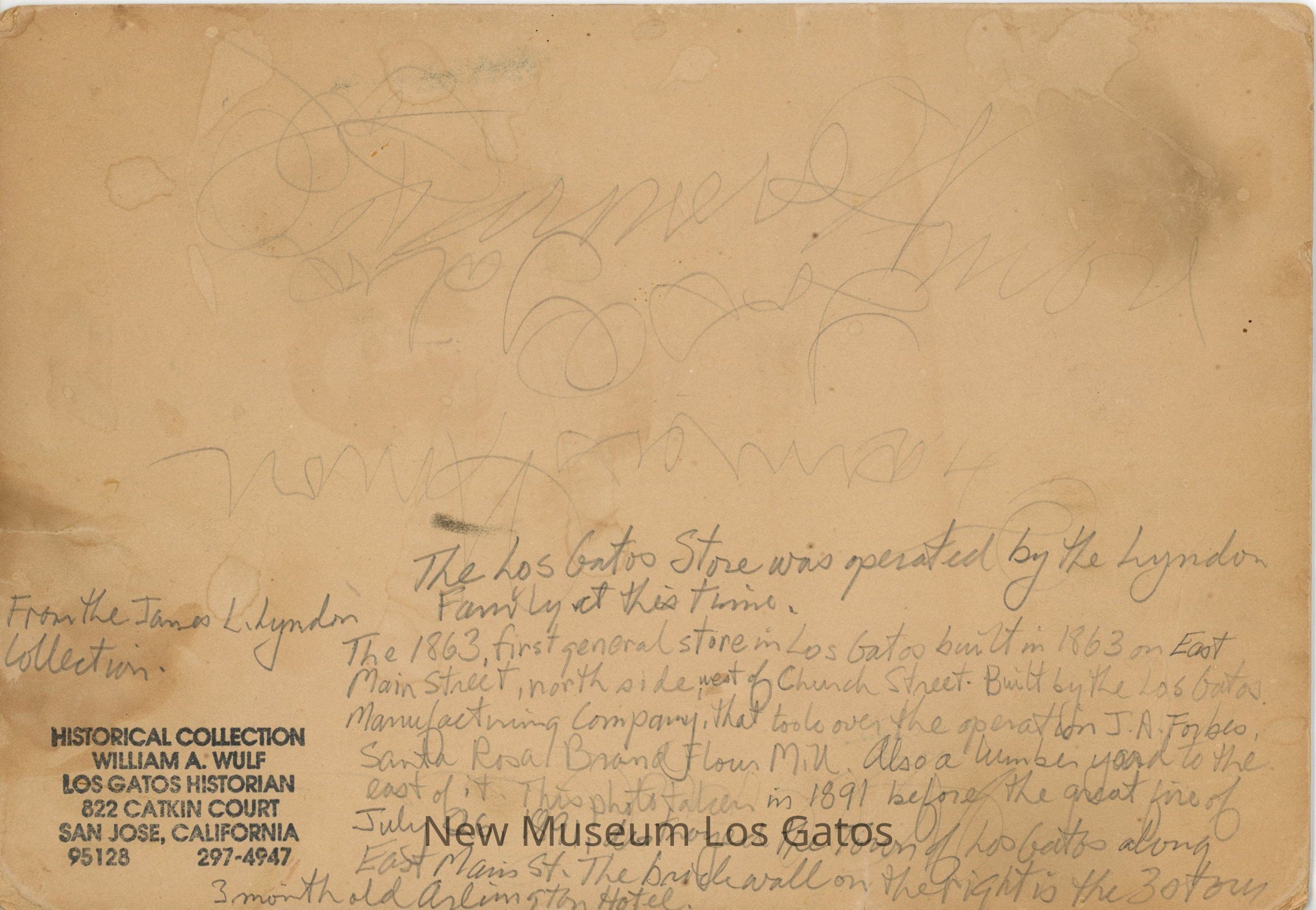 The Los Gatos Store was operated by the Lyndon Family at this time. The 1863 first general store in Los Gatos built in 1863 on East Main Street, north side, west of Church Street. Built by the Los Gatos Manufacturing Company that took over the operation J.A. Forbes Santa Rosa Brand Flour Mill. Also a lumber yard to the east of it. This photo taken in 1891 before the great fire of July 26, 1891 destroyed the Town of Los Gatos along East Main St. The brick wall on the right is the 3 story 3 month old Arlington Hotel.