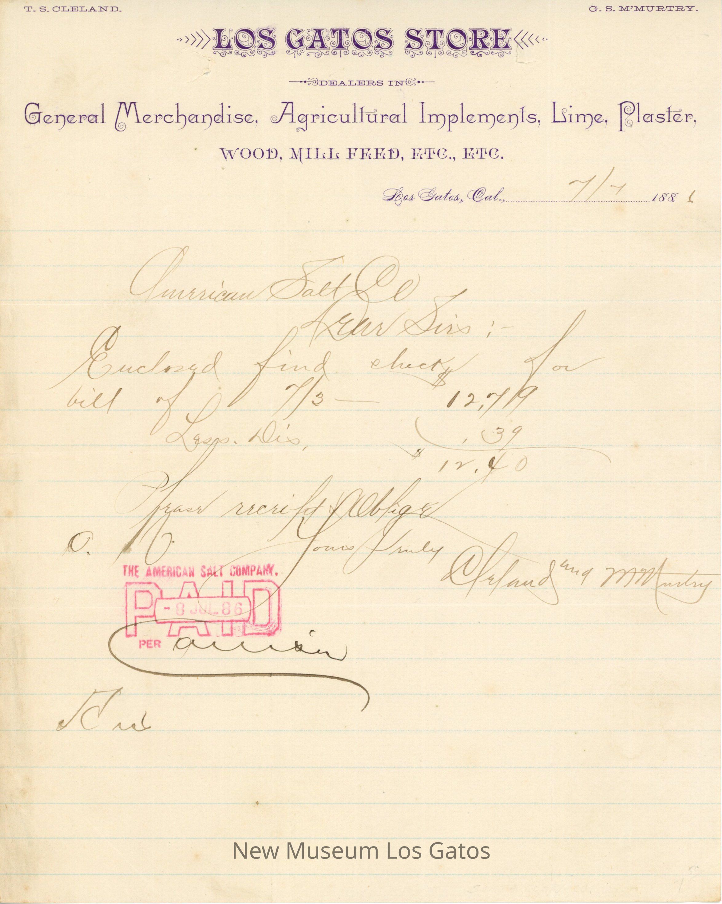 One lined piece of paper, with Los Gatos Store letterhead, addressed to the American Salt Company, from Cleveland and McMurtry, the proprietors of the Los Gatos Store. The letter addresses an enclosed check for their bill.Creator