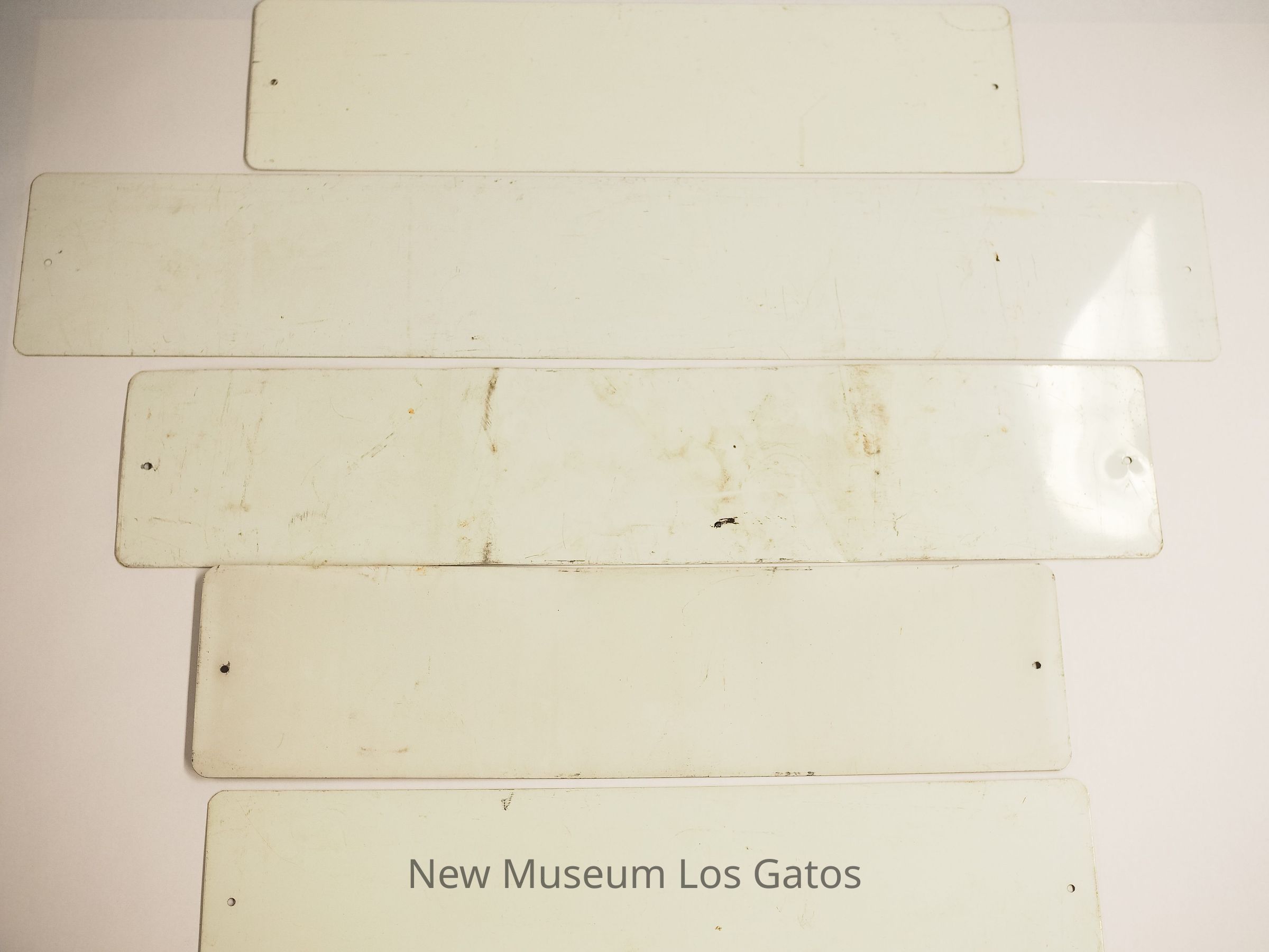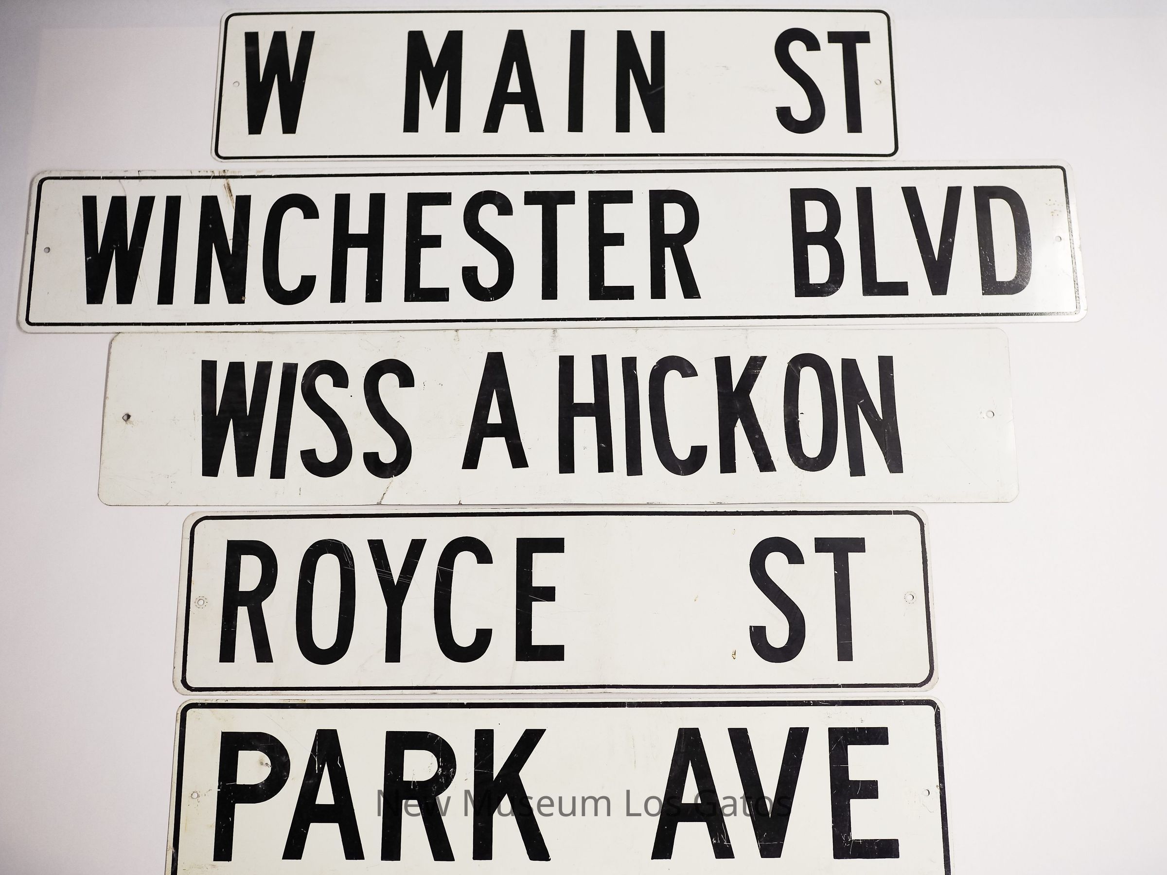 Five out-of-commission Los Gatos street signs. Each sign features a white background, with black lettering and a thin black line around the border.Collection