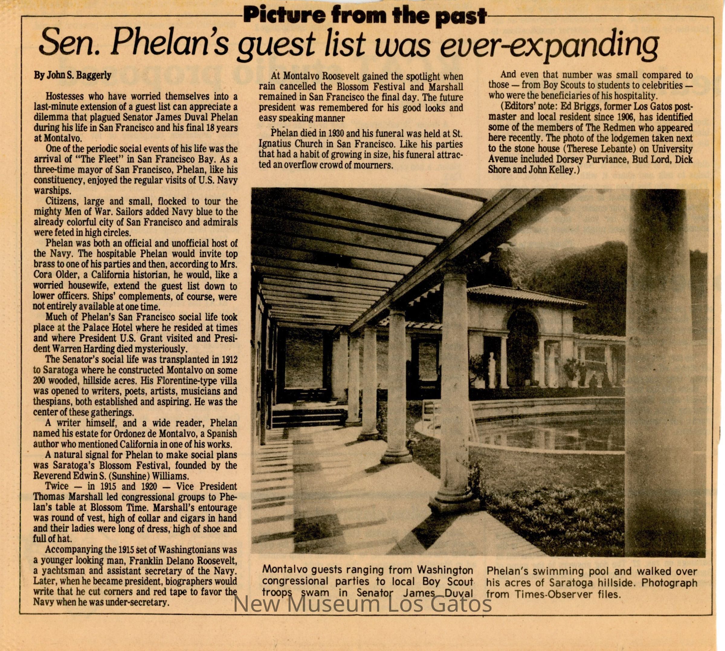 A newspaper clipping of a Los Gatos Times-Observer article on the extravagant parties held by Saratoga local and former Senator James Duval Phelan.Collection