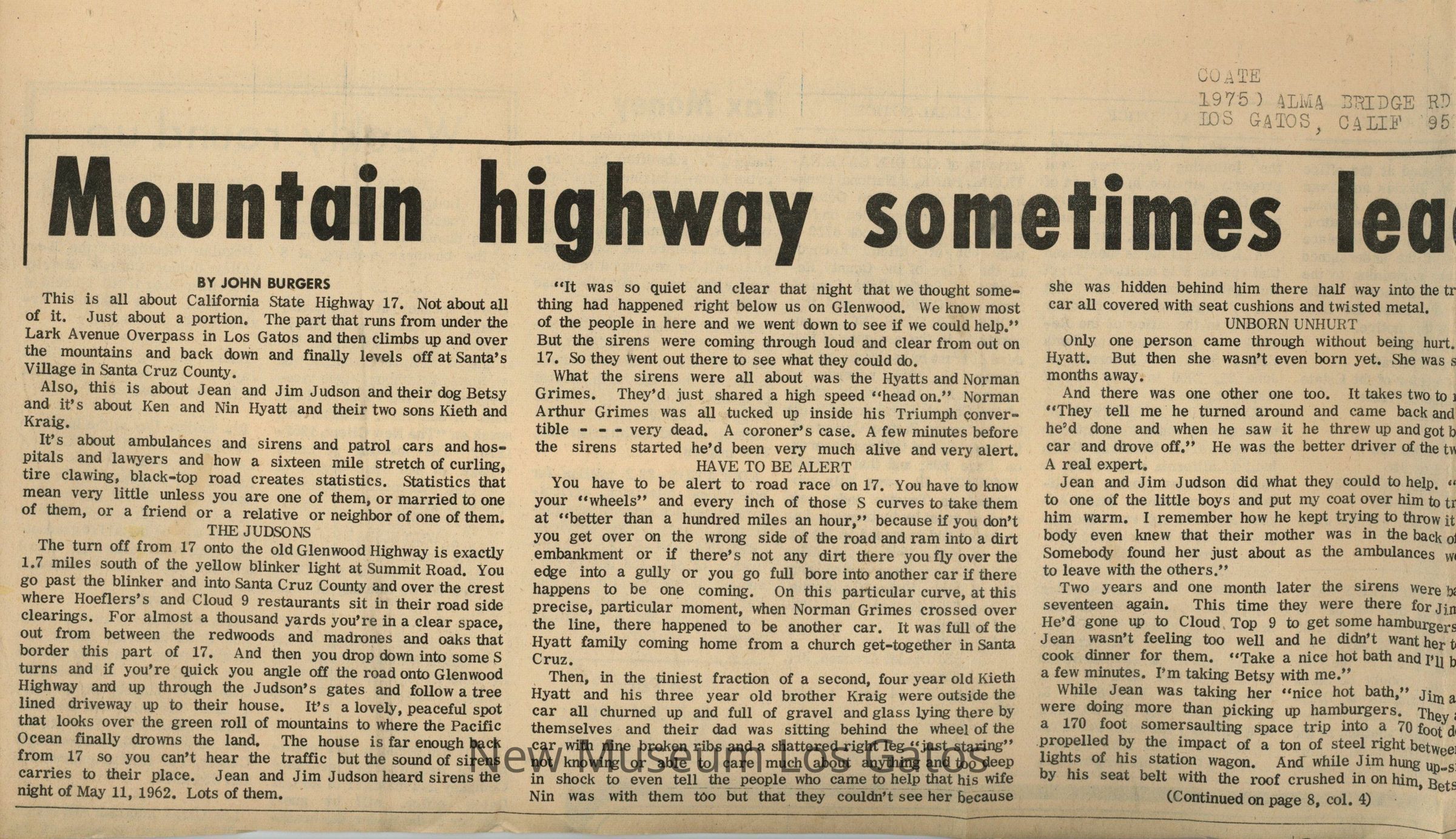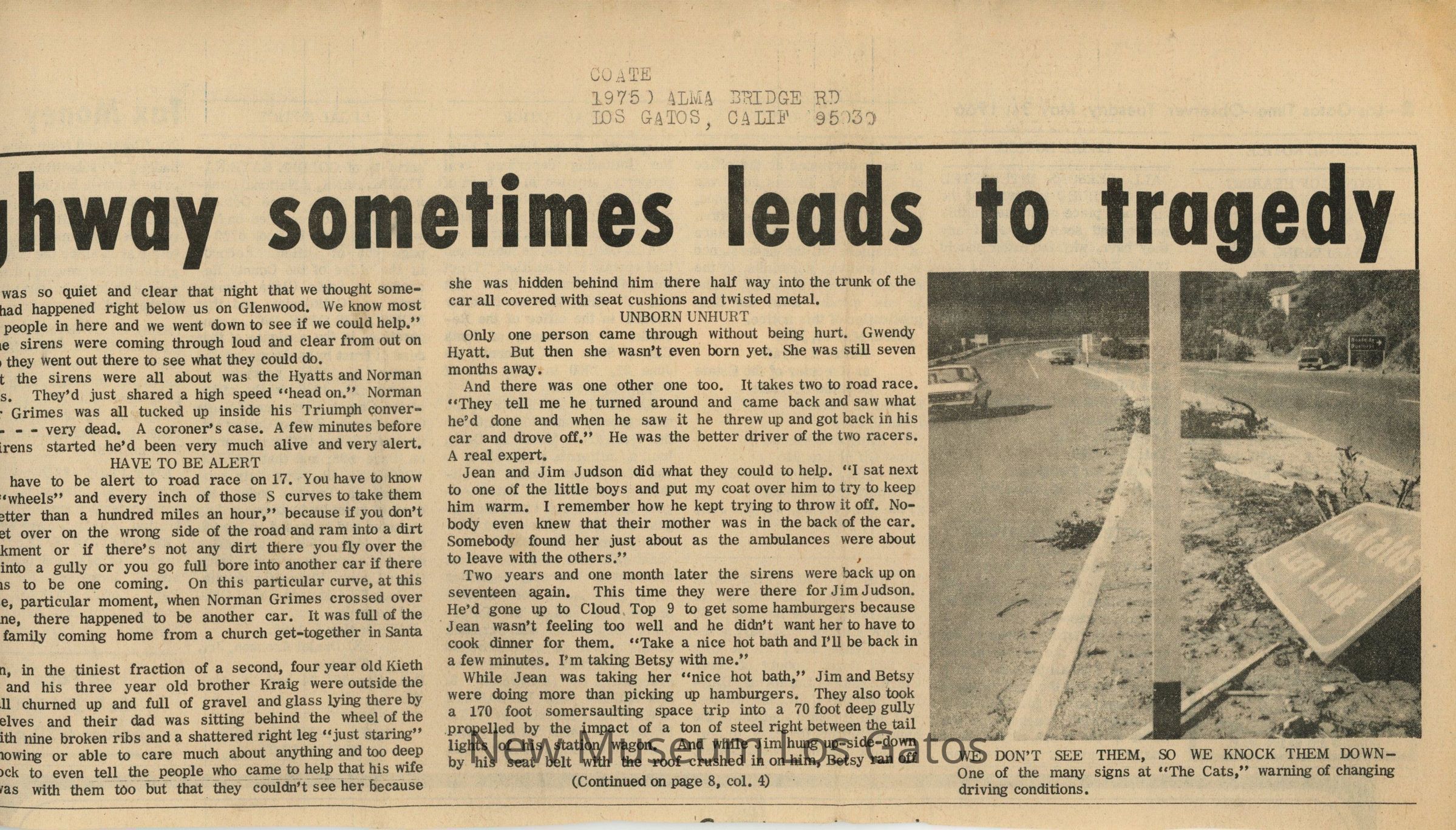 Strip of clipped newspaper, with a clipped article about the dangers of driving on Highway 17, which runs between Los Gatos and Santa Cruz, California.Collection