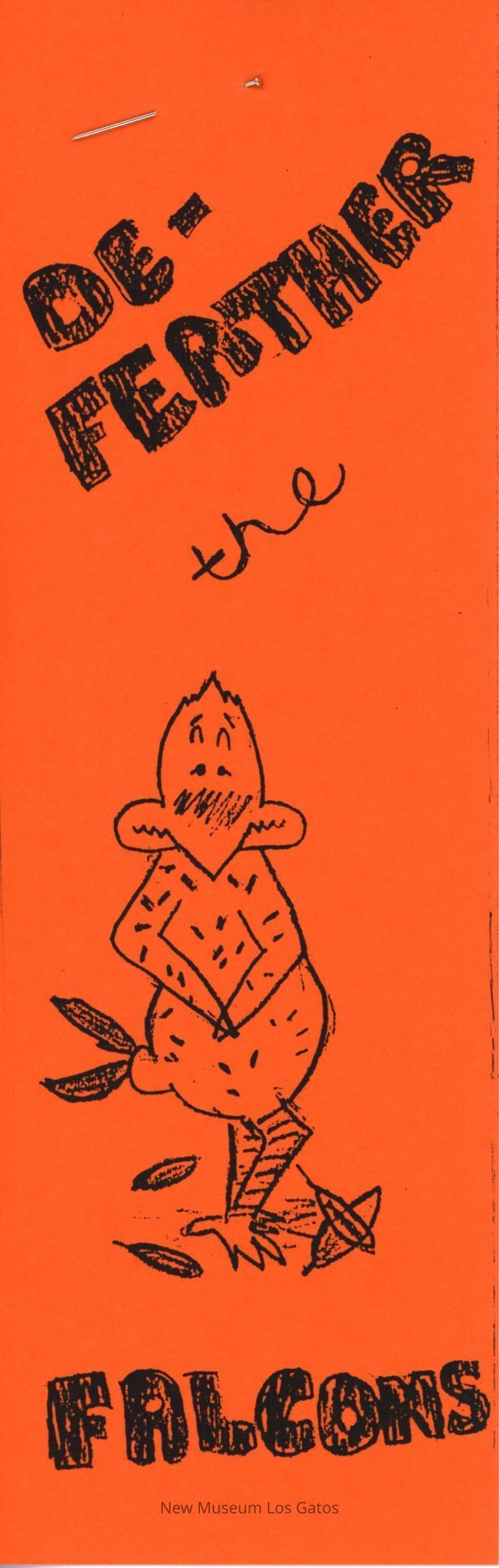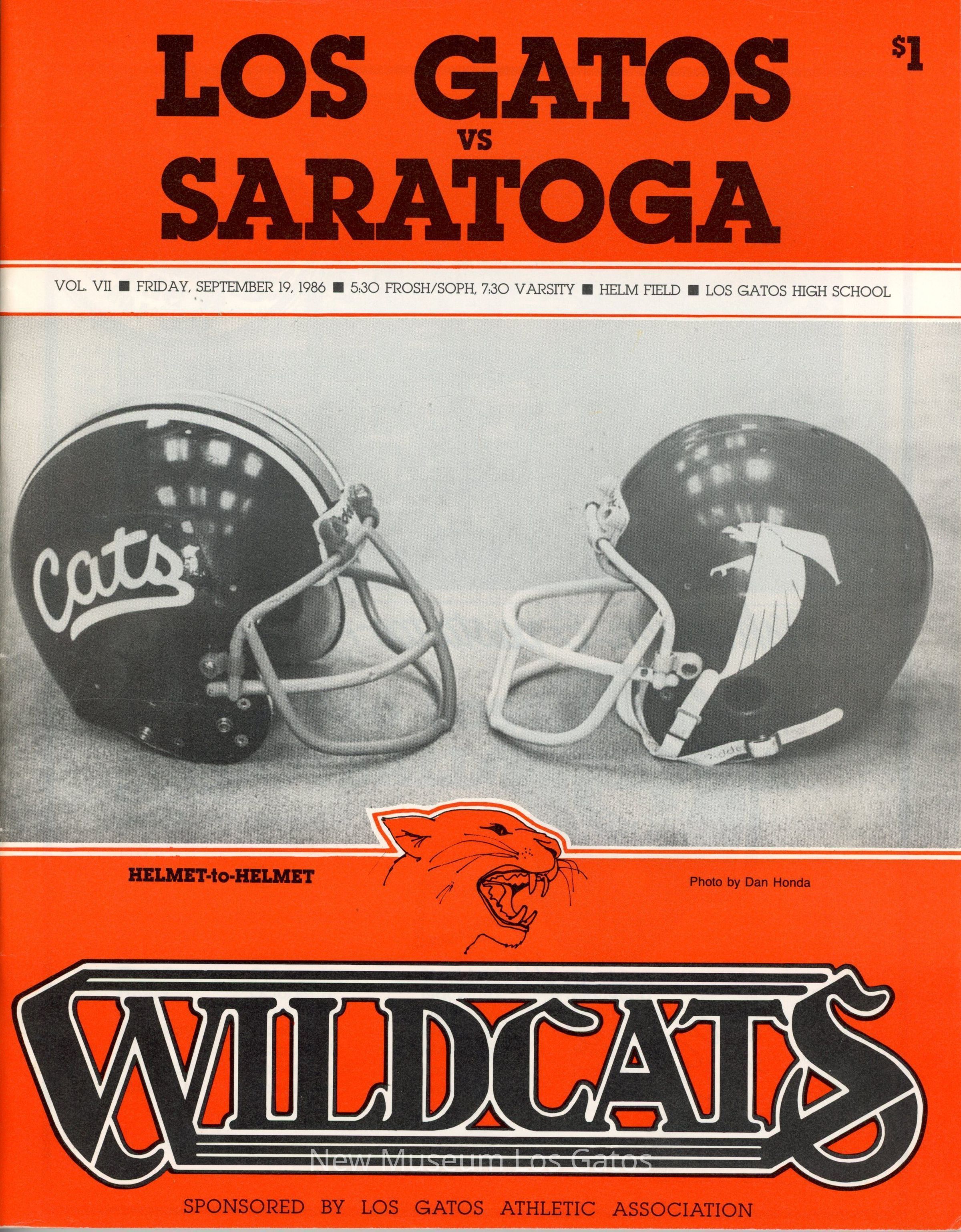 A football program for the Los Gatos/Saratoga football game on September 19, 1986. The program features photos and stories about the coaching staff, players, and cheerleaders, as well as league information and numerous advertisements. There is also a spirit flyer inside of the program, featuring an illustration of a de-feathered falcon.Collection