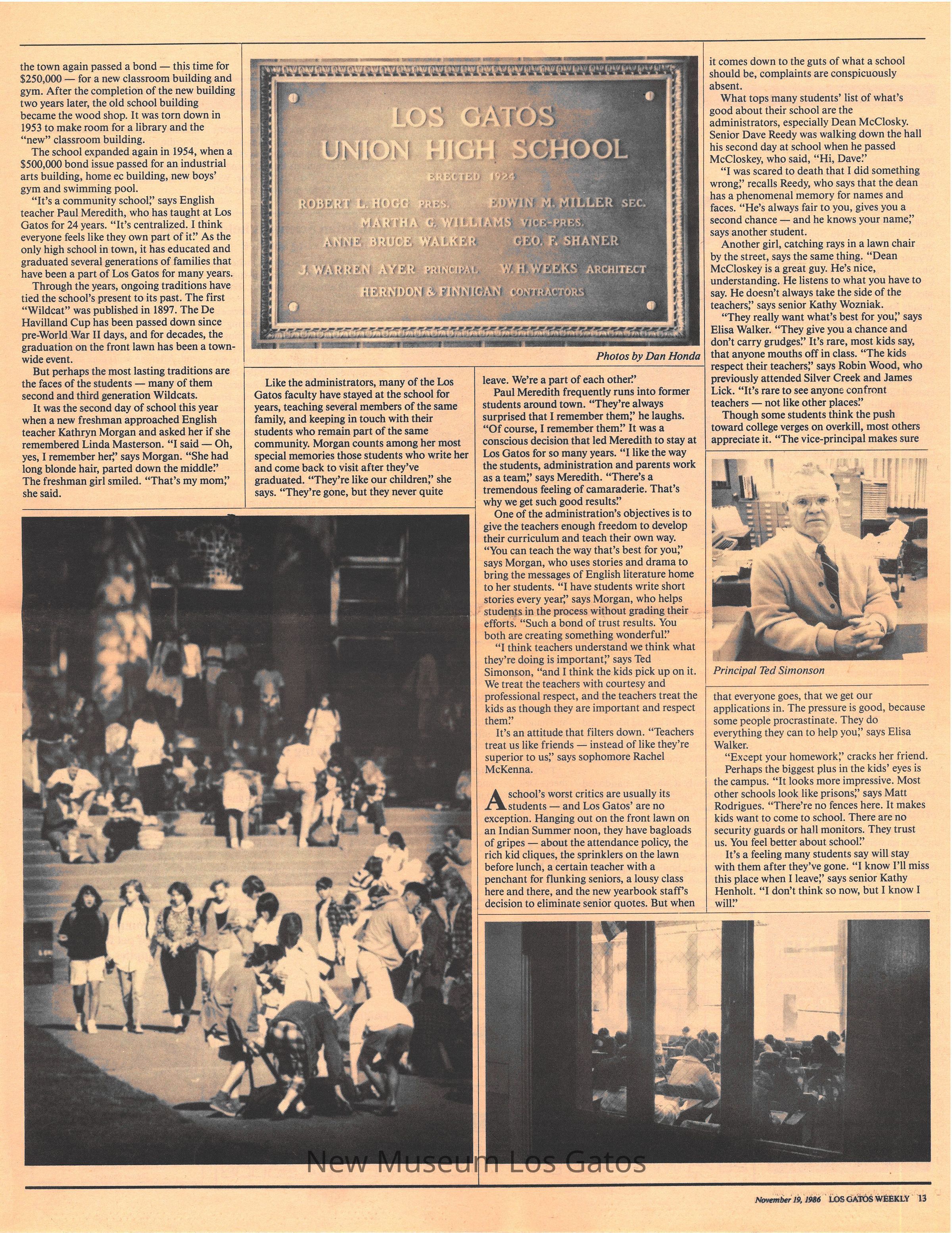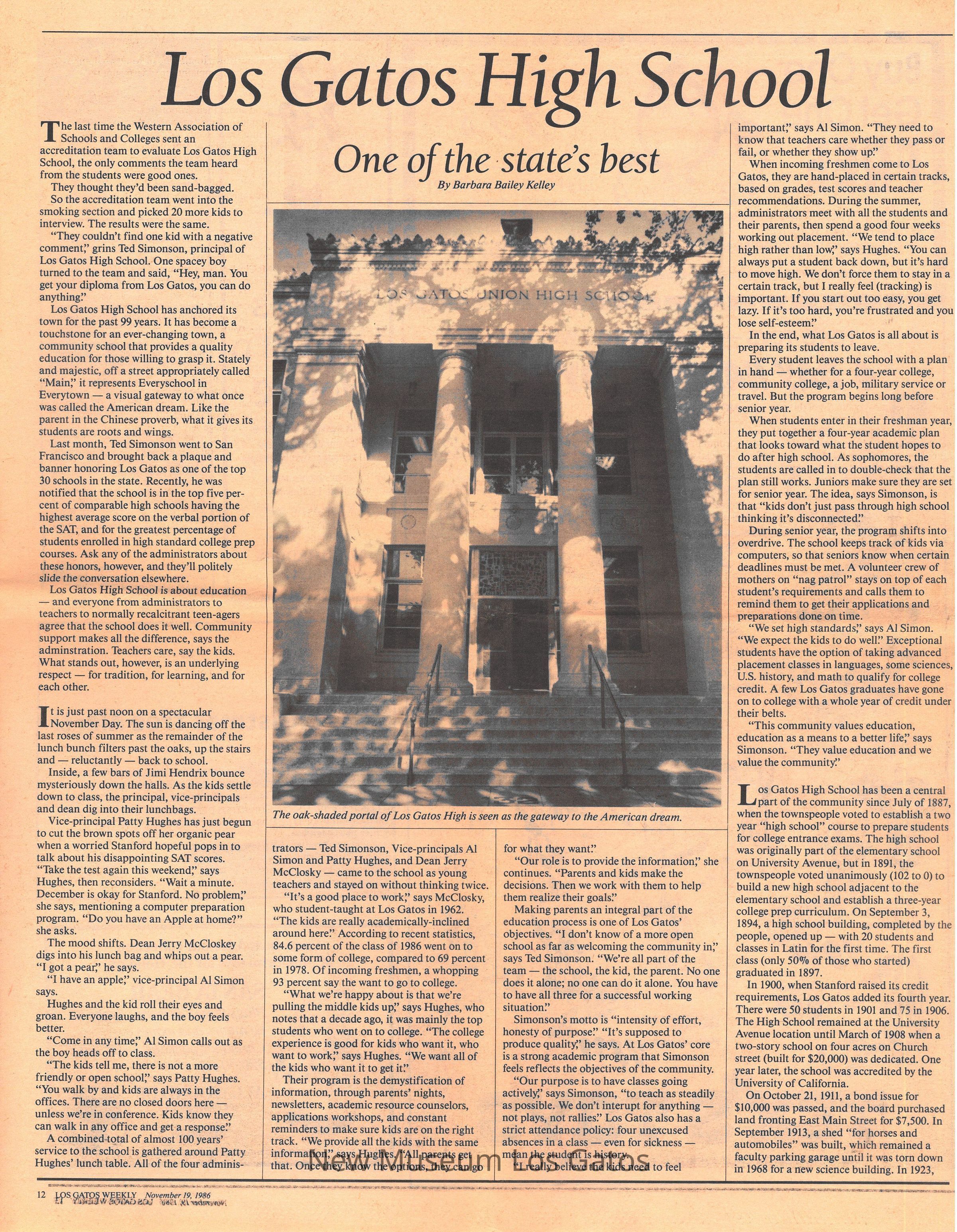 A partial copy of the Los Gatos Weekly, featuring an article about Los Gatos High school winning an award as one of the 30 best schools in the state.Collection