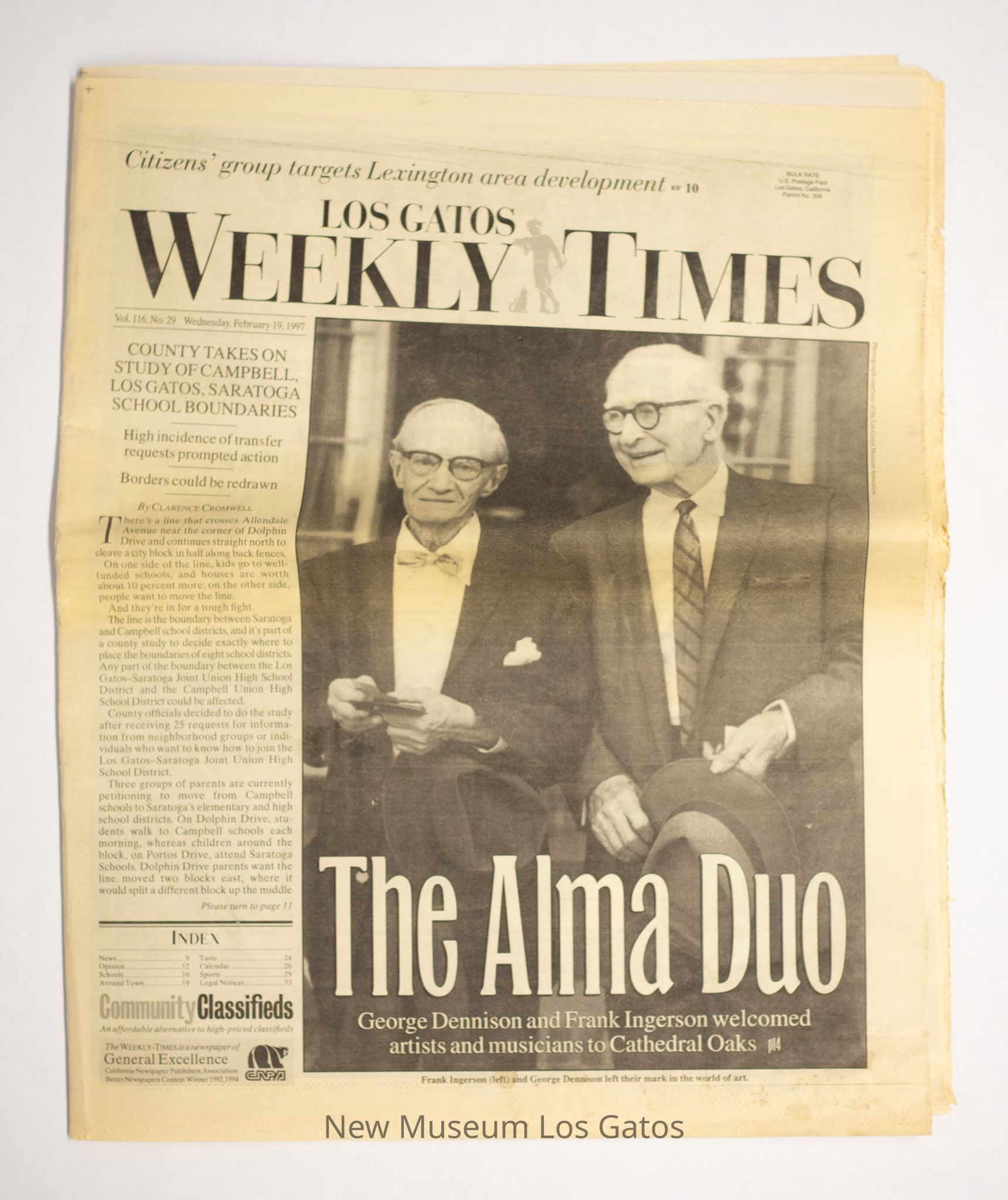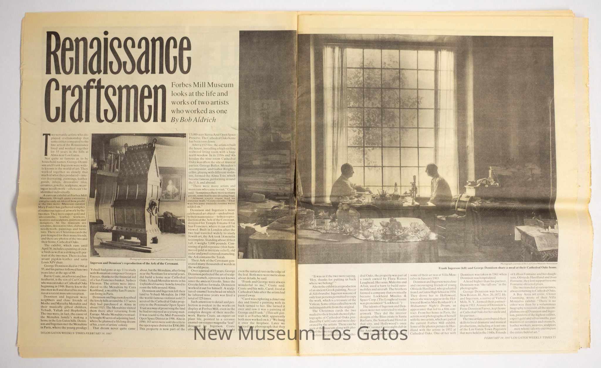 Los Gatos Weekly-Times from February 19, 1997. The particular article preserved is one about Frank Ingerson and George Dennison, and an exhibit of their work at the Forbes Mill Museum in Los Gatos, California. The article includes a detailed account of their lives and work, and photographs.Collection