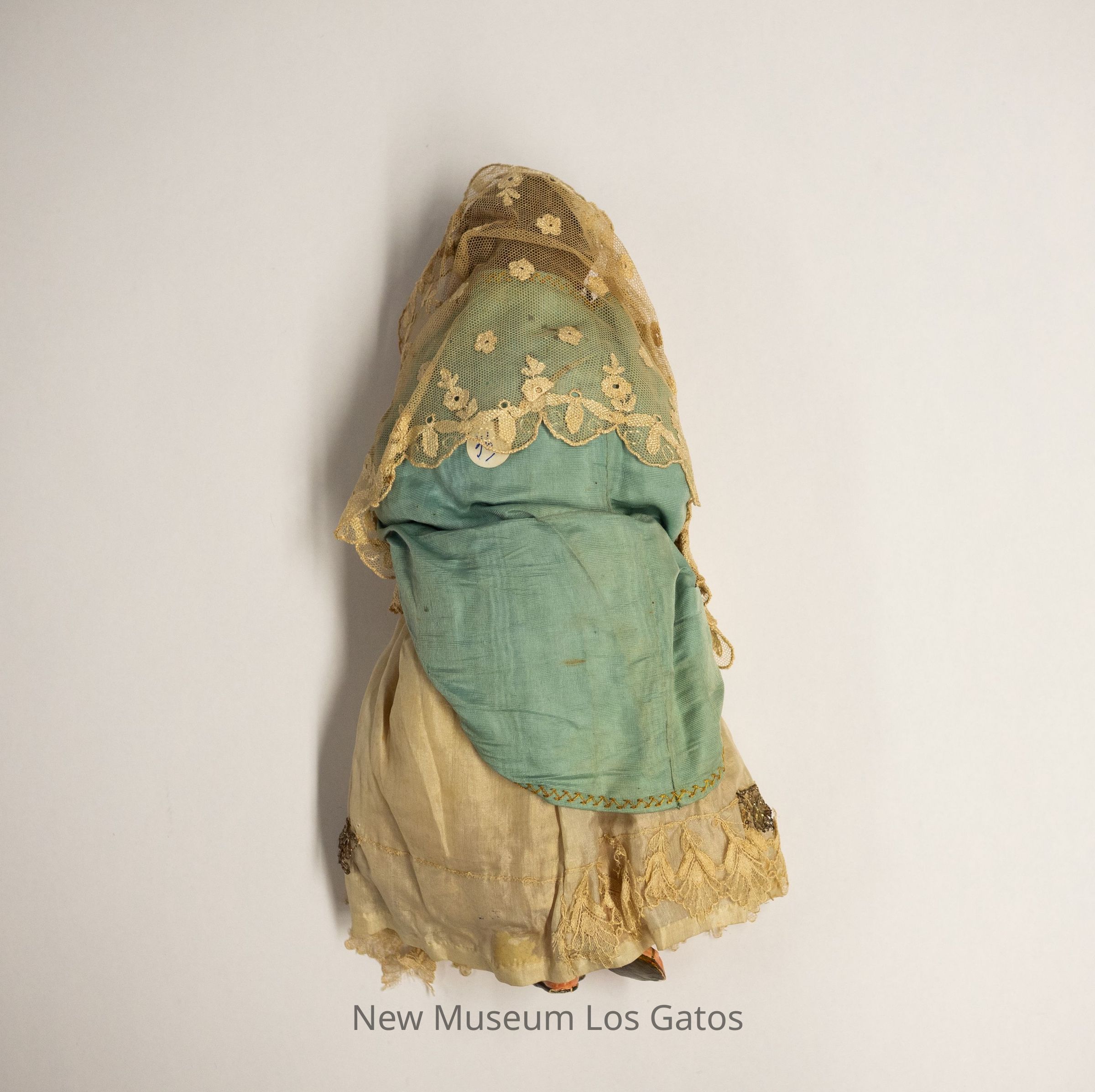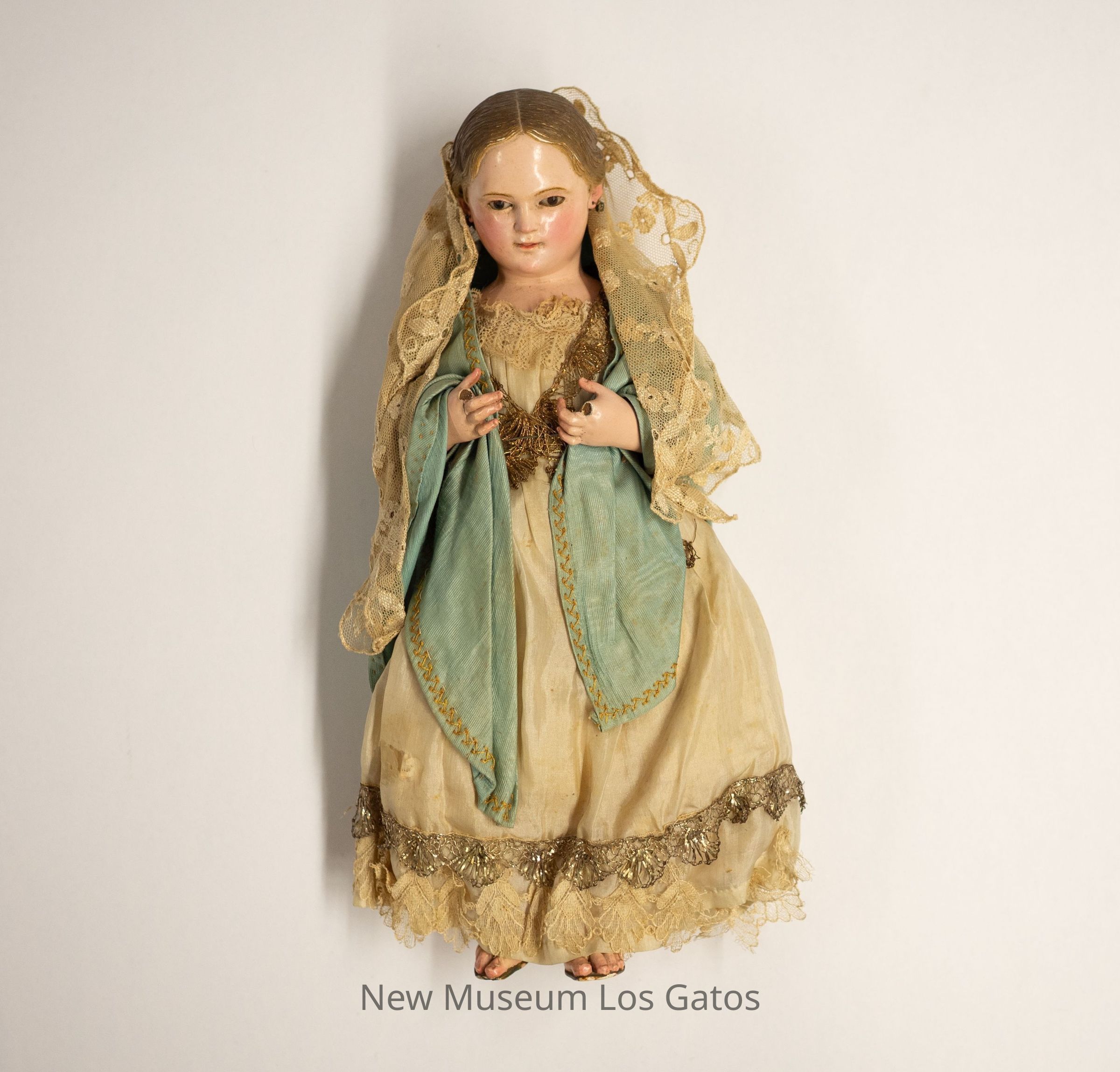 A doll of the Madonna, or Virgin Mary. The doll is wearing a tan satin dress with lace and metal trim, and over the dress is wearing a teal shawl with embroidered tan trim. She is also wearing a tan lace shawl over her head. The doll's features are painted on, as is her hair and her sandals.Collection