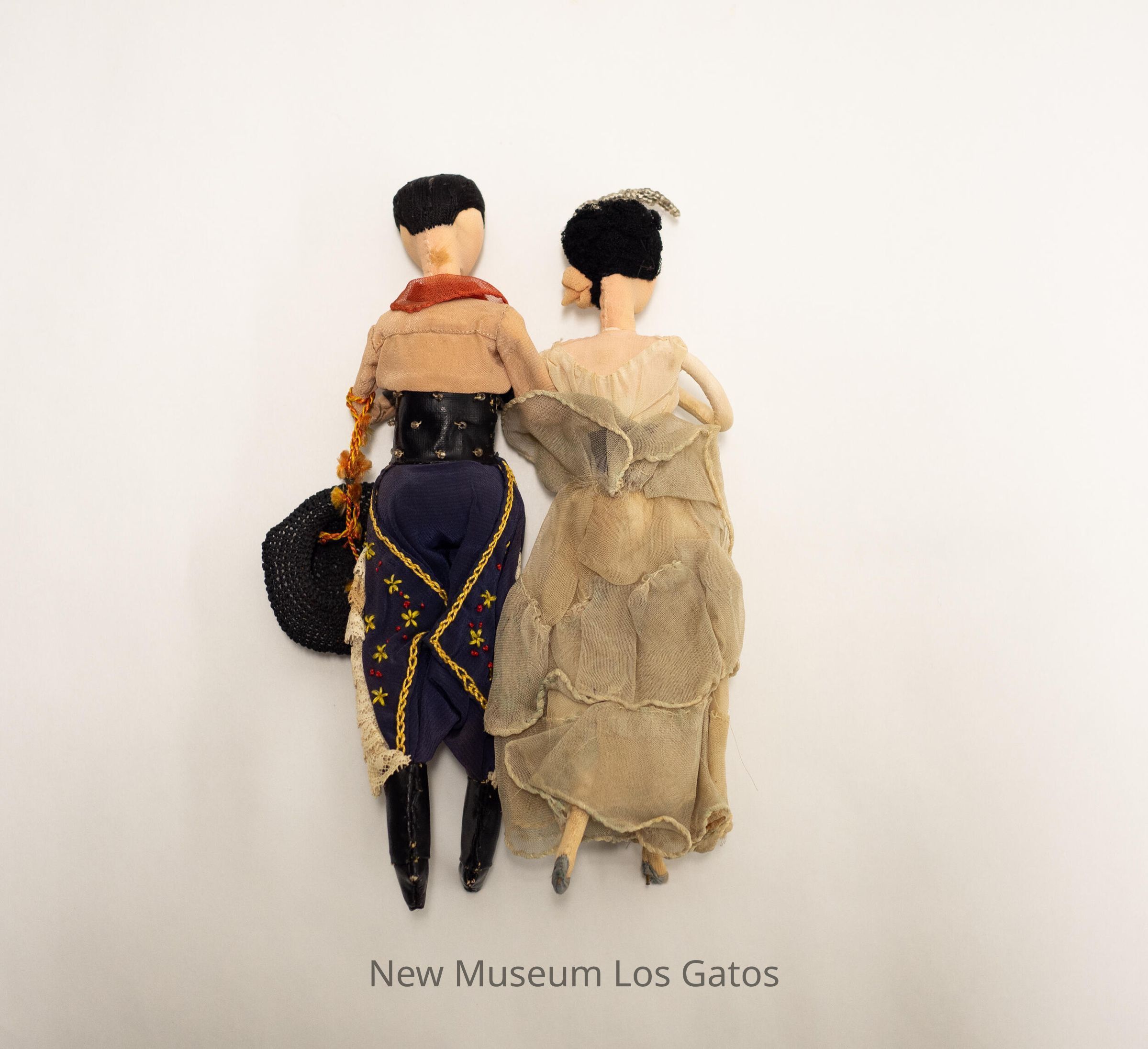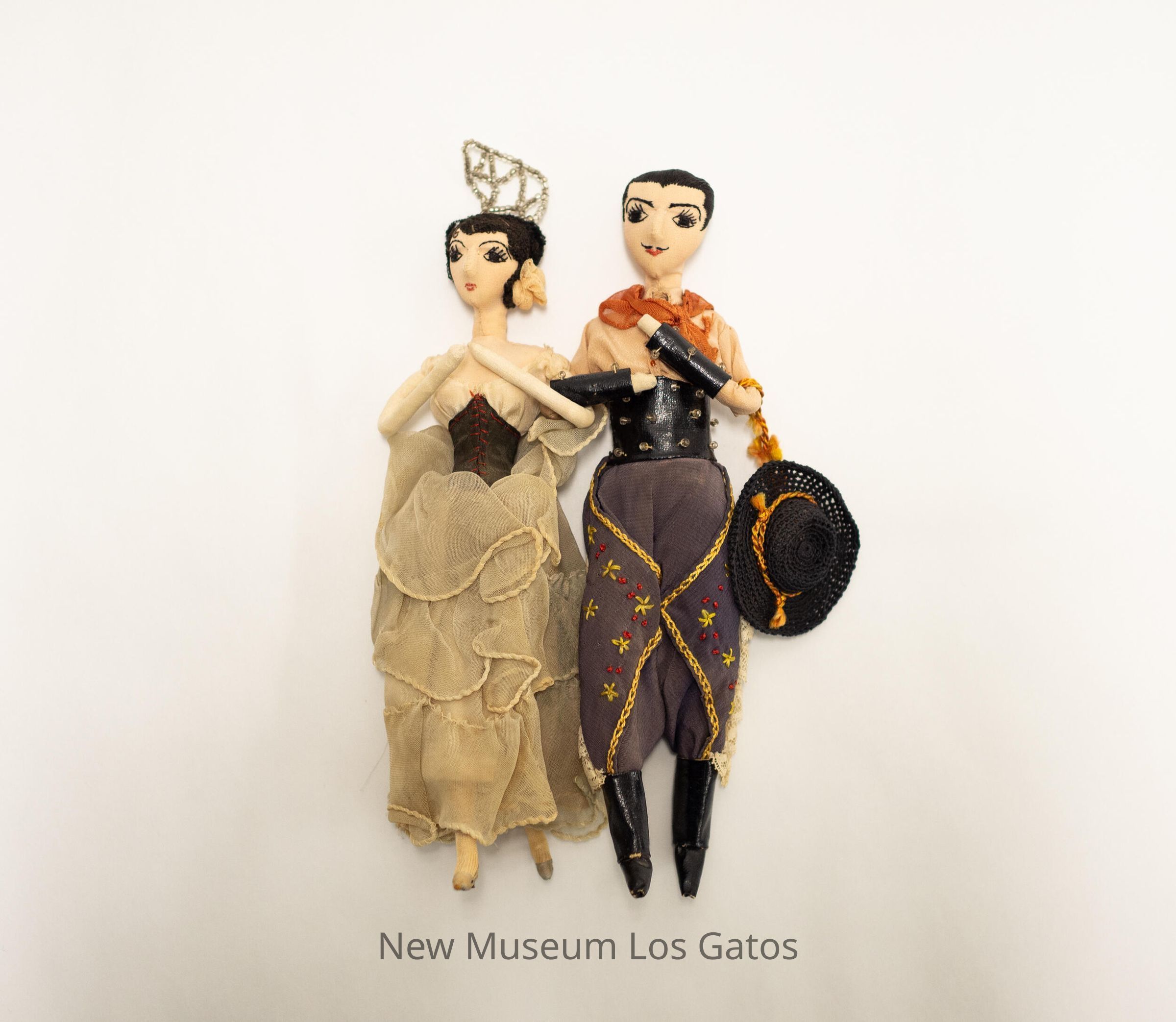 A male and female dancer, with their arms intertwined. The male doll is wearing black boots, dark gray pants with lace and yellow, red, and gold embroidery, a black belt, a cream shirt, and a red scarf around his neck. There is a black hat with orange and yellow string around the hat, and attaching the hat to the male's right (viewer's) harm. The female doll is wearing a light gray voluminous skirt, a dark gray bodice, and cream colored shirt. She also has a light pink flower in her hair, and is wearing a silver headpiece made out of beads.Collection