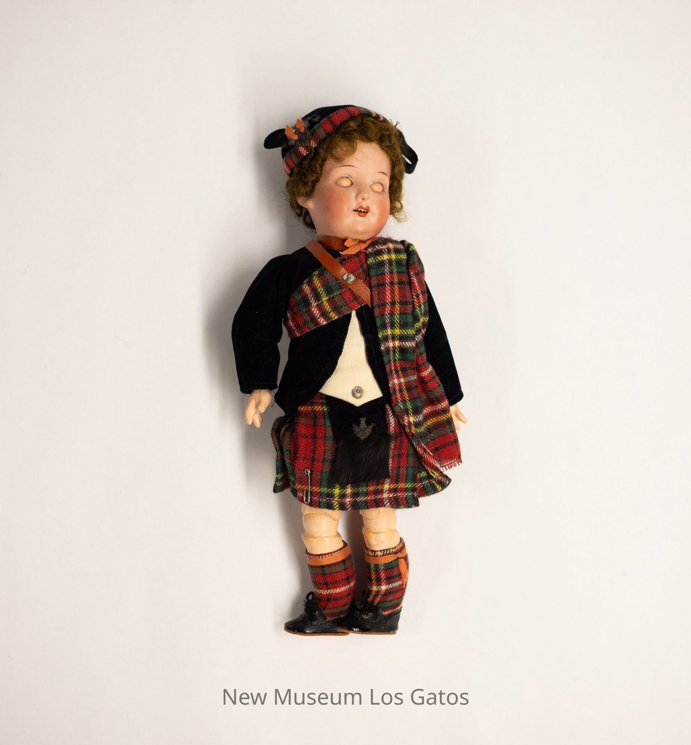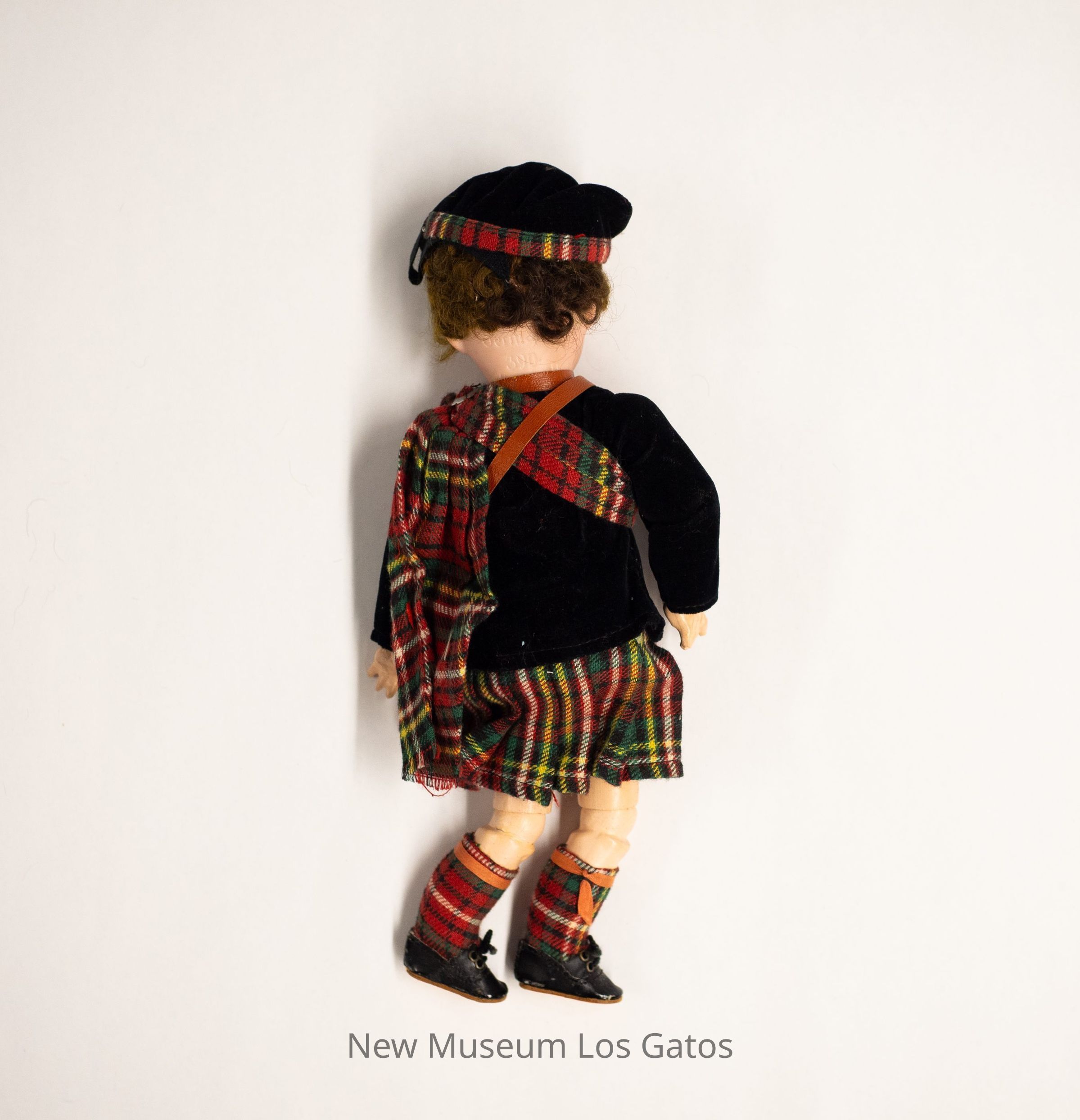 A bisque and composite male doll, wearing traditional Scottish clothing. The doll's body is made out of porcelain, and the legs bend at the knees while the eyes open and close as the doll is moved up and down. He is wearing black shoes, plaid stockings, a plaid kilt with a black sporran, a white shirt, black coat, and a fly plaid. He has brown curly hair underneath a black hat with plaid trim.Collection