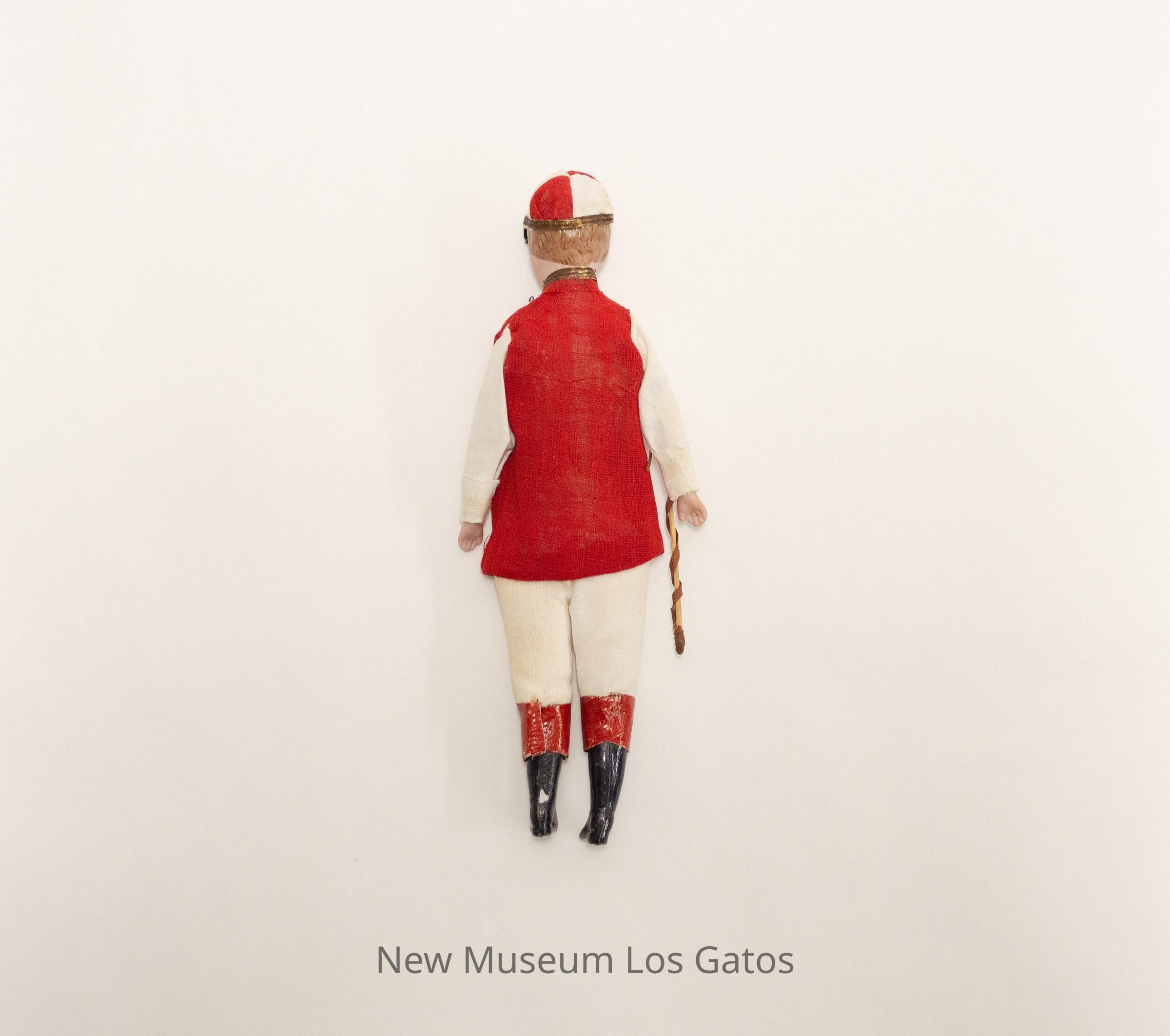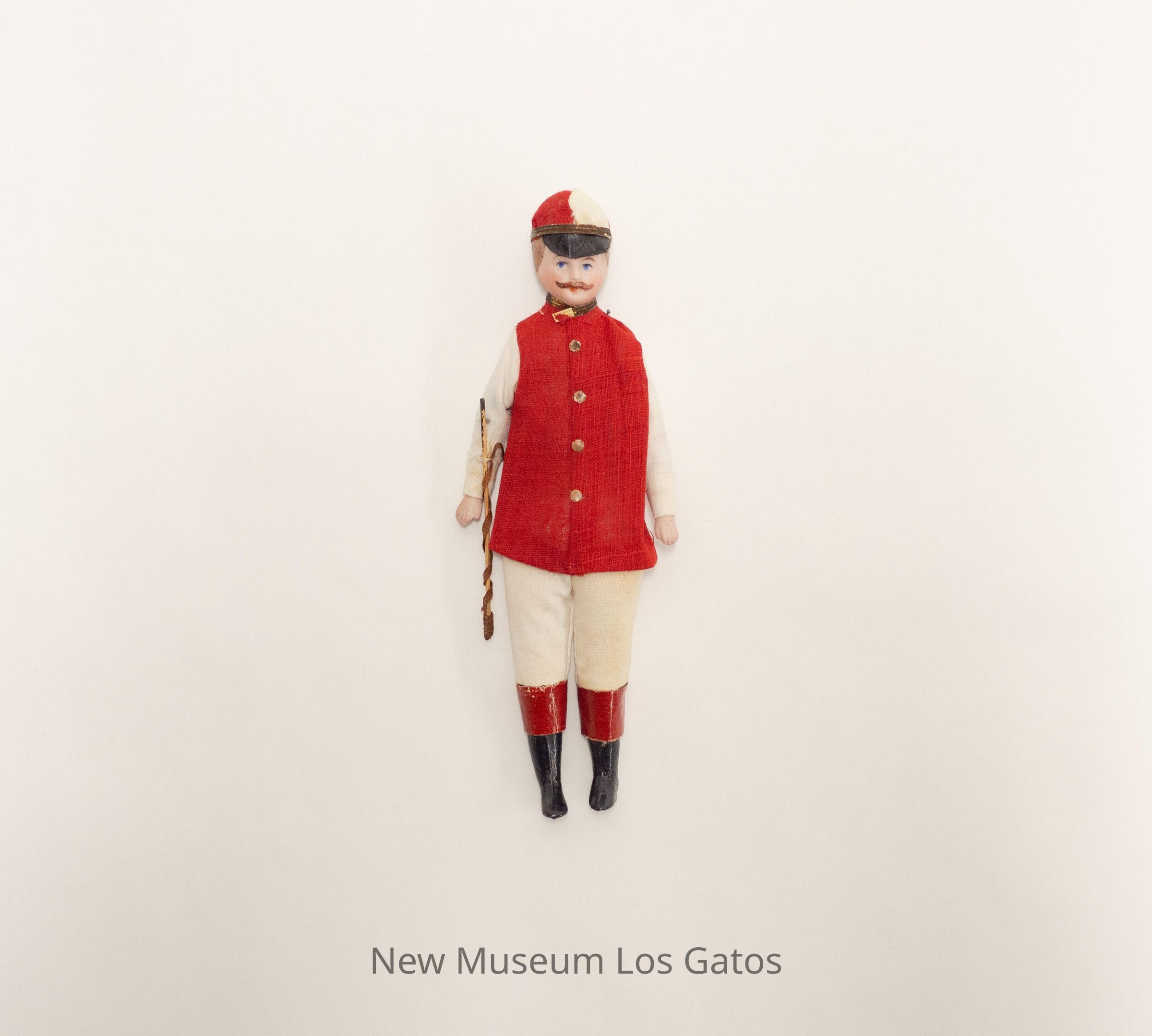 A small, male jockey doll. The jockey is wearing black boots with red cuffs, white pants, a red shirt with white sleeves, and a red-and-white hat with a black brim. The jockey has brown hair and a brown mustache, and is carrying a brown crop.Collection