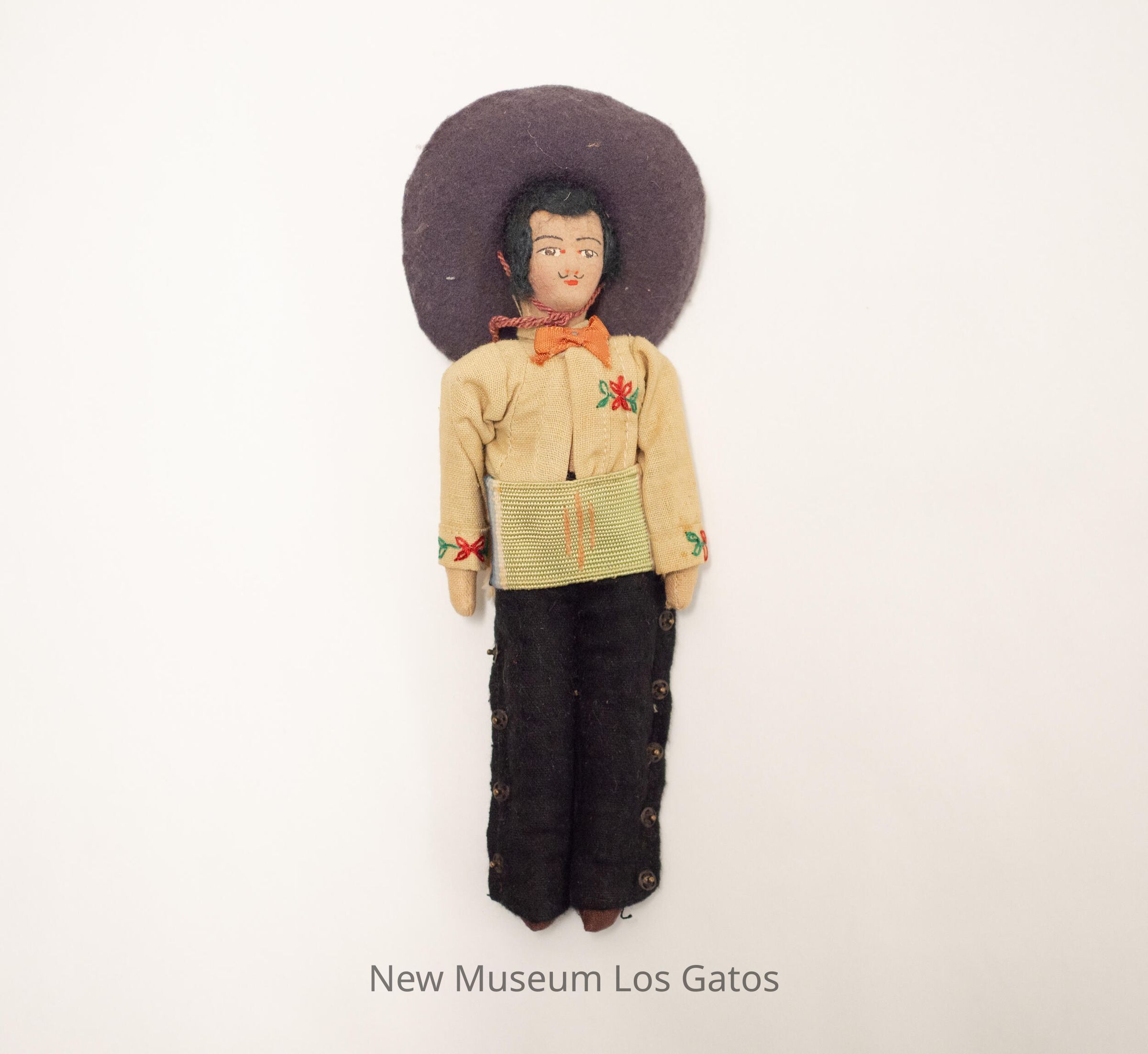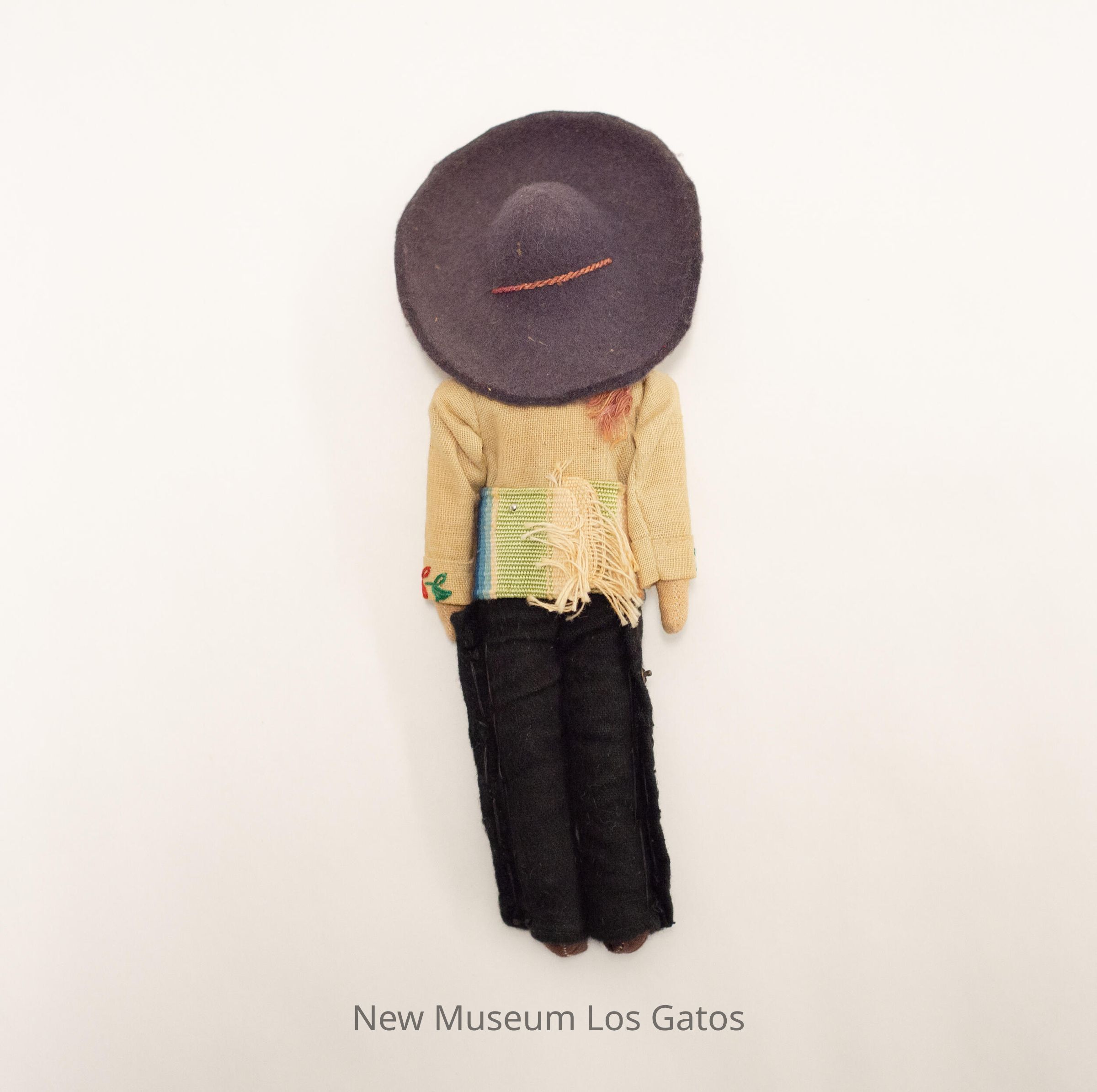 A male doll, wearing brown shoes and black pants with decorative metal snaps on the sides. The doll has a green, cream, and blue blanket with fringe around its waist, a tan shirt with red and green flower detailing, and a orange/red bow at the top of the shirt. It is also wearing a large brown/purple hat secured to its head with a red string.Collection