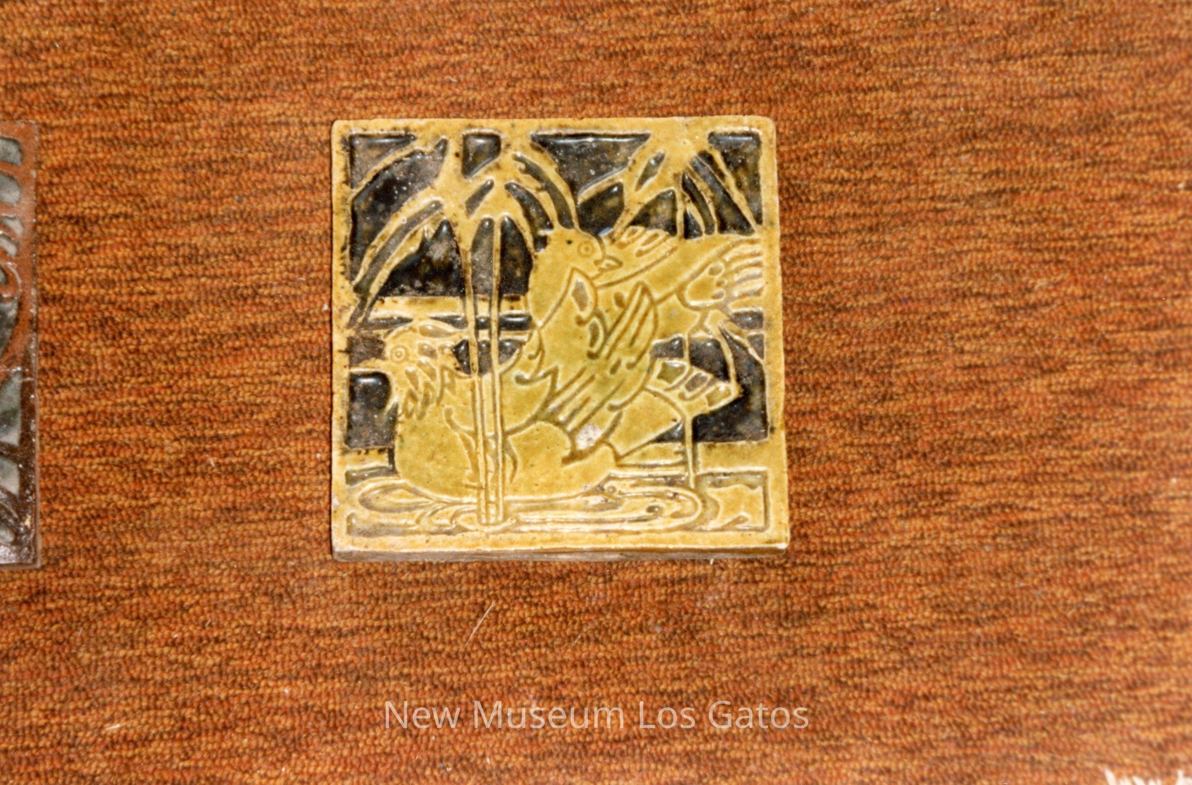 A color photograph featuring a decorative Mandarin Duck tile. The tile features yellow/green birds with a dark background. The tile is on a red/brown carpet, and part of another tile is visible along the left edge of the image.