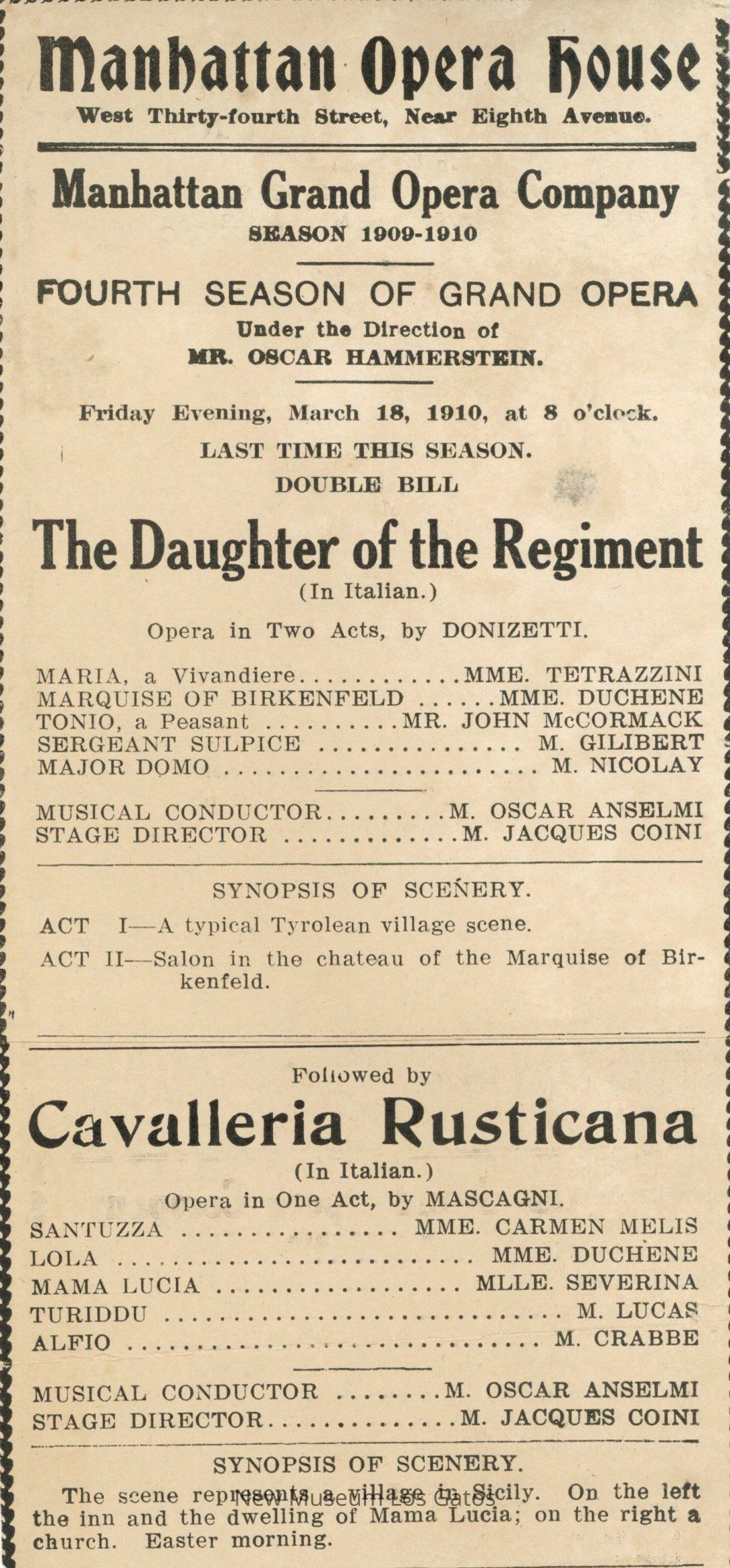 A Single-page paper program for the opera "The Daughter of the Regiment" and "Cavalleria Rusticana," dated March 18, 1910. The program includes a list of the cast and directors. The bottom portion of the paper is glued to the larger piece.Collection