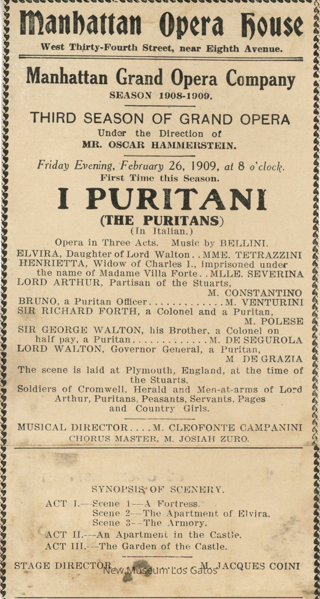 A single-page paper program for the opera "I Puritani," dated February 26, 1909. The program includes a list of the cast, synopsis, setting, and directors.Collection