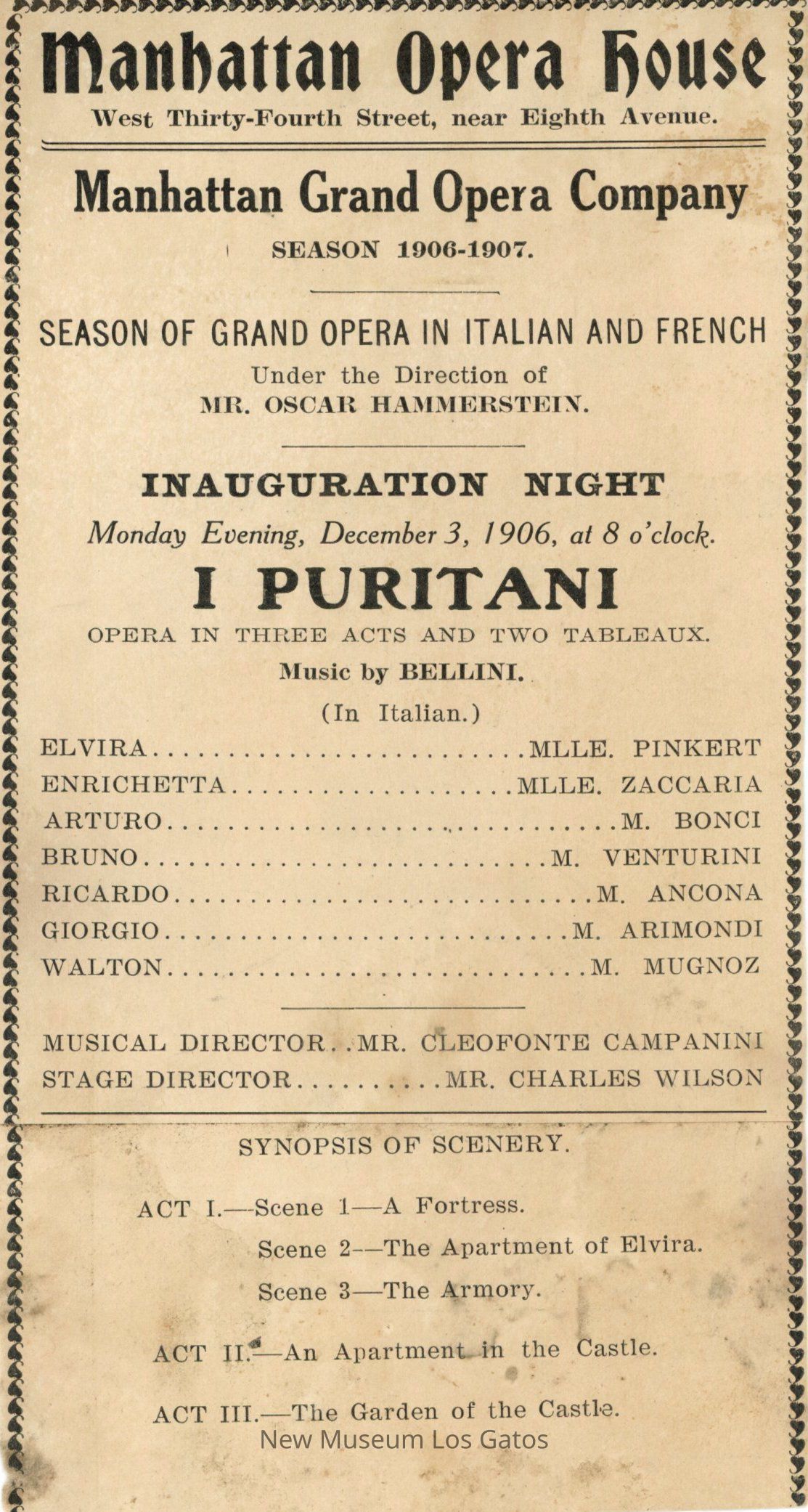 A single-page paper program for the opera "I Puritani," dated December 3, 1906. The program includes a list of the cast, synopsis, setting, and directors.Collection