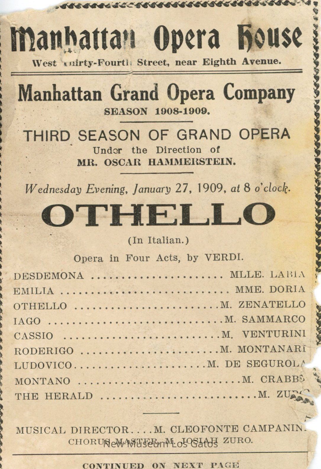 Single-page paper program for the opera "Othello," dated January 27, 1909. The program includes a list of the cast and directors.Collection