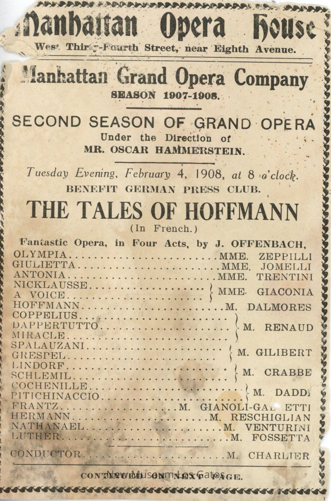 Single-page paper program for the opera "The Tales of Hoffmann," dated February 4, 1908. The program includes a list of the cast and directors.Collection