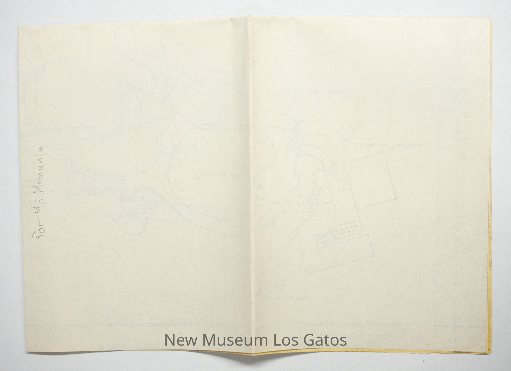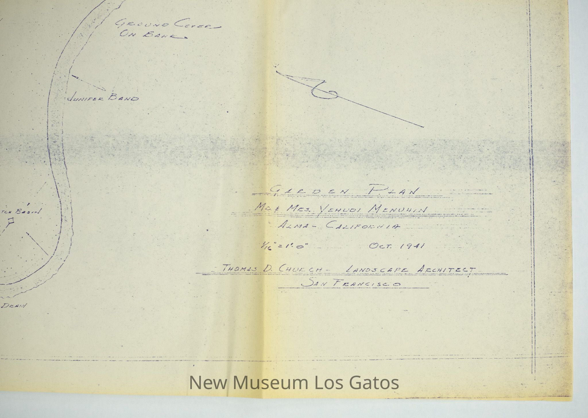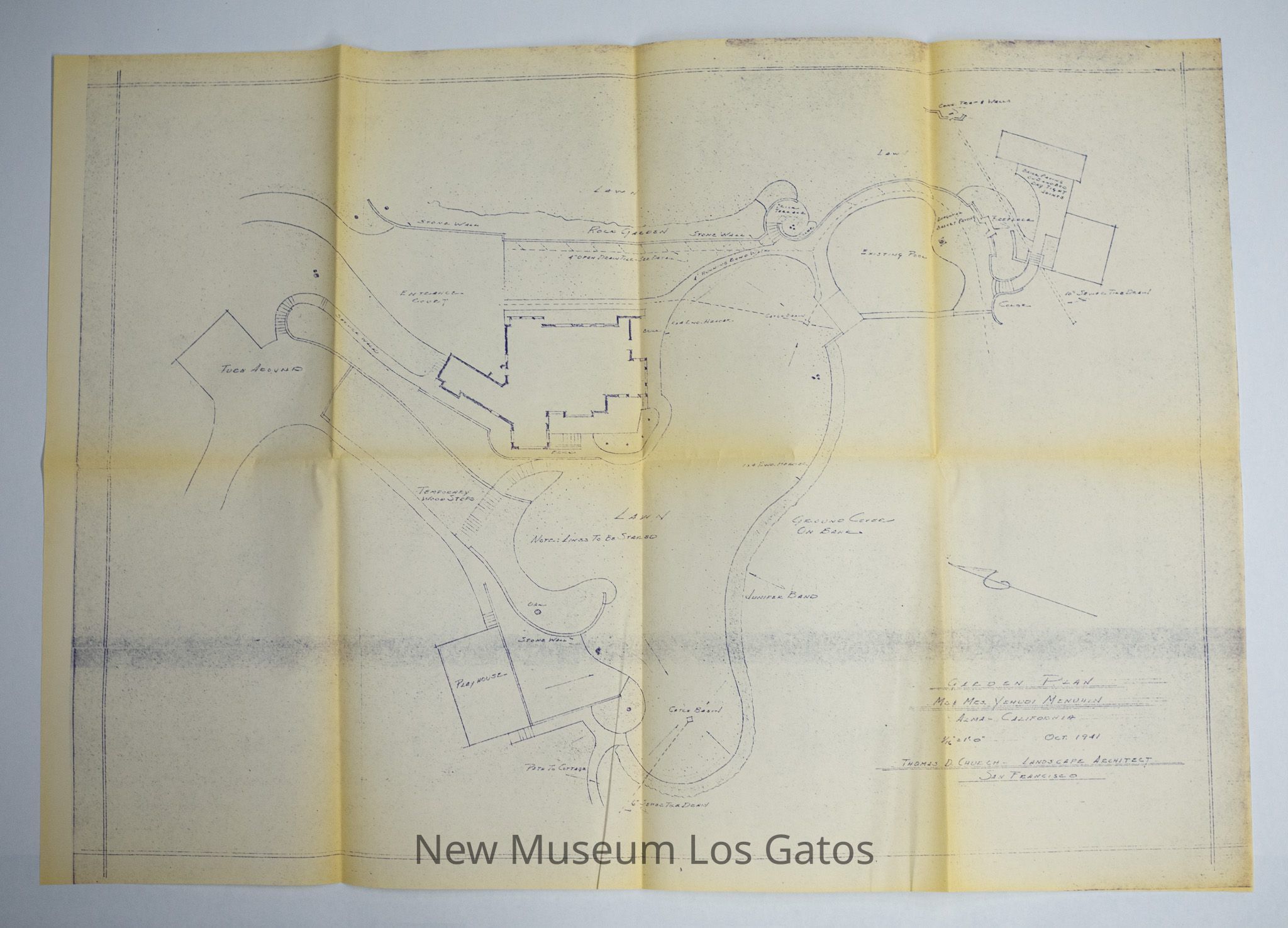 A large-scale photocopy of a hand-drawn map and garden plan for the estate of Mr. and Mrs. Menuhin, by landscape architect Thomas D. Church. The map depicts the footprint of the home, estate, roads/paths, and surrounding structures.
