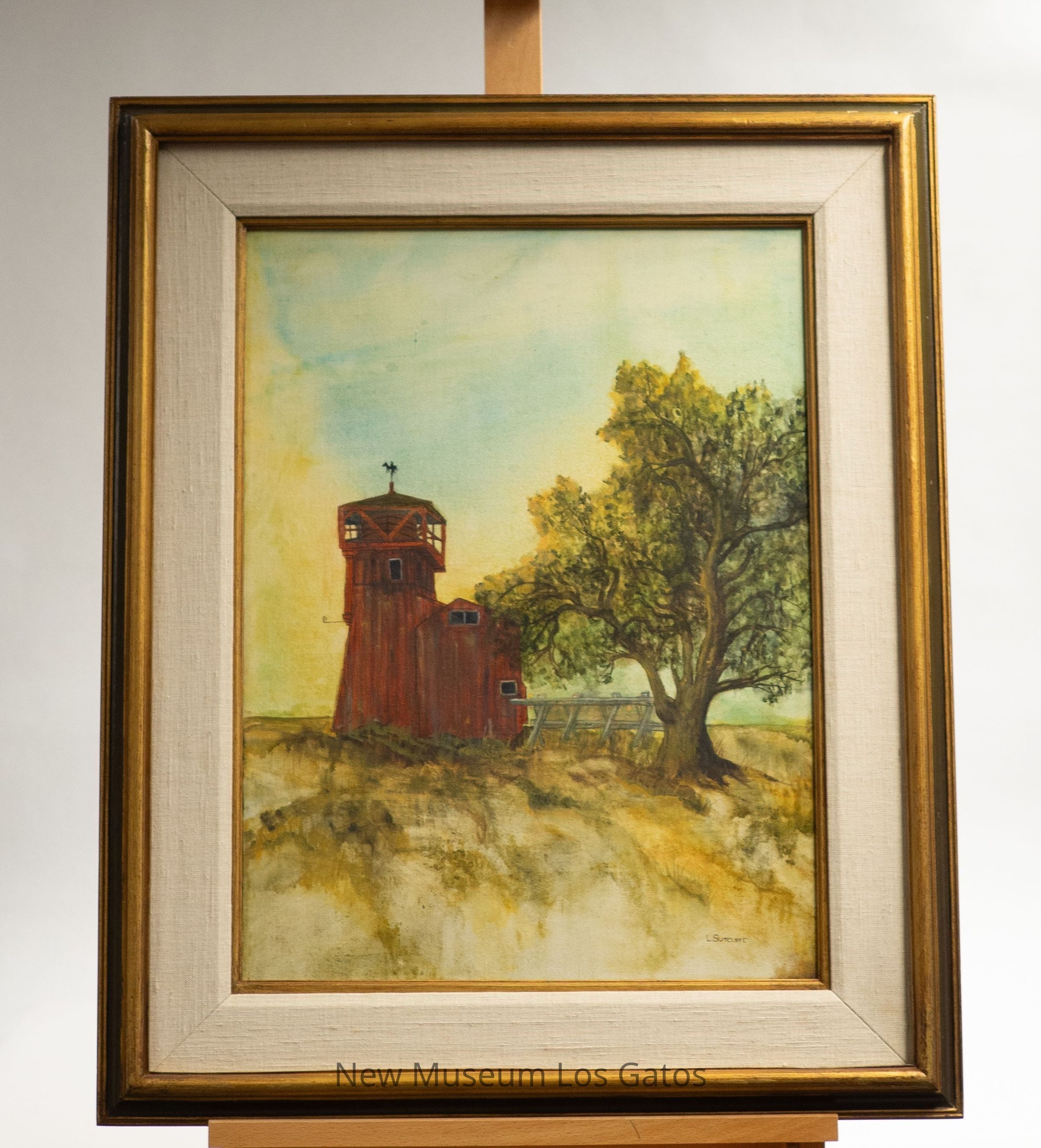 A framed oil painting of Maria's Berry Farm in Los Gatos, California. The painting features a red water tower/barn structure in the center-left of the composition, with a large tree in the center-right. The sky is a mix of blue, yellow, and green, while the ground hints a green/brown vegetation. The canvas is framed and matted, with a wooden frame that has been painted gold and a white fabric mat.Type of Painting