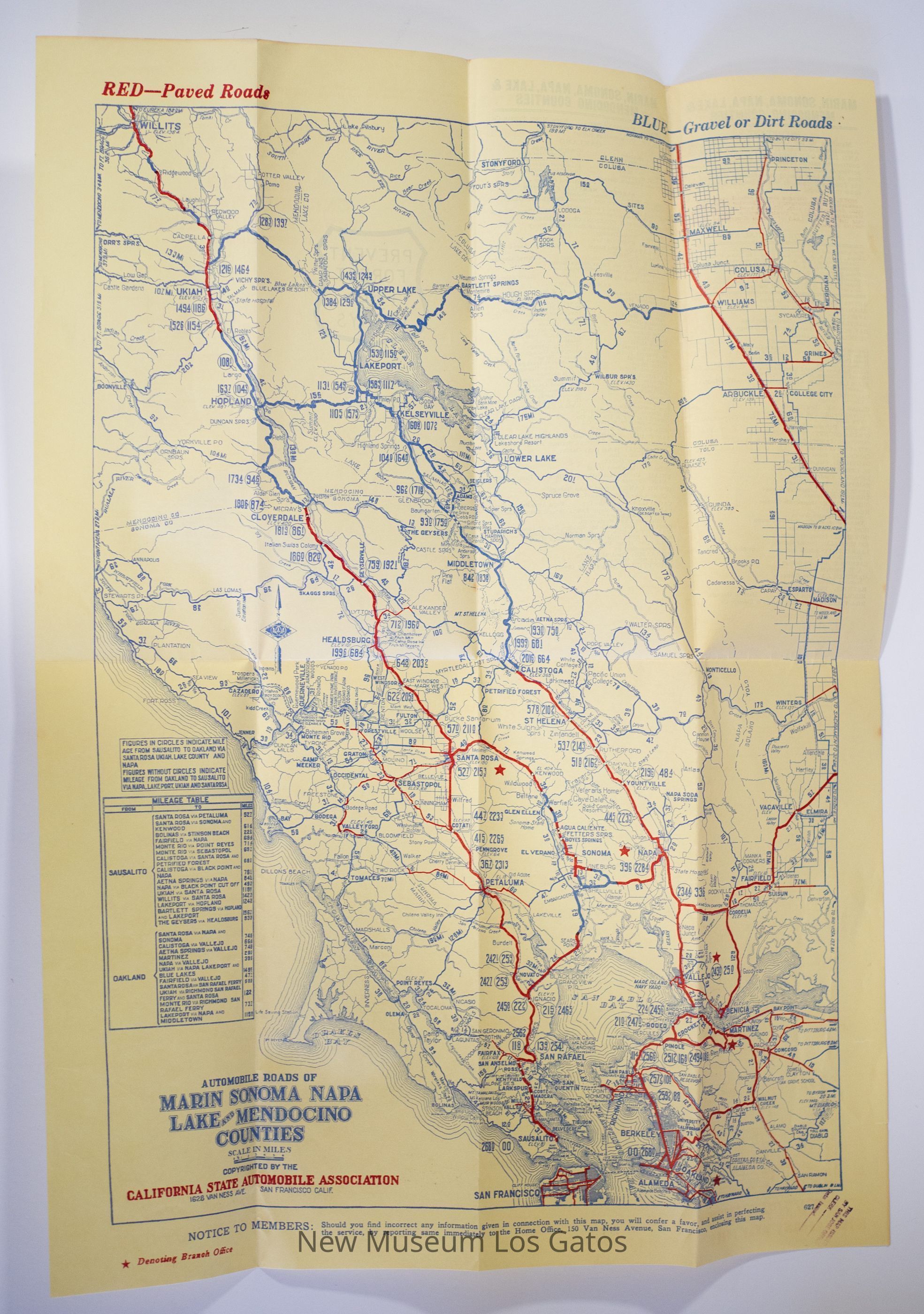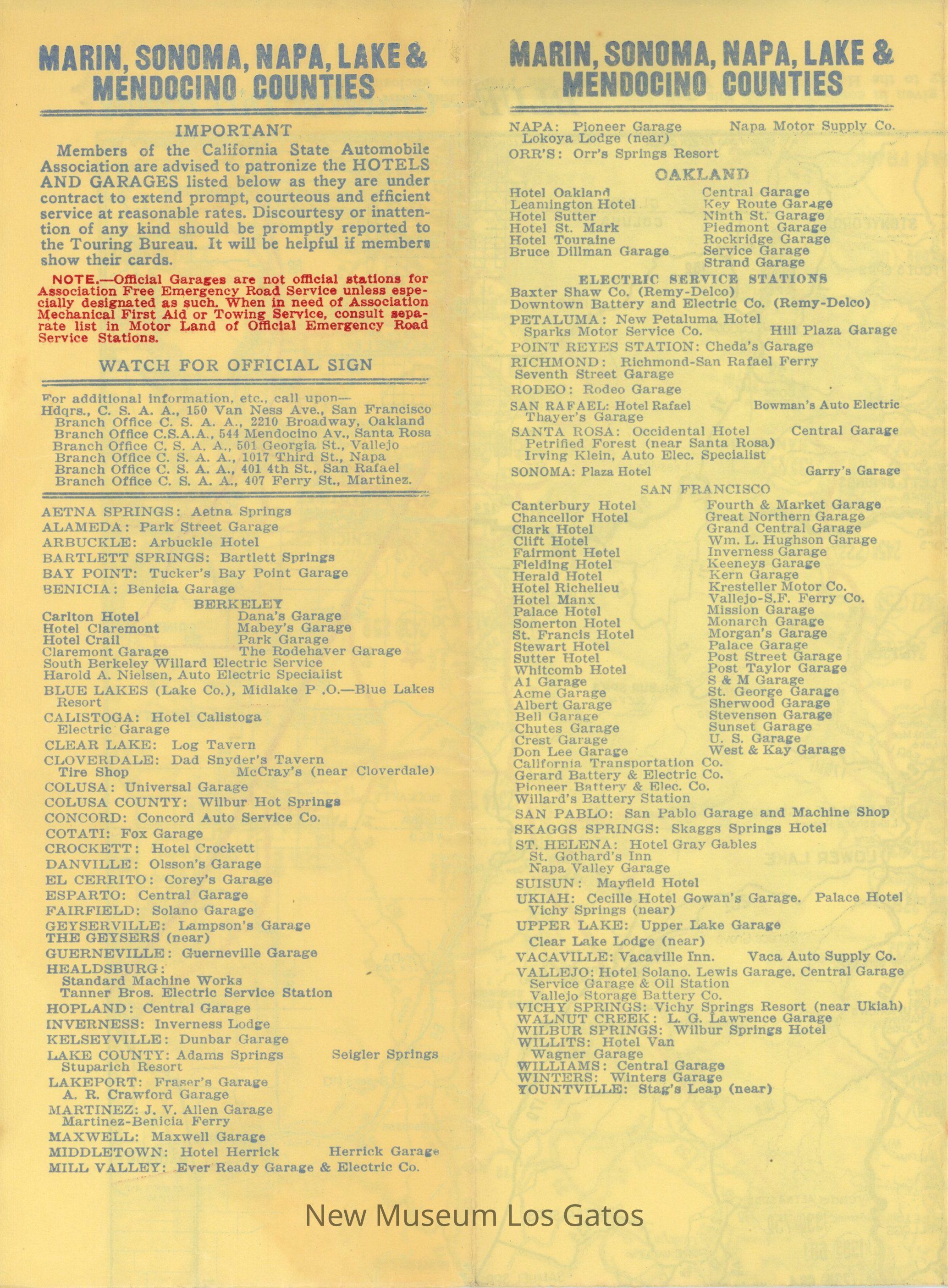 A foldable map, depicting the roads, both paved and unpaved, that are in Marin, Sonoma, Napa, Lake, and Mendocino counties. There is also information about approved service stations in those areas, as well as hotels to stay in.Collection
