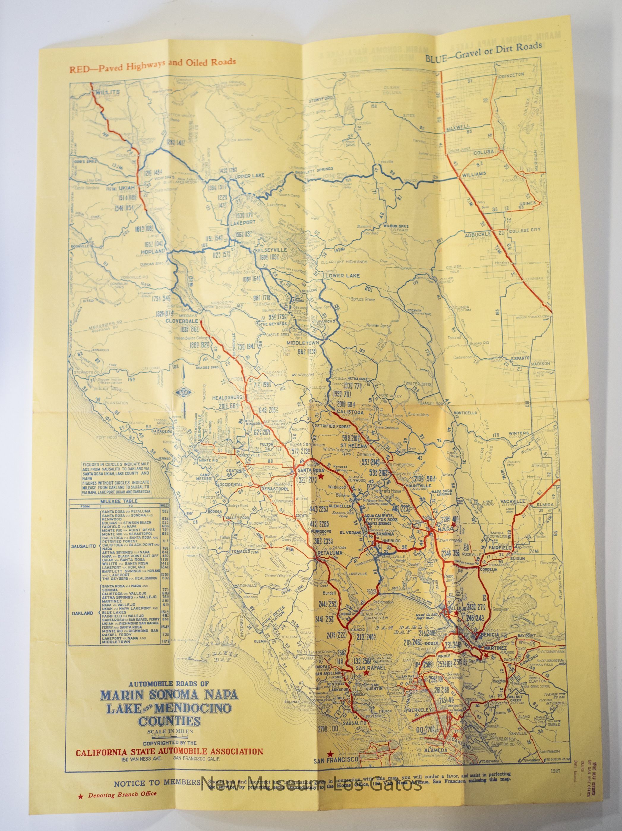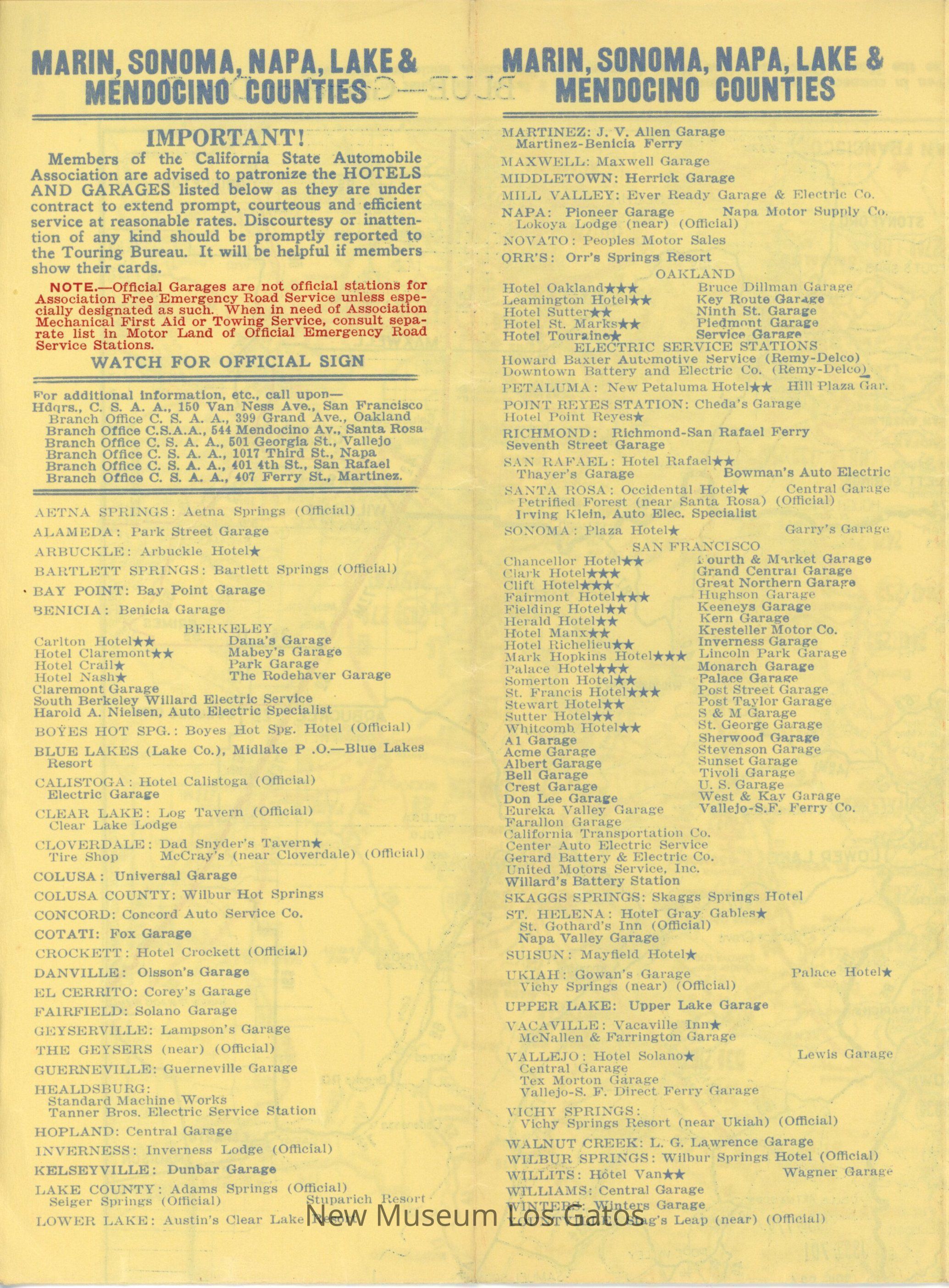 A foldable map, depicting the highways and roads, both paved and unpaved, that are in Marin, Sonoma, Napa, Lake, and Mendocino counties. There is also information about approved service stations in those areas, as well as approved hotels to stay in.Collection