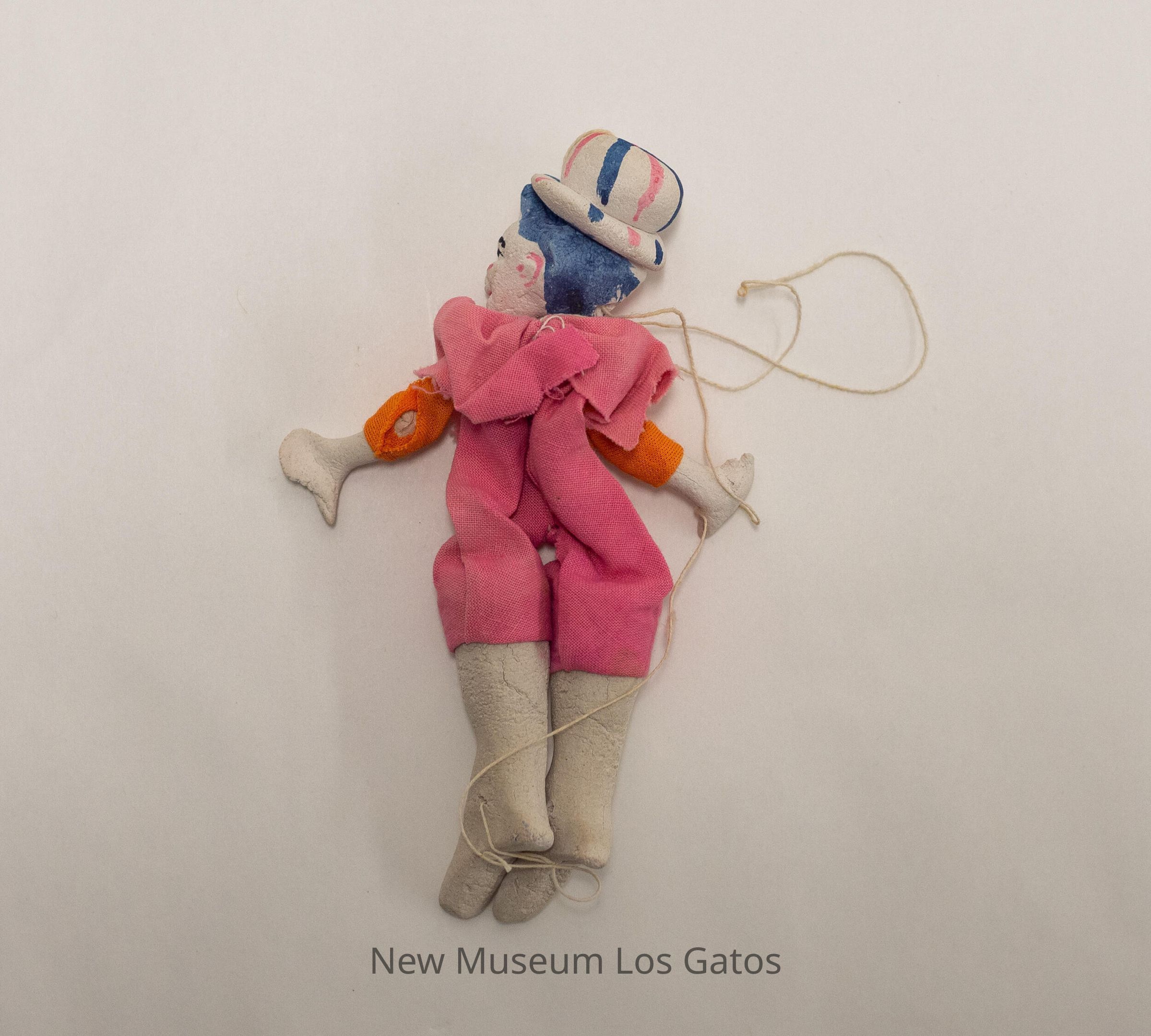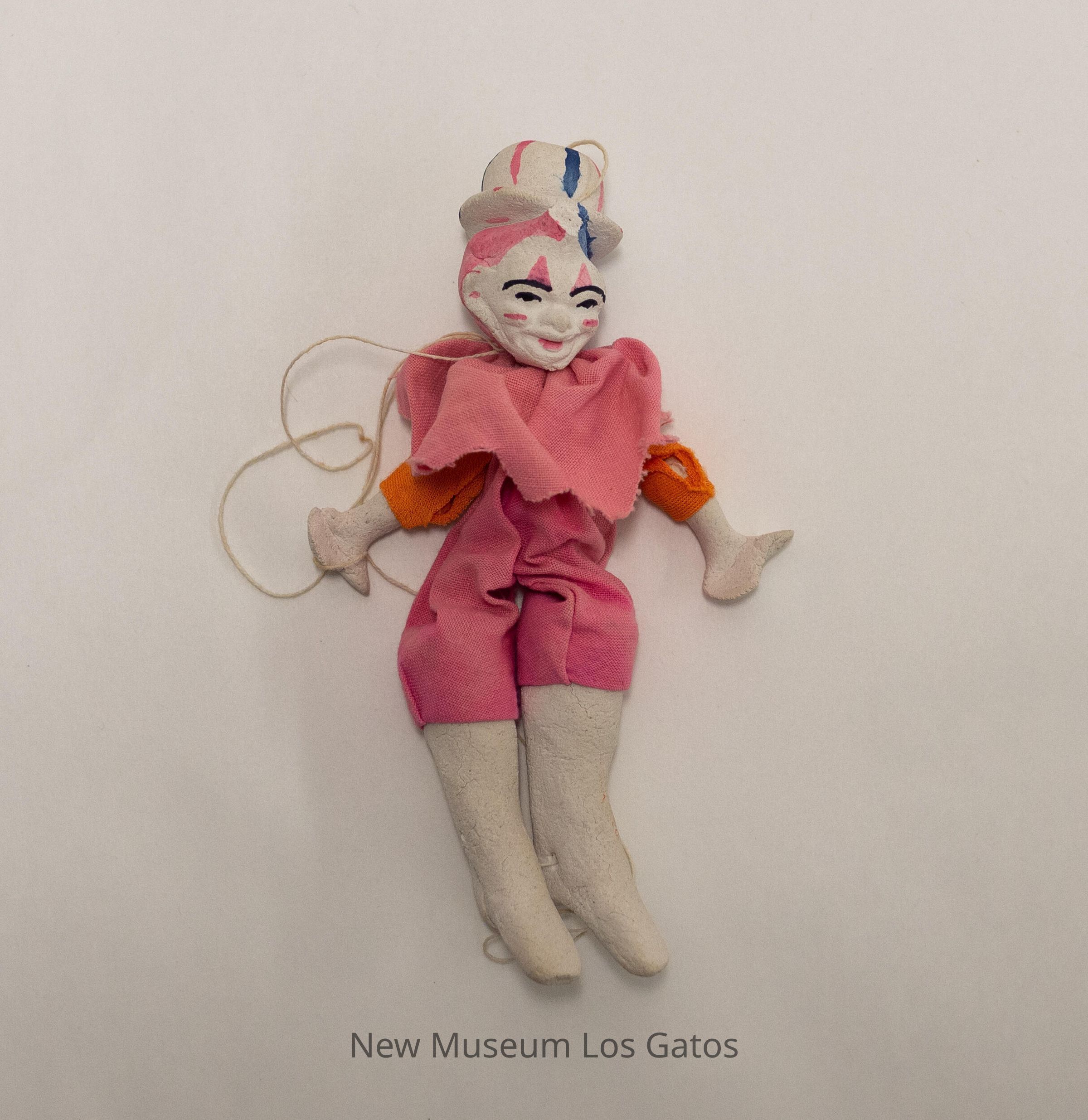 A small marionette. The marionette has white clay arms, legs, and head, and is wearing a bright pink romper with a large ruffle/cuff at the neck. The sleeves are bright orange. The marionette's face is painted on, and has black eyes and eyebrows, and a pink mouth. There are pink lines on each cheek, and pink triangles above each eyebrow. The marionette's hair is blue on the (viewer's) right side, and pink on the left. The marionette is wearing a white clay hat that is painted with blue and pink lines on the top portion. The marionette's legs and head are attached to each other via white string. The head is completely detached from the body, but it is unclear if that is intentional, or damage.Collection